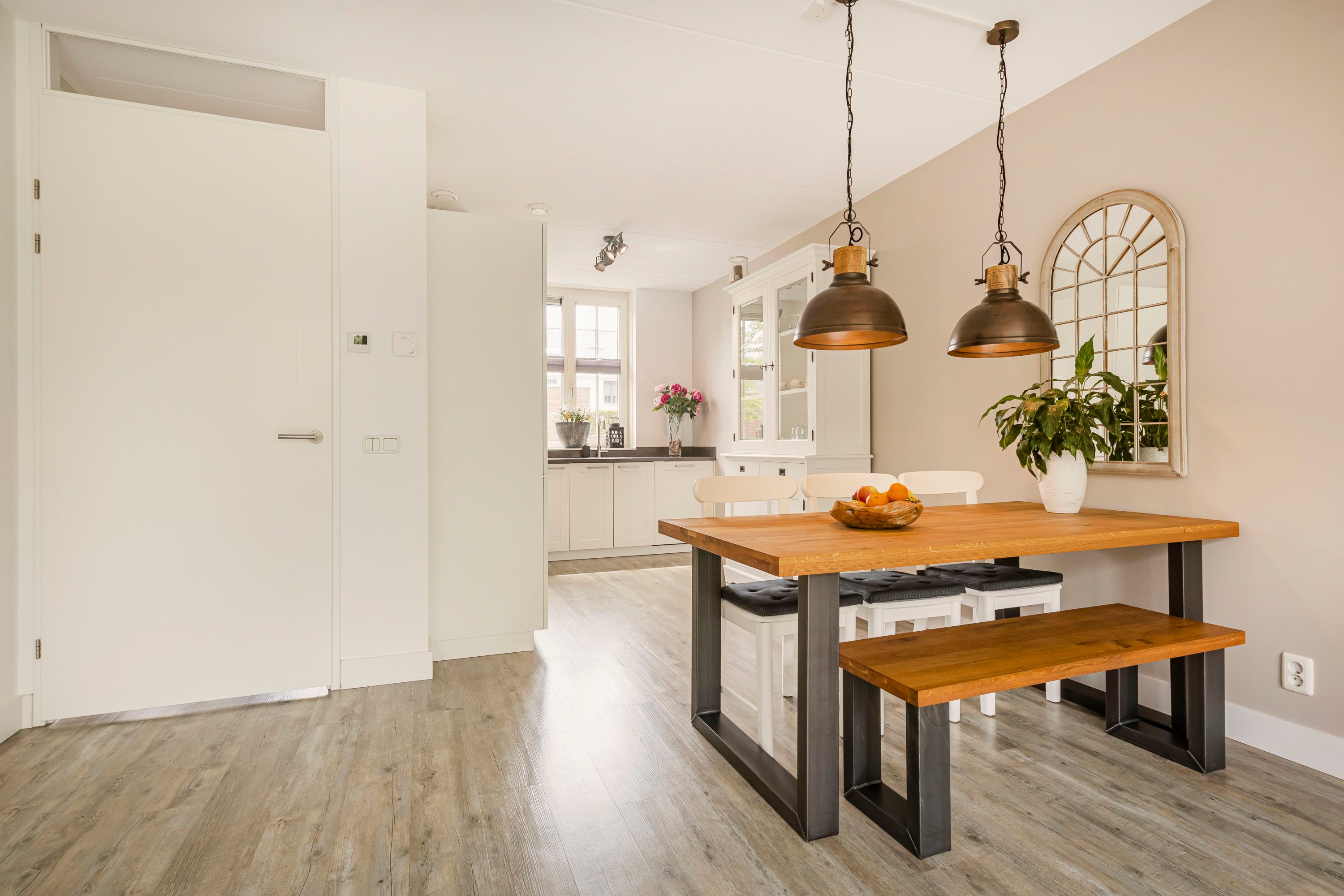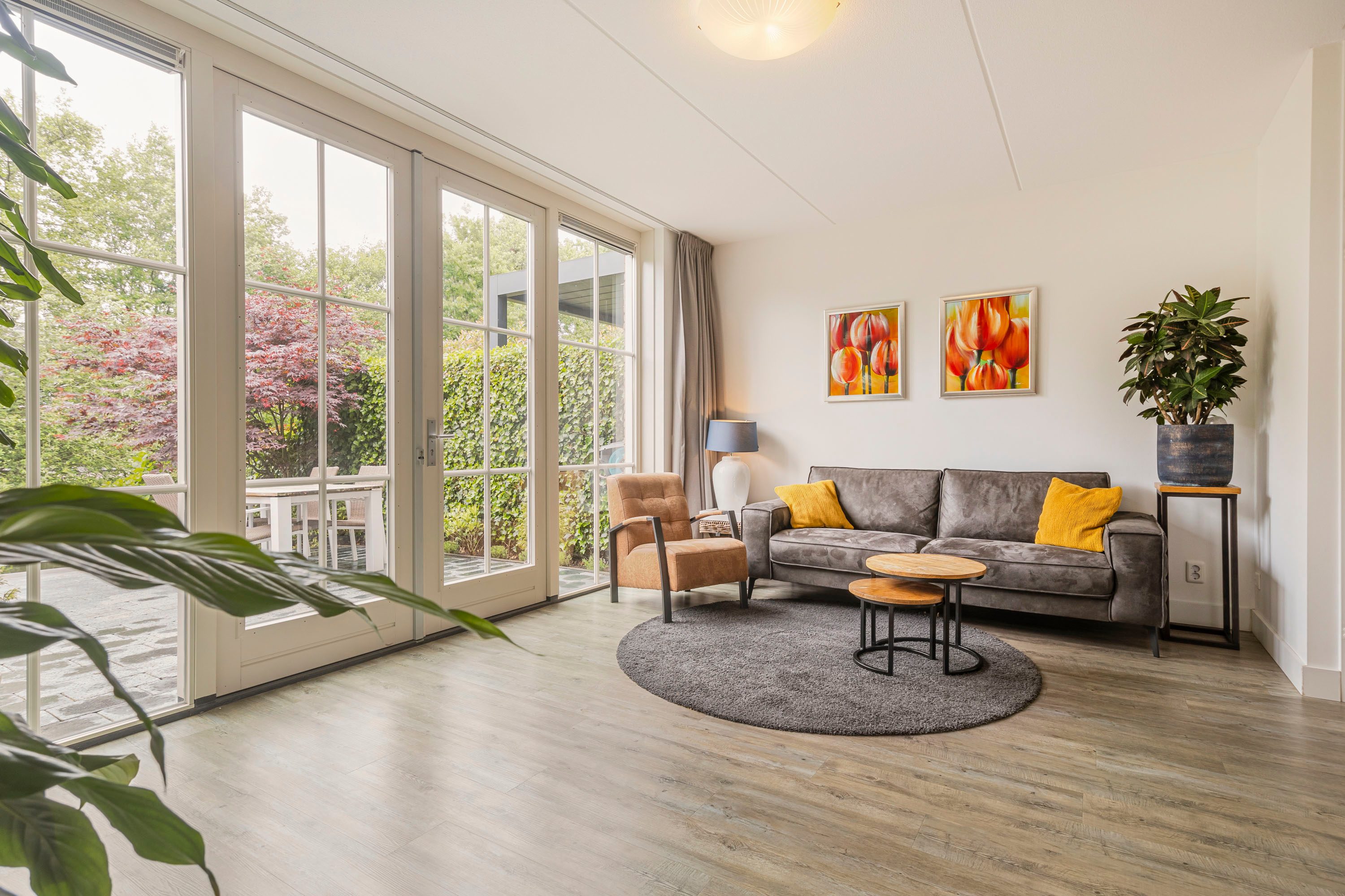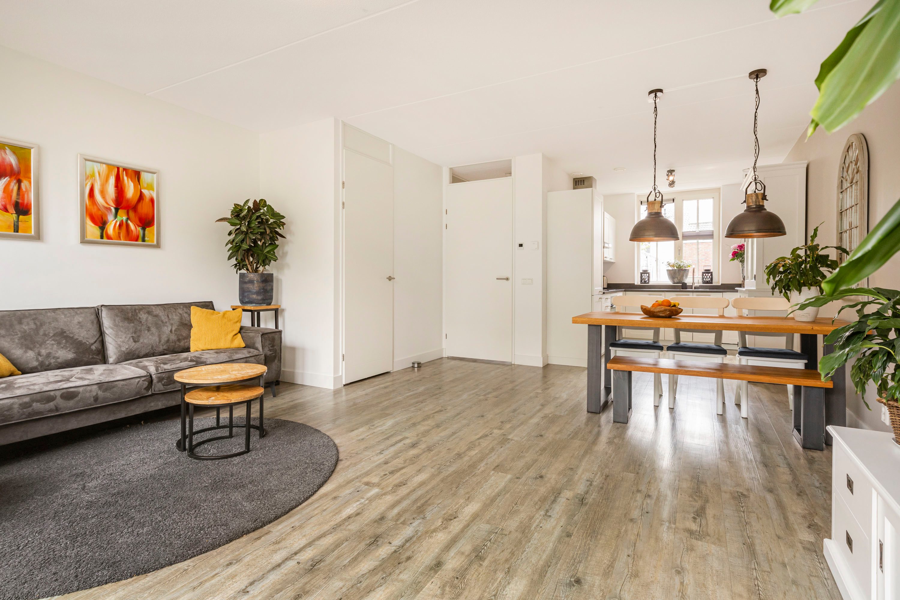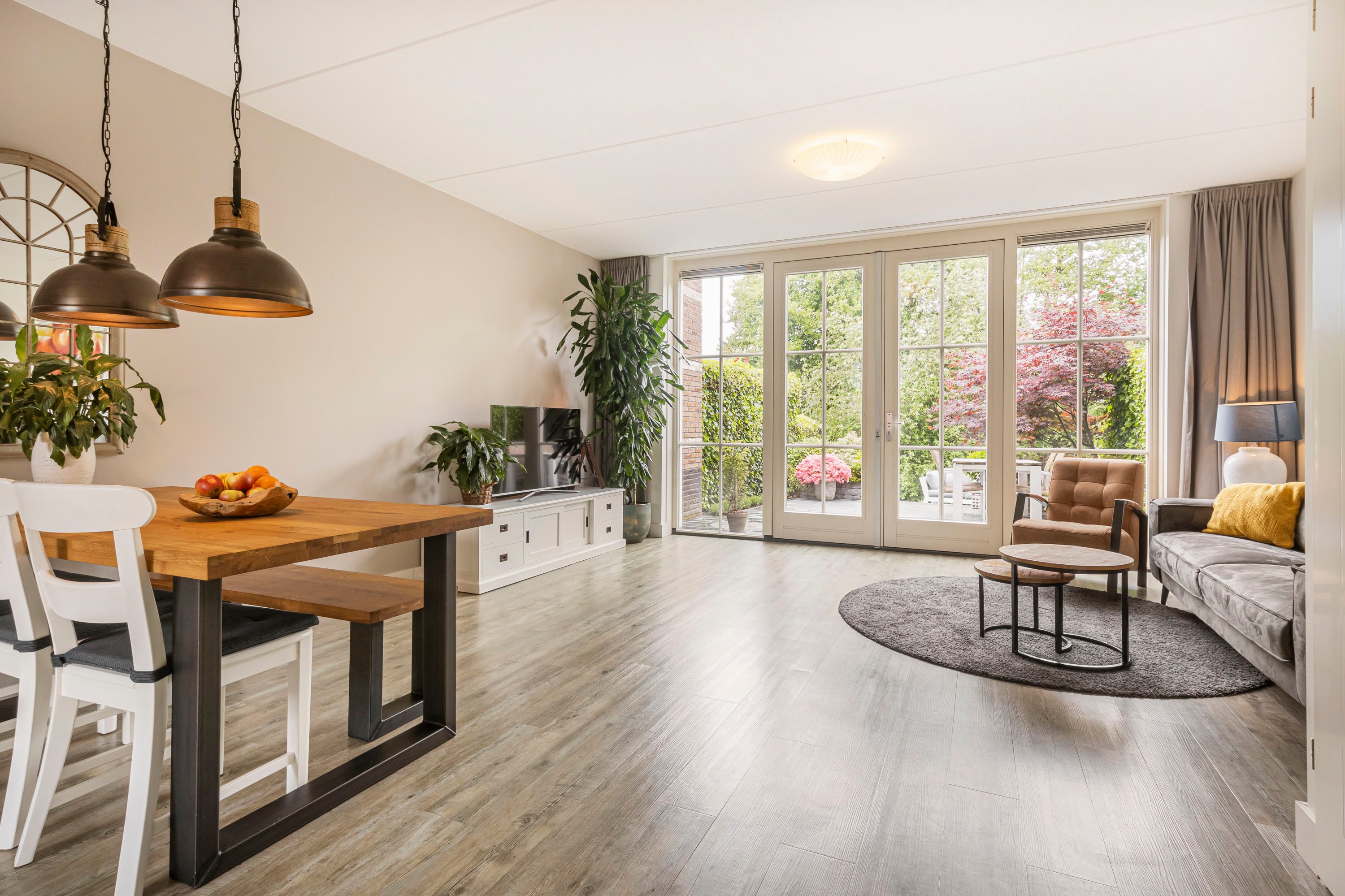 De ruime woonkamer heeft een fijne lichtinval door de grote raampartijen. De woonkamer beschikt over openslaande deuren naar de diepe achtertuin. De wanden zijn afgewerkt met renovlies wandafwerking en de vloer is voorzien van een PVC-vloer en vloerverwarming.