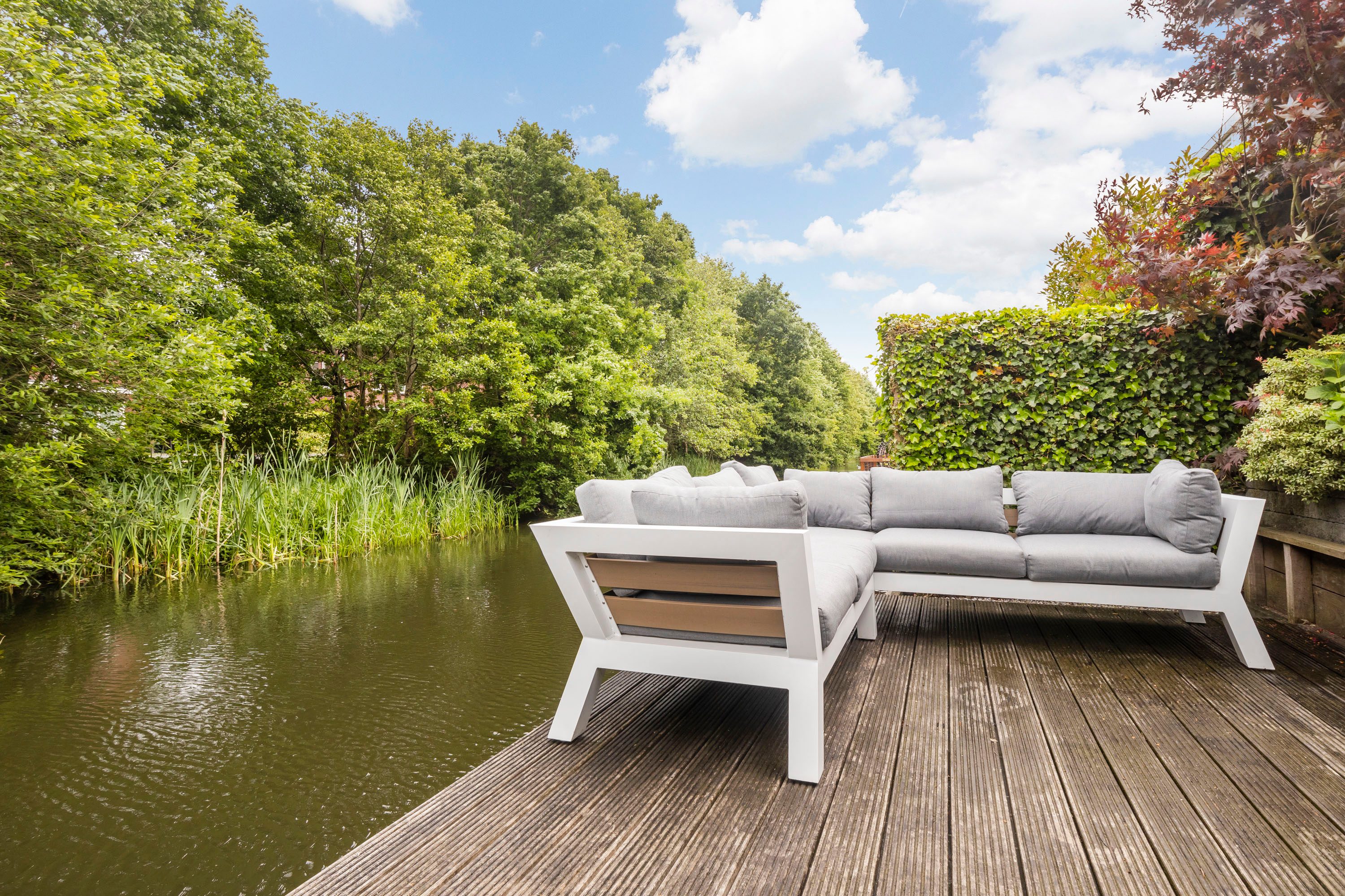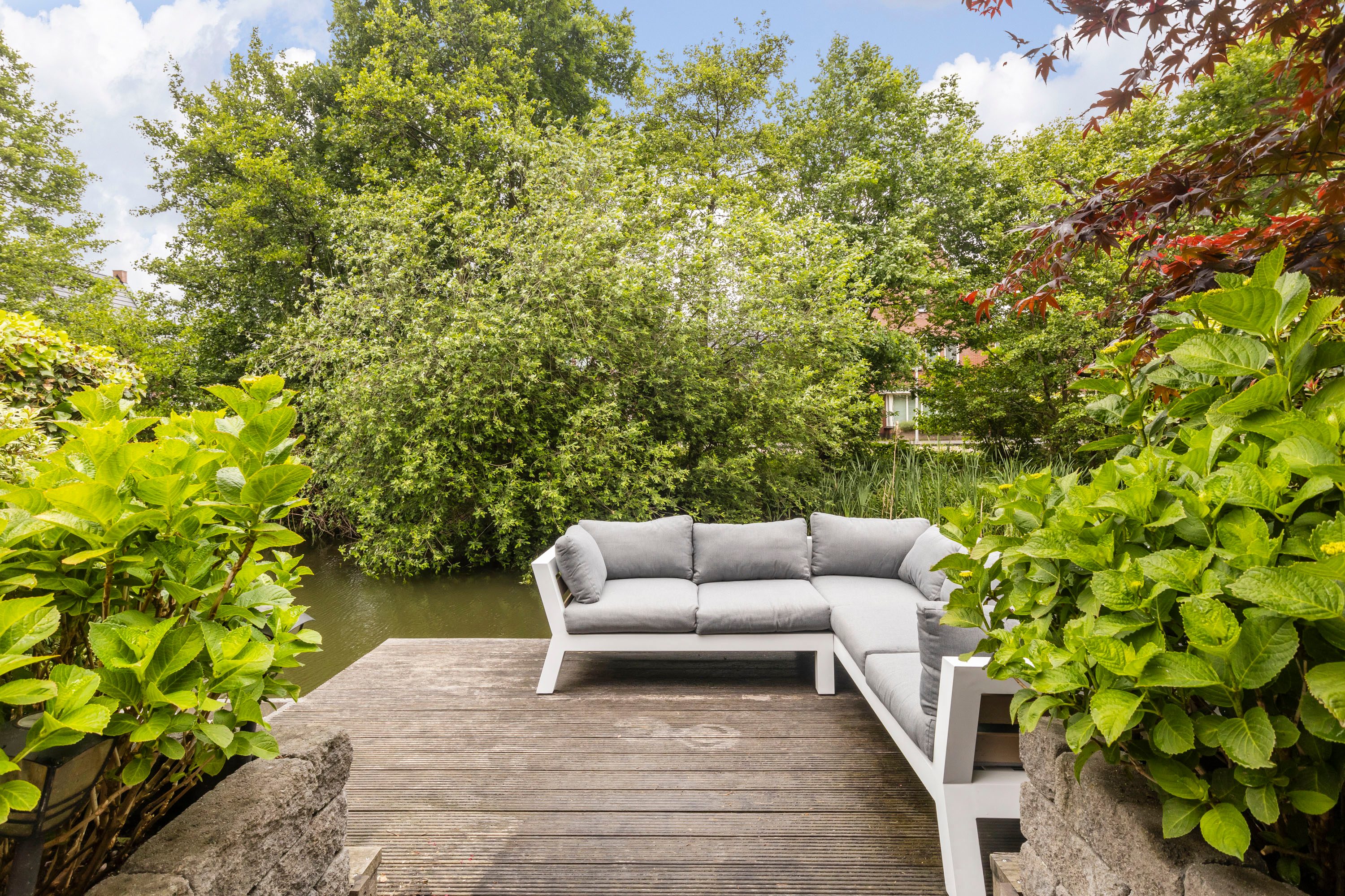 Groen, dat is wat deze tuin kenmerkt. De tuin biedt veel privacy en ruimte door het vrije zicht aan de achterzijde. De aanwezigheid van water zorgt voor een ontspannen en rustgevende sfeer. Er is een terras (vlonder) direct aan het water, ideaal om te genieten van een kopje koffie in de ochtendzon of een glas wijn in de avond. Daarnaast is er voldoende ruimte voor een tuinset en een barbecue.