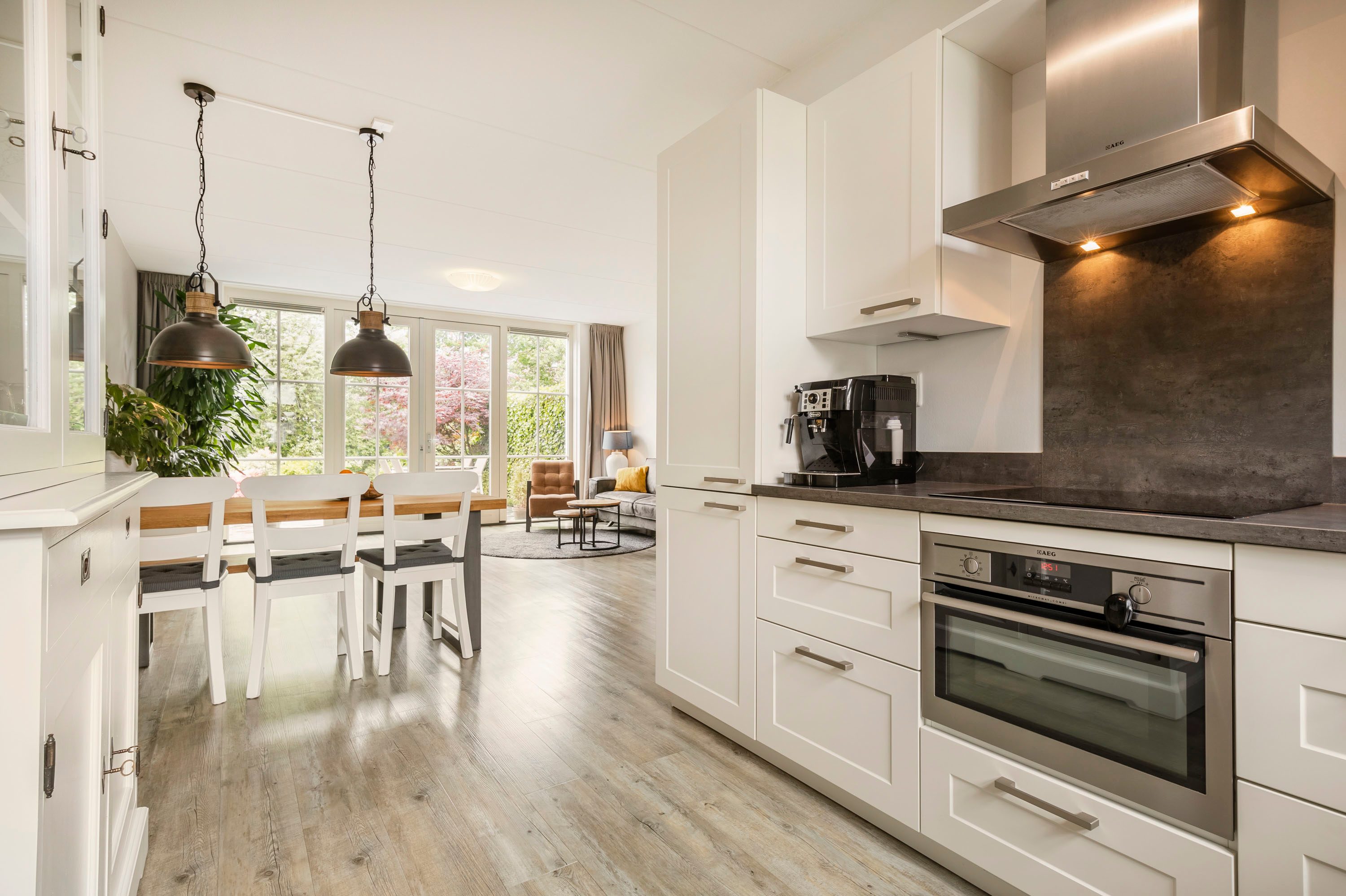 De keuken is aan de voorzijde van de woning gelegen. De hoekopstelling zorgt voor veel praktische ruimte en de volgende inbouwapparatuur is aanwezig: combi-oven/magnetron, afzuigkap, inductiekookplaat, koel-vriescombinatie, vaatwasser.