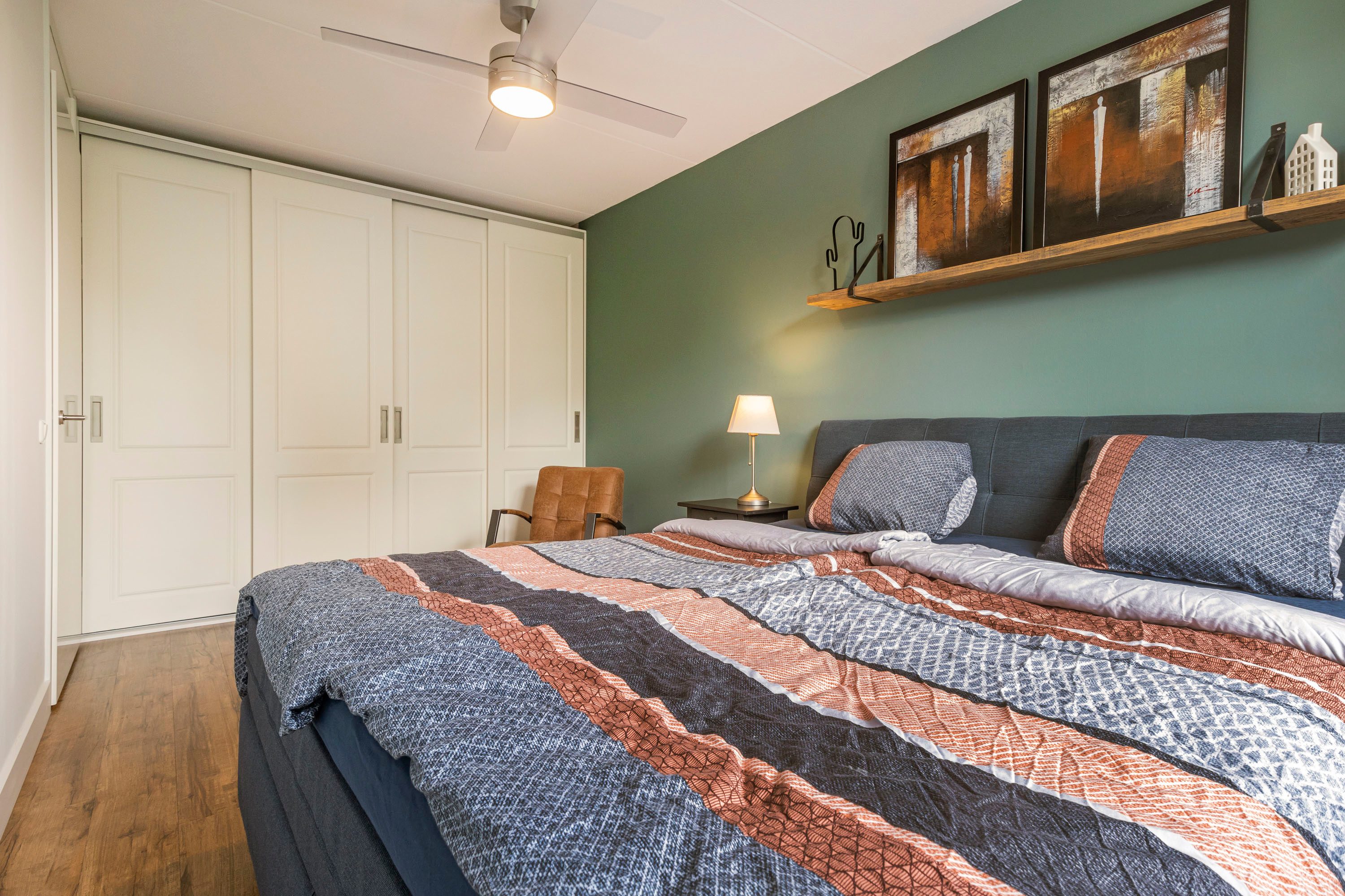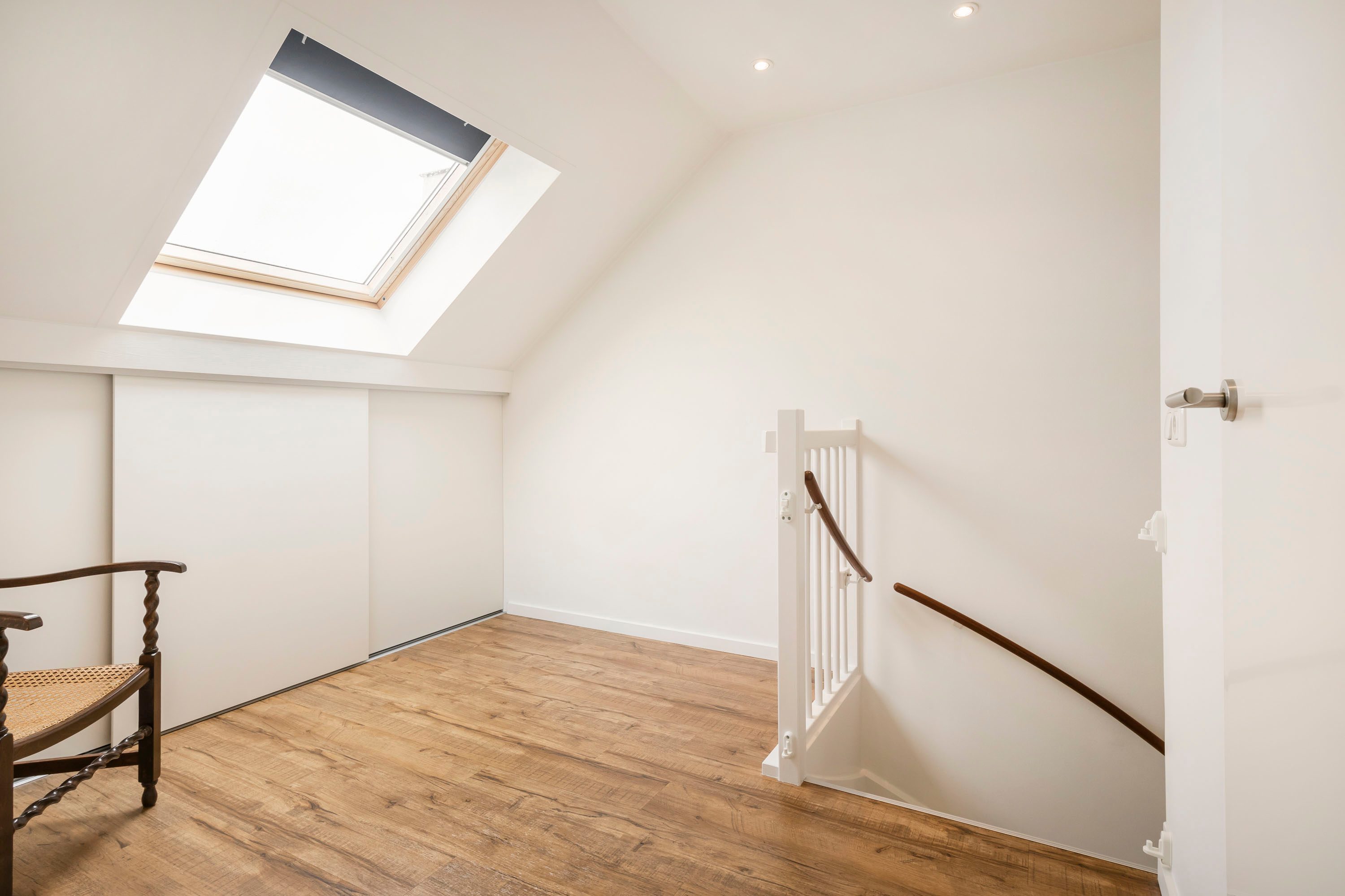Deze verdieping is eveneens voorzien van vloerverwarming. De afwerking is keurig, met inbouwspots, stucwerk en een PVC-vloer. Op de overloop is een extra dakraam geplaatst voor extra daglicht.