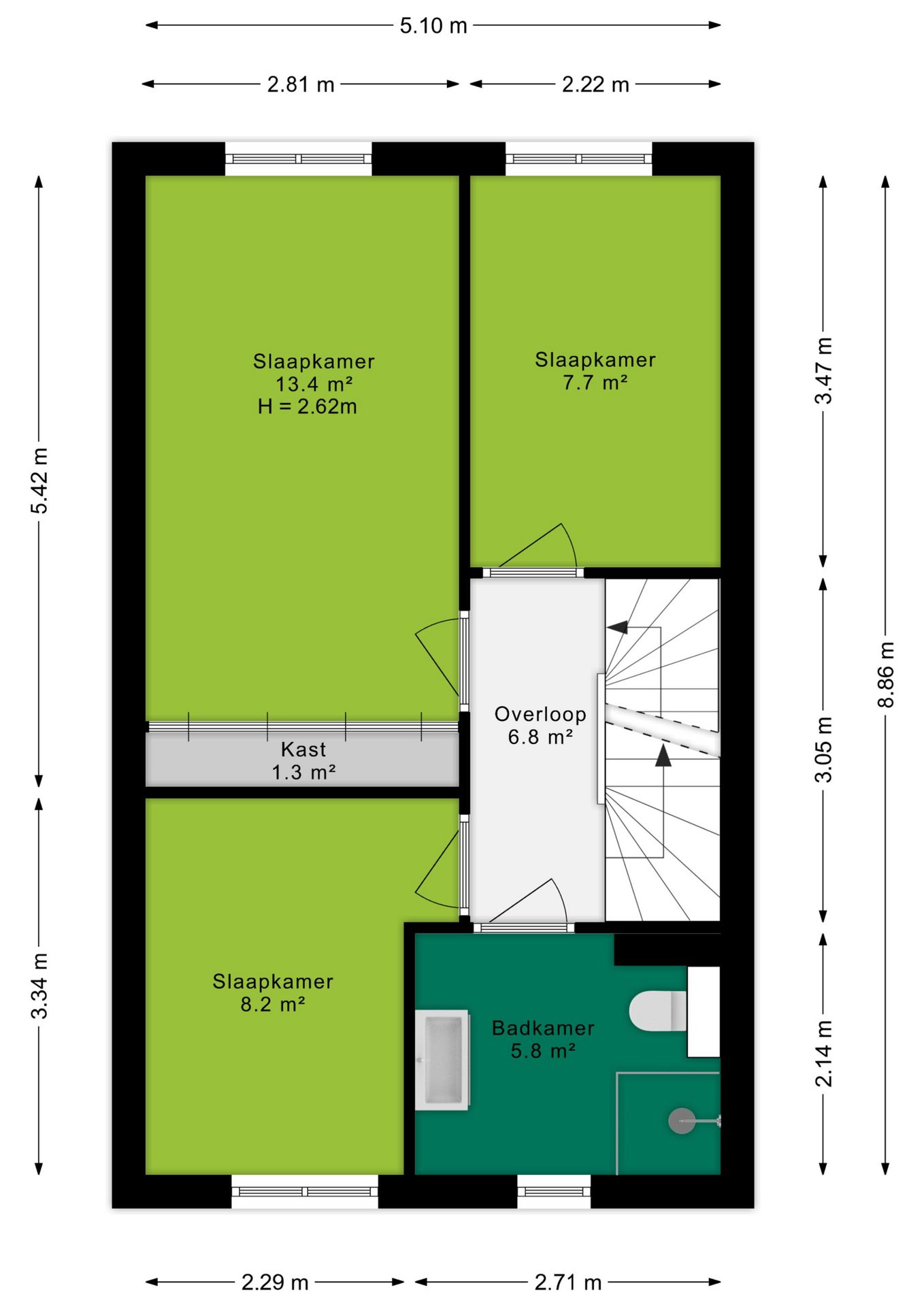 Op de eerste verdieping kom je uit op de overloop. Vanuit daar heb je toegang tot drie slaapkamers. Twee slaapkamers bevinden zich aan de achterzijde van de woning en één aan de voorzijde. Daarnaast is er een badkamer aanwezig. De badkamer is voorzien van: tweede toilet, douche en wastafel met meubel. De gehele eerste verdieping is eveneens voorzien van vloerverwarming.