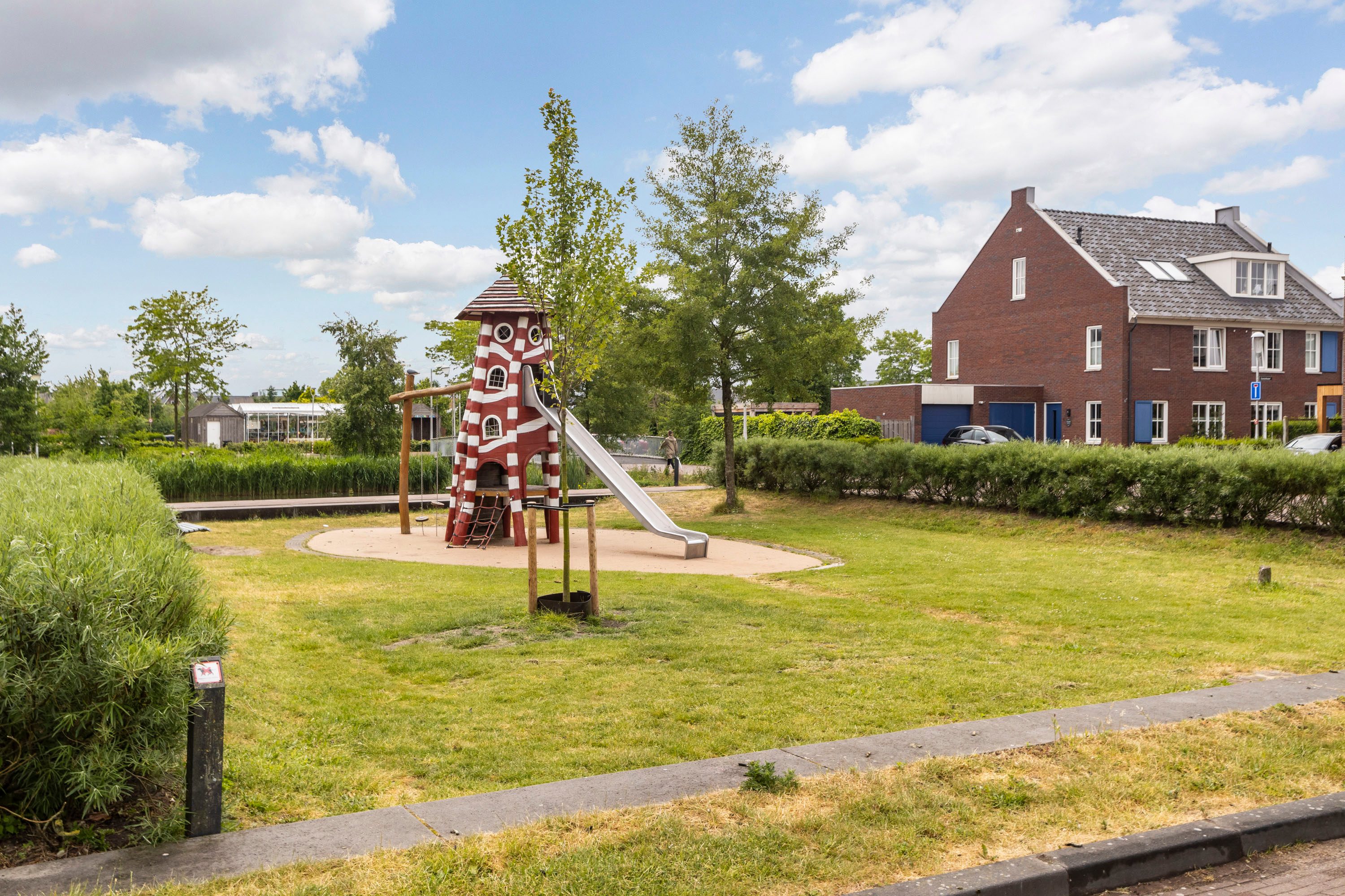 De tuin grenst aan de achterzijde direct aan het water. Het gezamenlijke speelveld met een leuke waterpomp aan de voorzijde en het feit dat dit een autovrij hofje is, maken dit een ideale locatie.