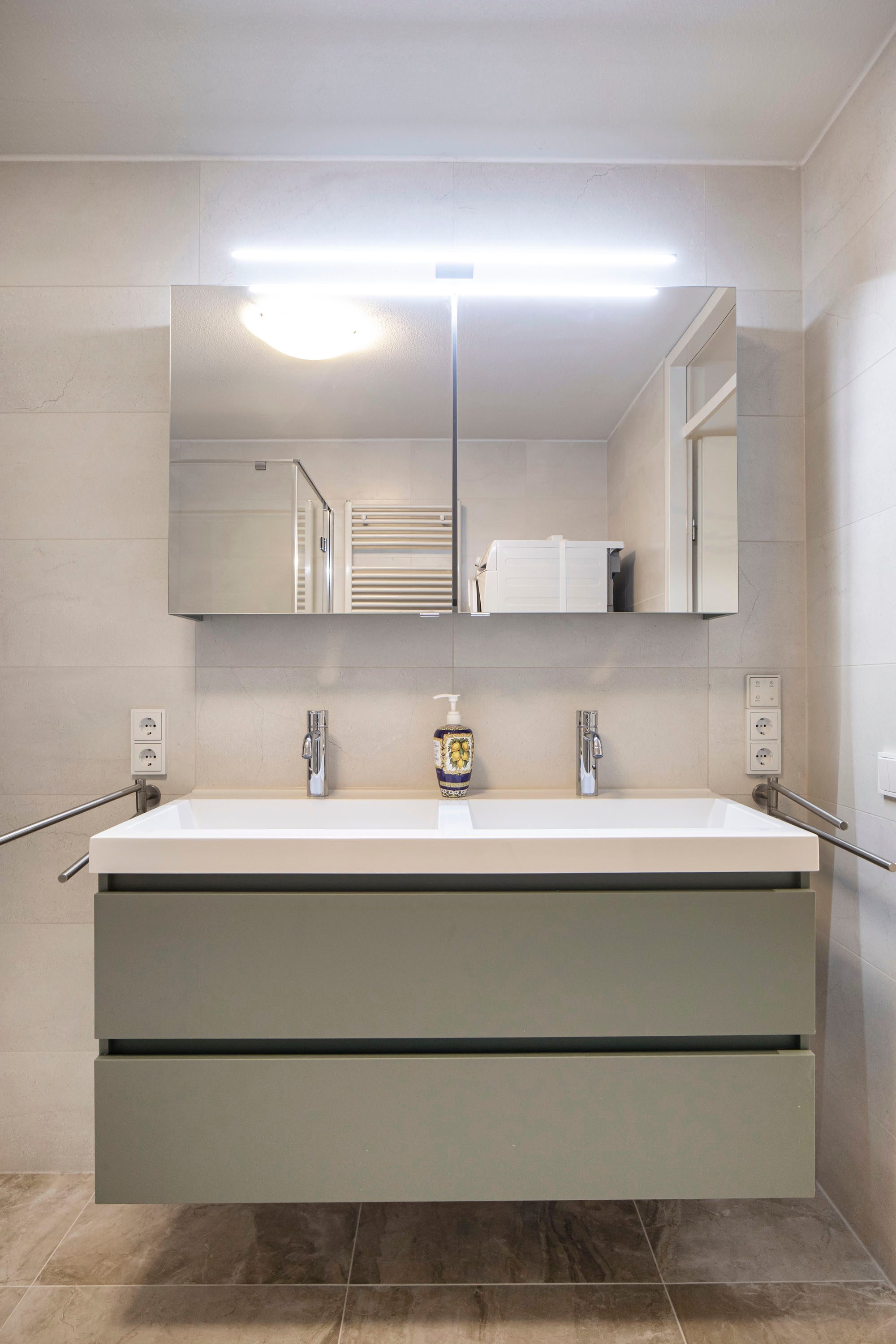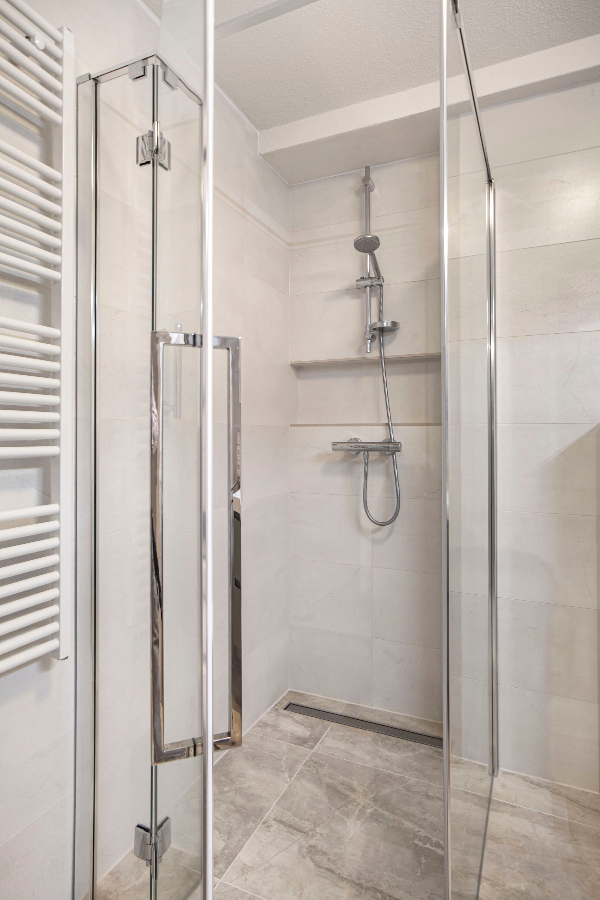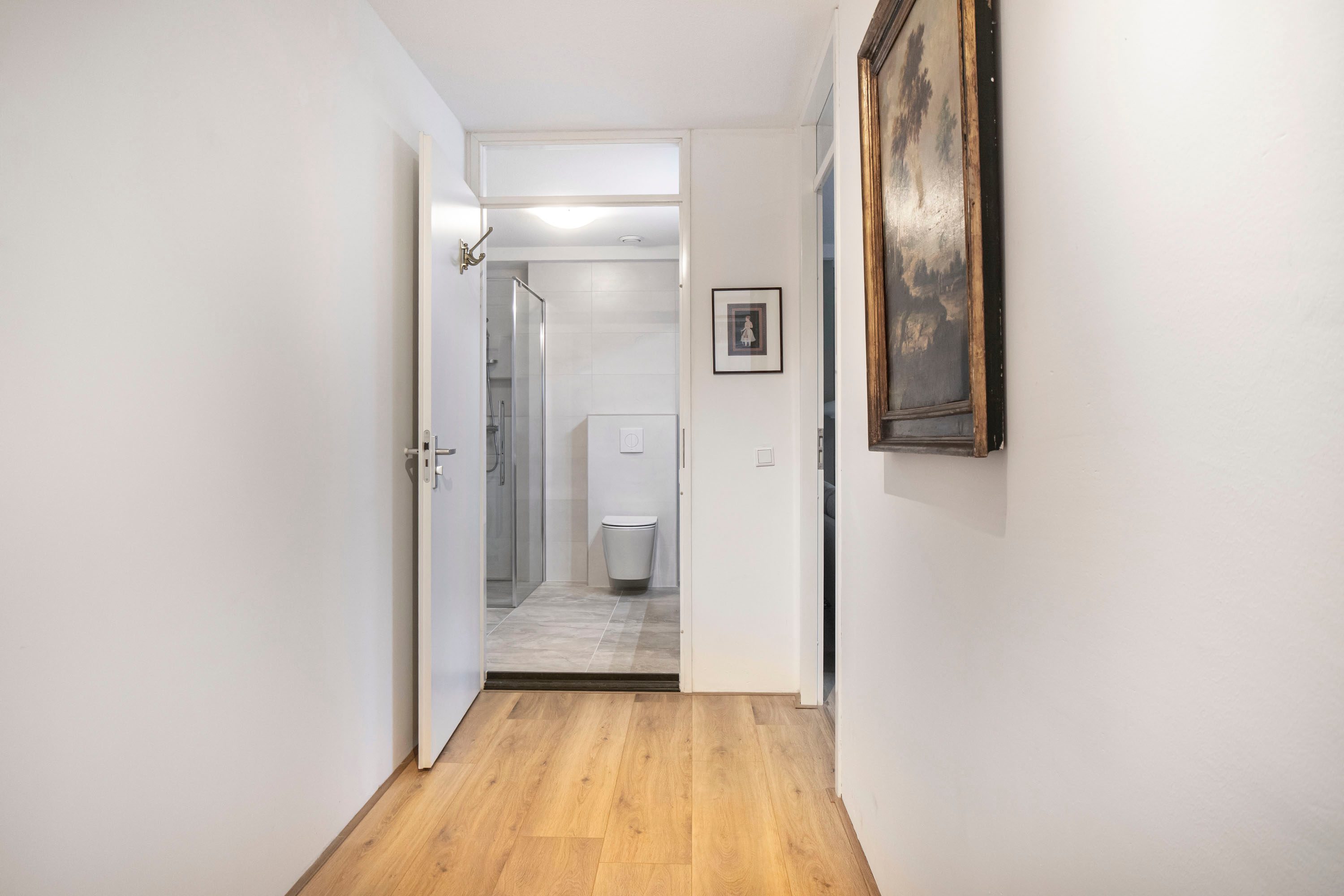 De nieuwe badkamer is compleet uitgevoerd en beschikt over een douche, toilet wastafel en aansluitingen voor wasmachine en droger.