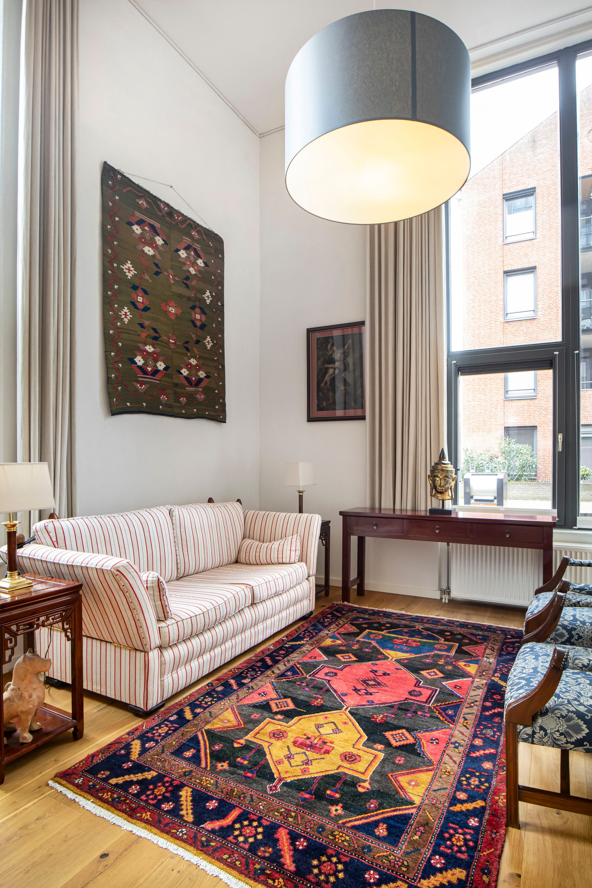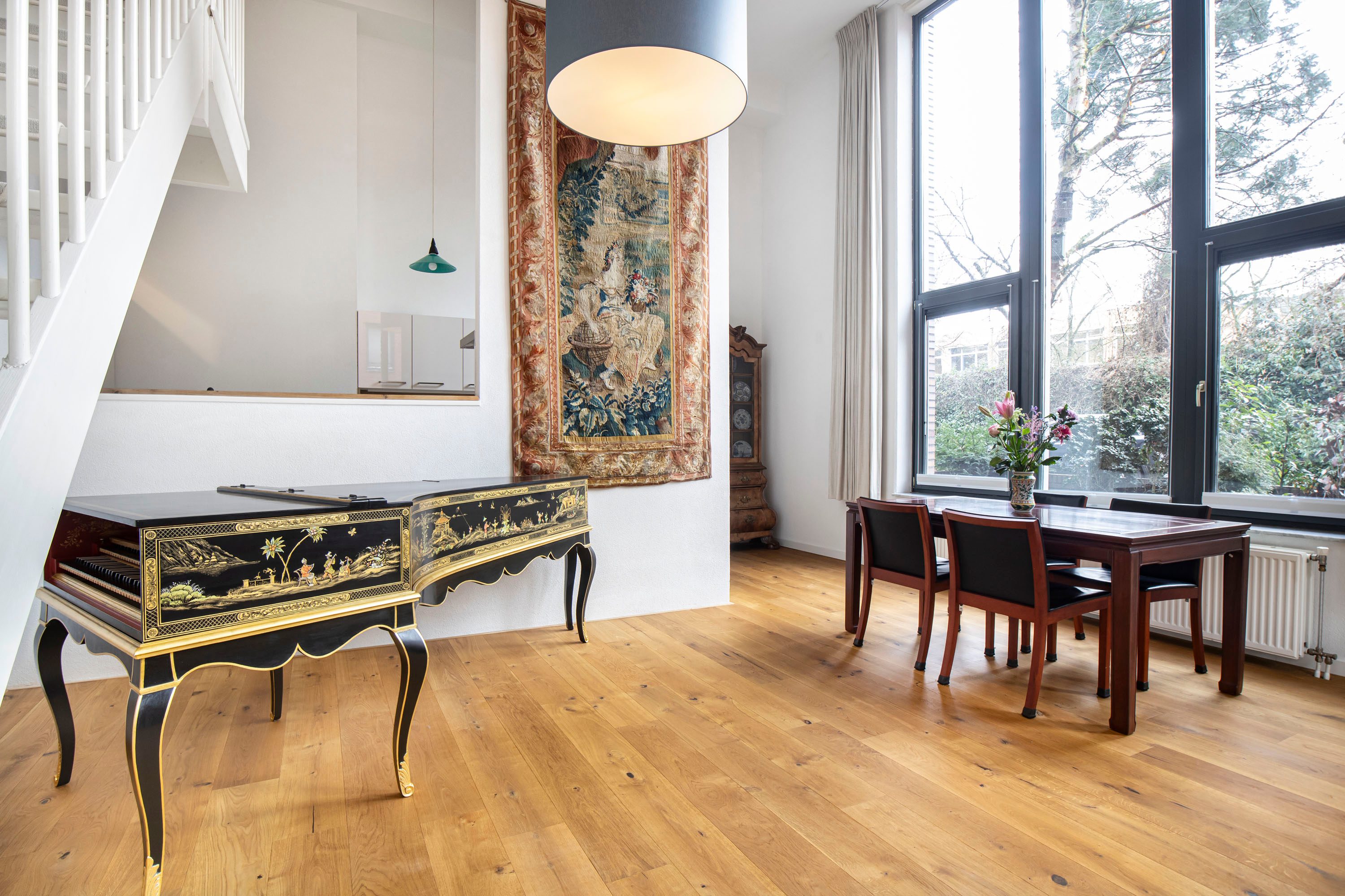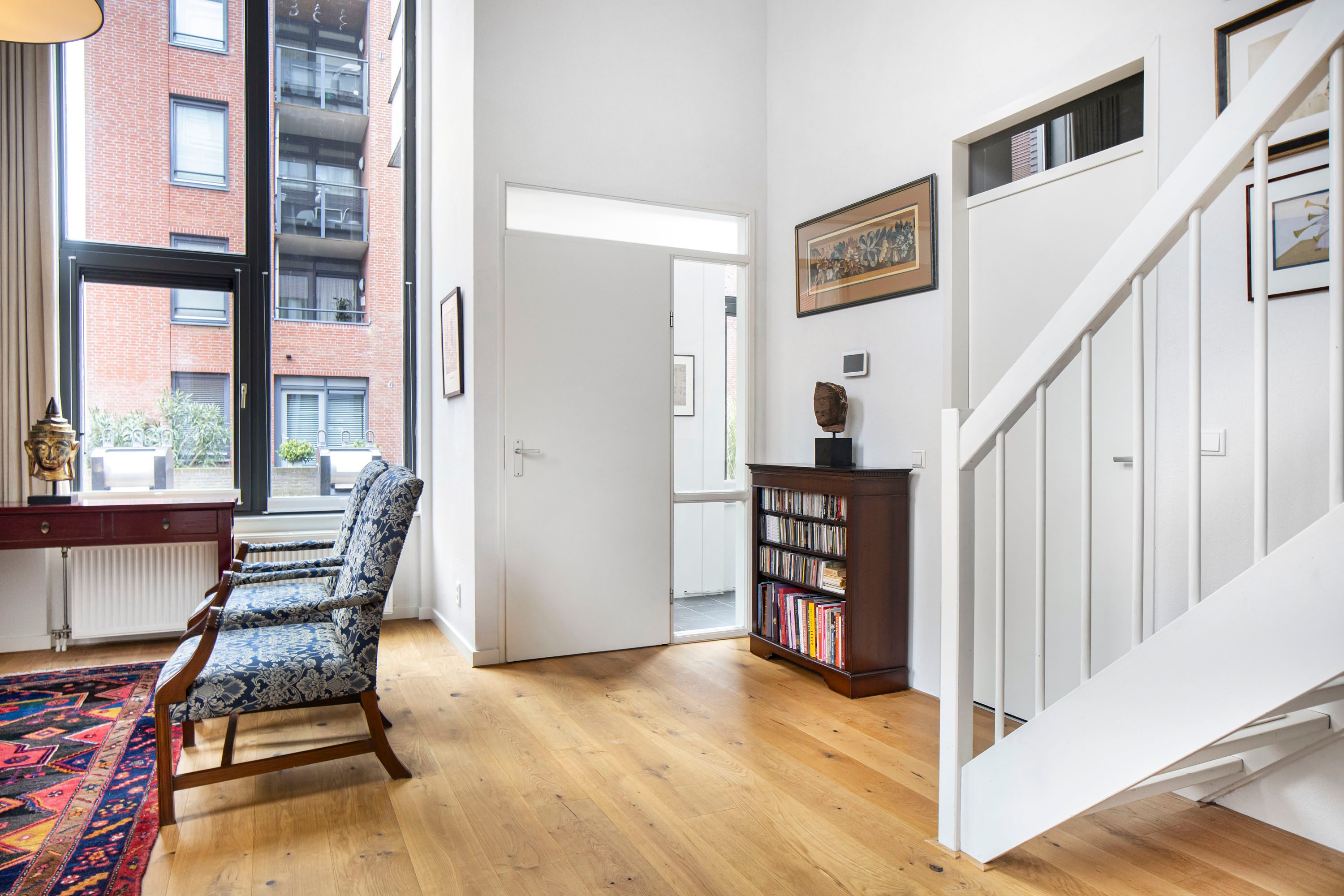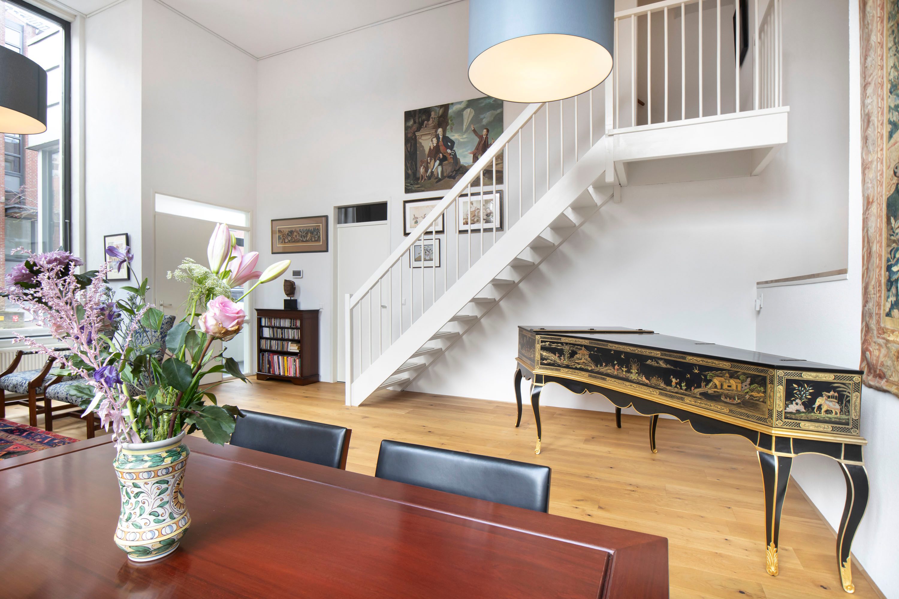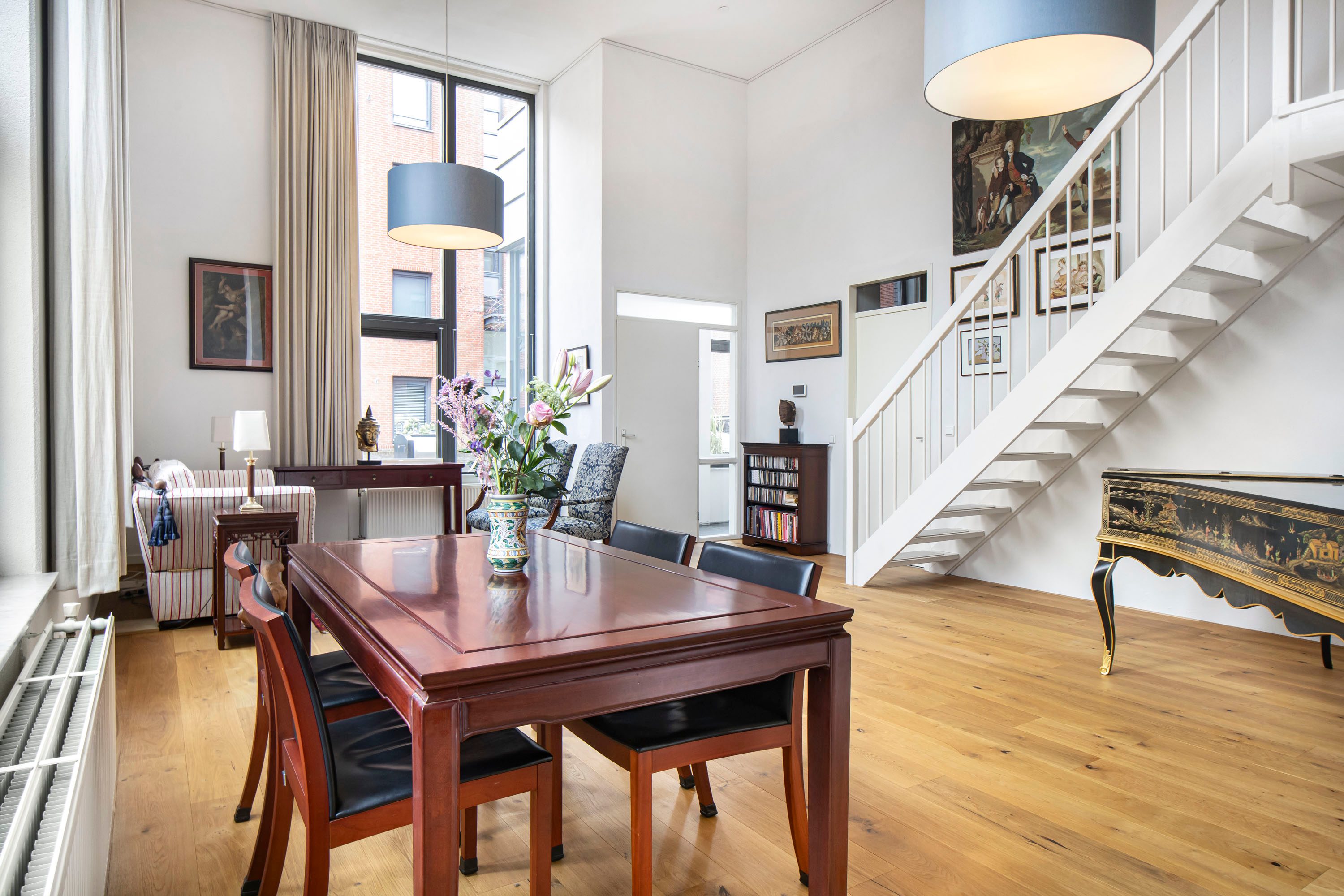 De woonkamer is direct indrukwekkend door het hoge plafond, wat zorgt voor een ruimtelijk gevoel en veel daglicht. De open indeling en vide geven de woning een speels en modern karakter.