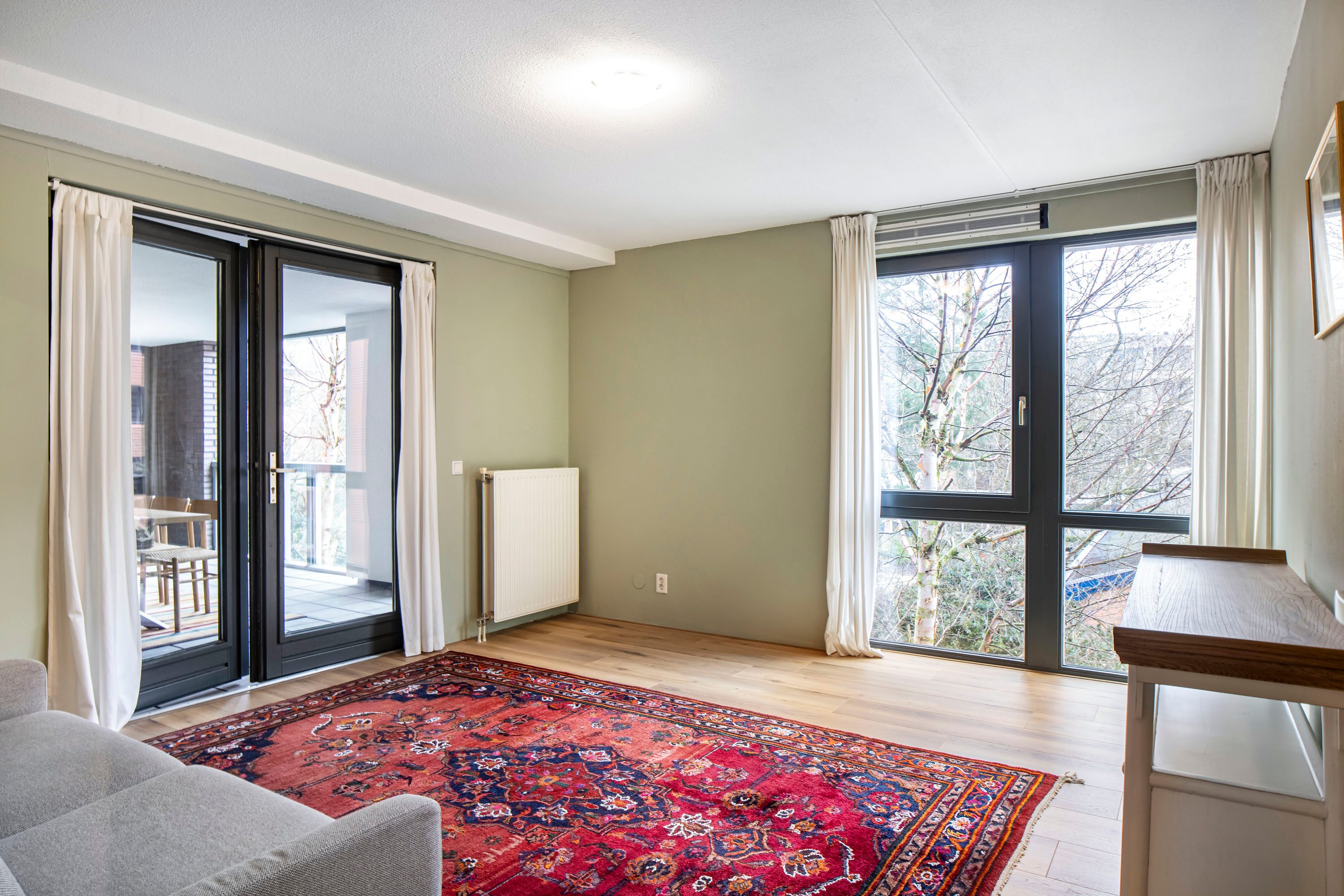 De royale loggia is een fijne en beschutte plek waar je het hele jaar door buiten kunt zitten. De loggia is uitermate geschikt om in alle privacy te kunnen ontspannen, waar je vrienden kunt ontvangen en de kinderen veilig kunnen spelen. Vanuit de loggia heb je via een toegangsdeur direct toegang tot de gemeenschappelijke binnentuin, die exclusief beschikbaar is voor bewoners van het complex. Daarnaast beschikt de woning over de naastgelegen tuin, wat zorgt voor extra buitenruimte.