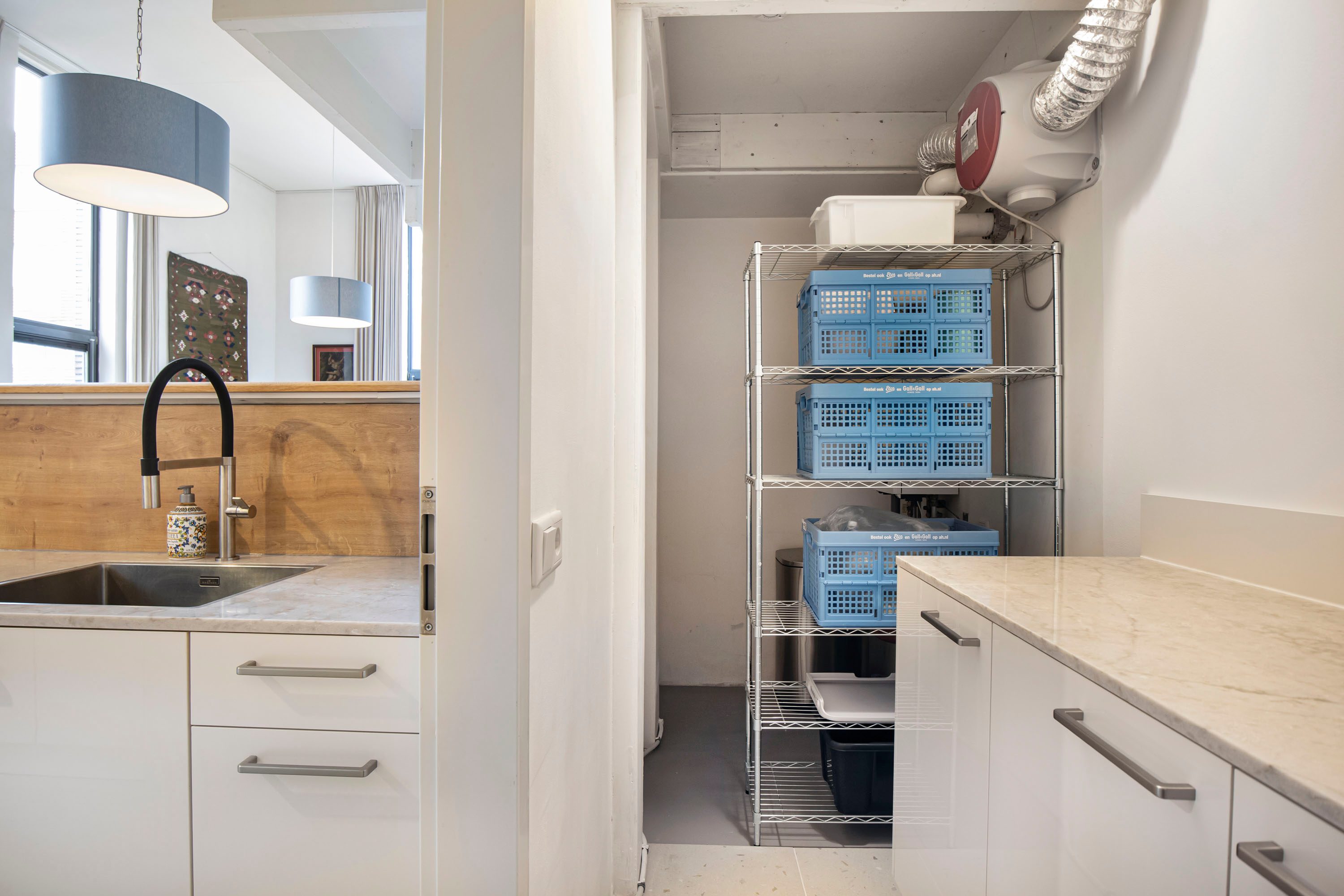 Aan de woonkamer grenst de nieuwe half open keuken (Nolte), die in verbinding staat met een praktische bijkeuken waar de C.V.-ketel is opgesteld. Daarnaast bevindt zich in de woonkamer bij de trapopgang nog een extra provisie-/bergruimte, ideaal voor voorraad of huishoudelijke spullen.