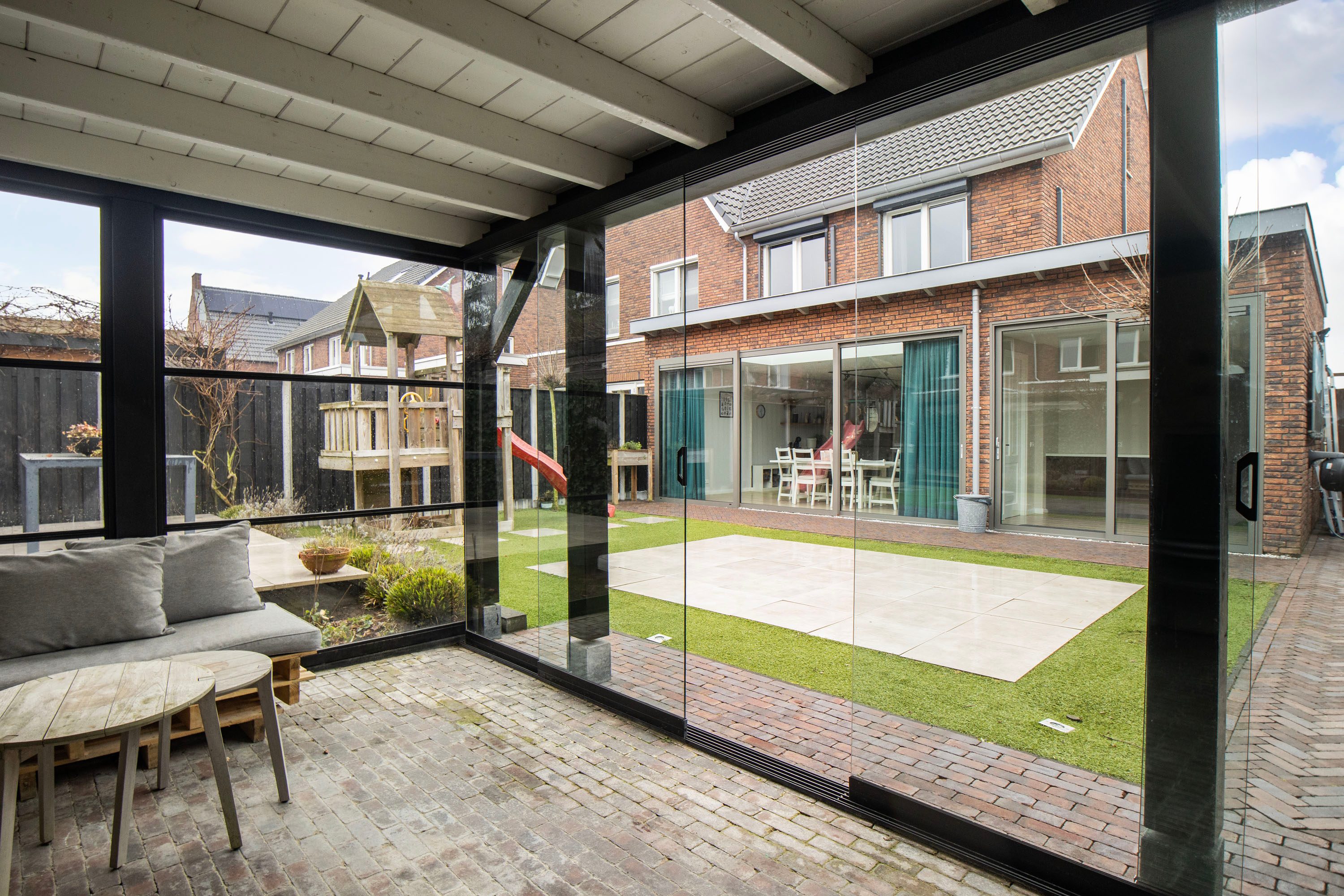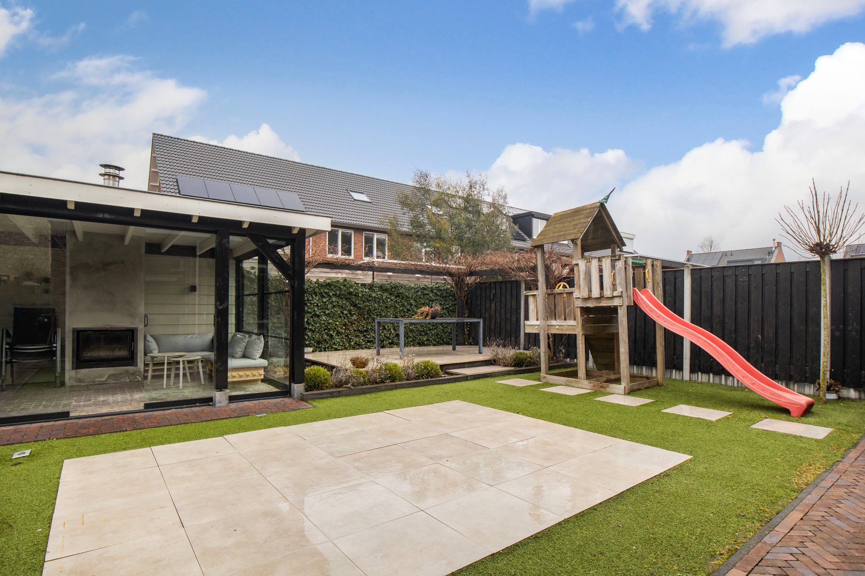 De achtertuin is gelegen op het noorden, maar dankzij de diepte en breedte vind je hier altijd een fijne plek in de zon. De tuin biedt volop ruimte voor spelende kinderen en meerdere zitplekken.