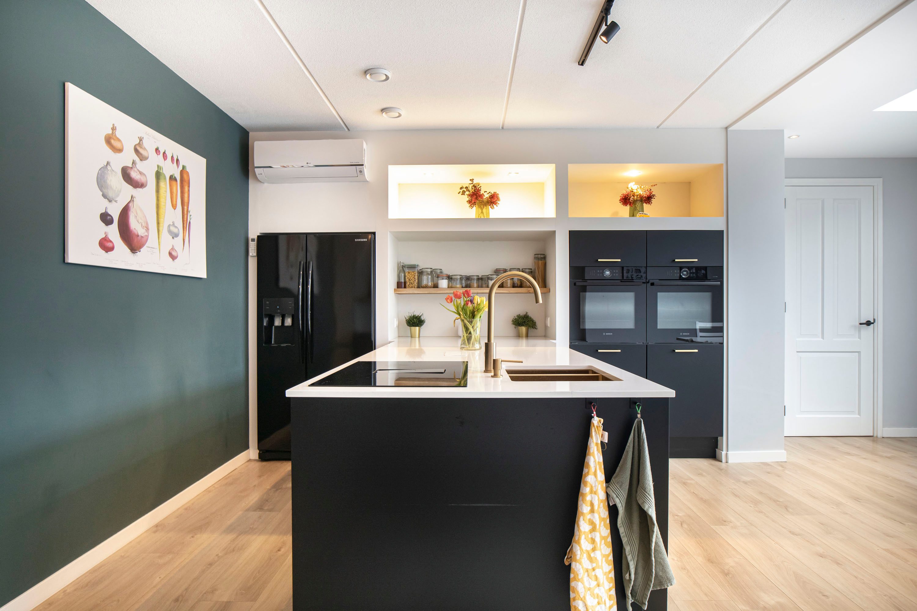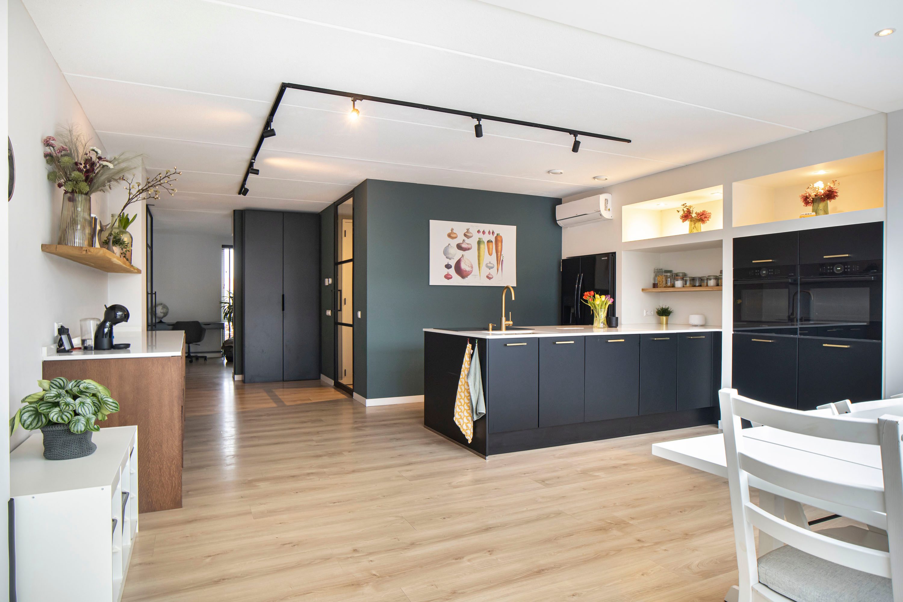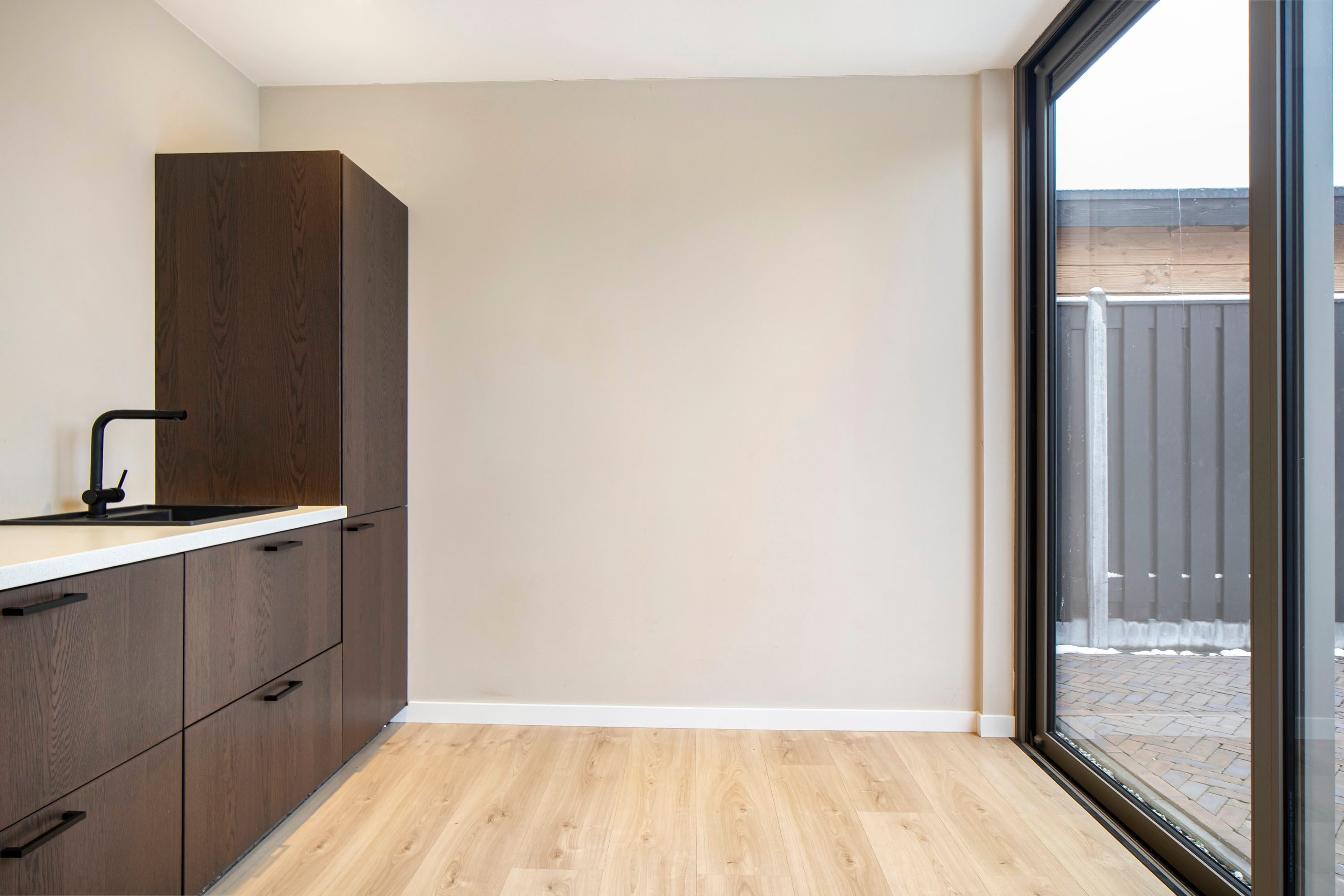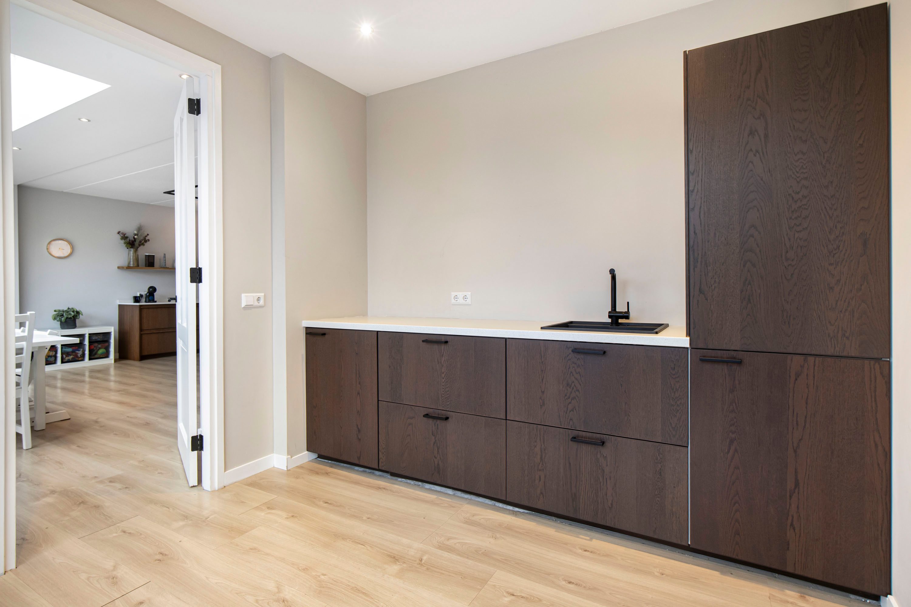 Aansluitend vind je de multifunctionele ruimte, voorzien van een keukenblok en eveneens bereikbaar via een schuifpui naar de tuin.