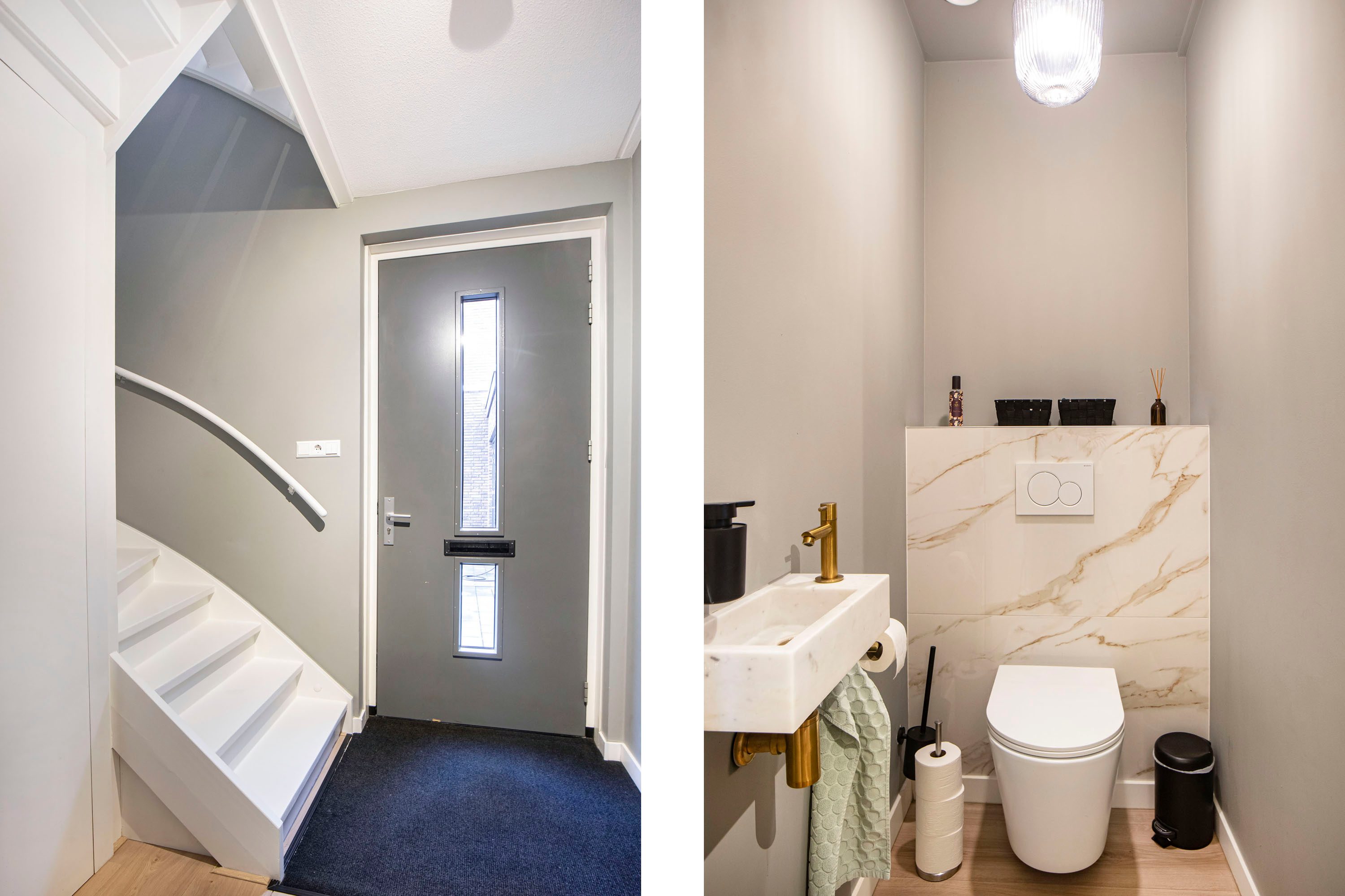 Via de entree kom je in de hal met toilet, vaste kastenwand en trapopgang naar de eerste verdieping.