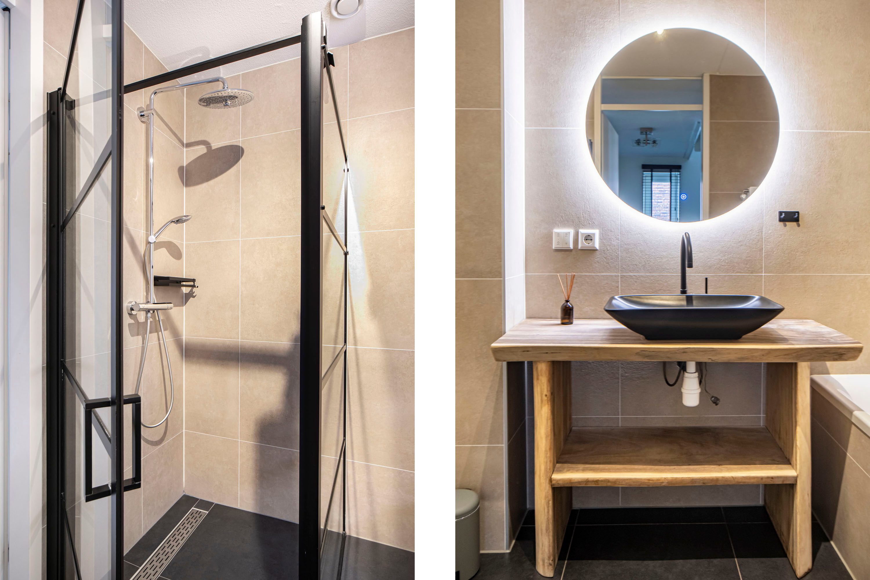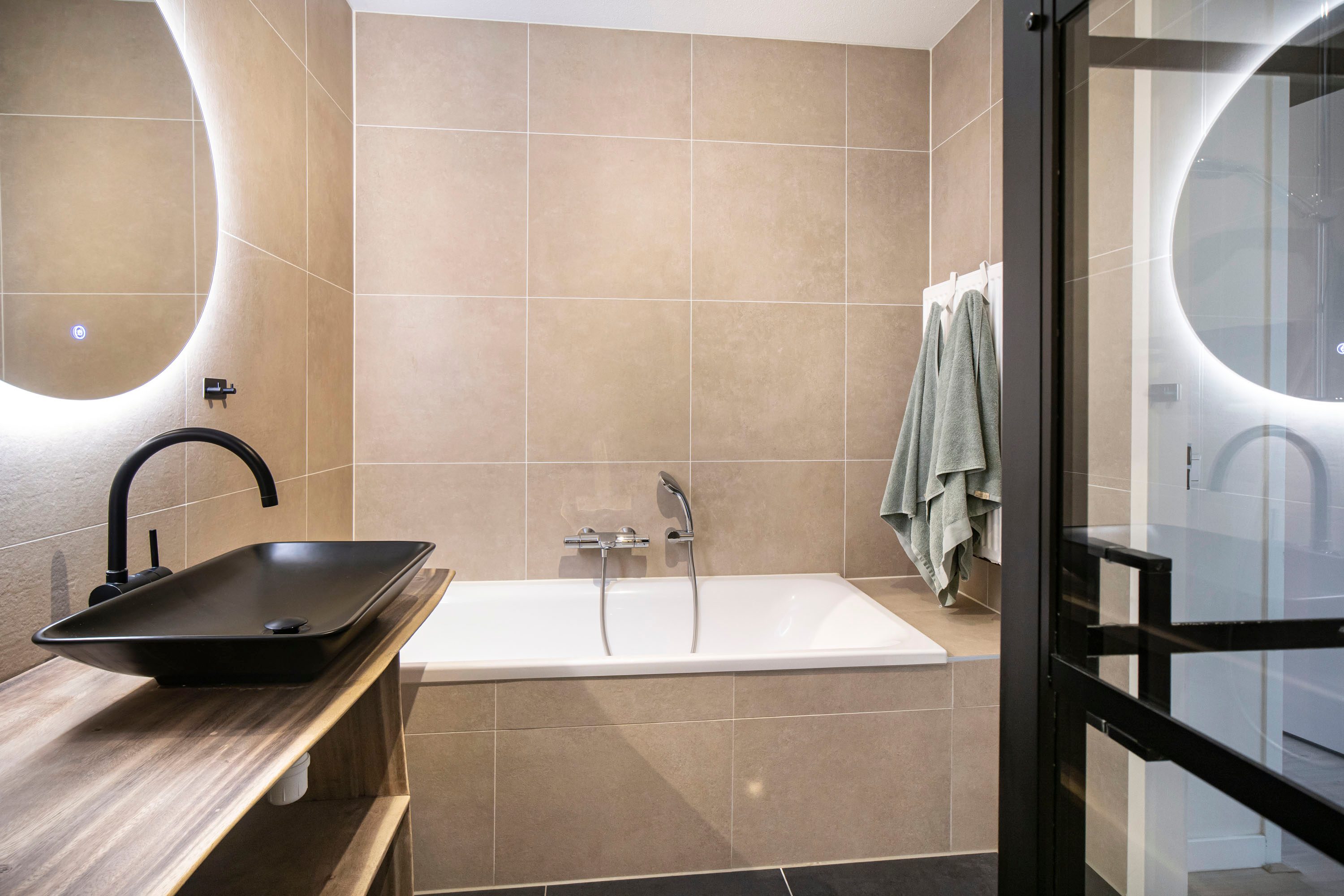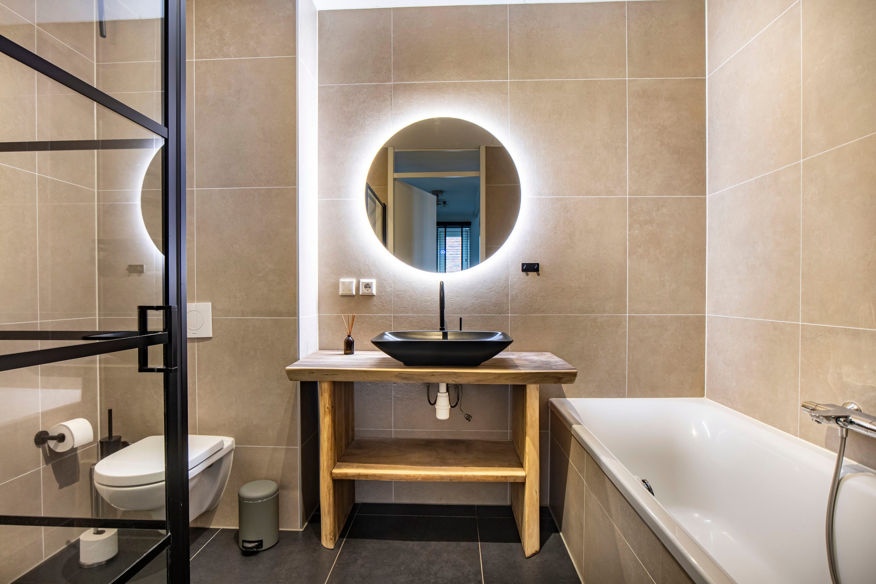 De moderne badkamer is compleet uitgevoerd met een ligbad, inloopdouche, toilet en wastafel.