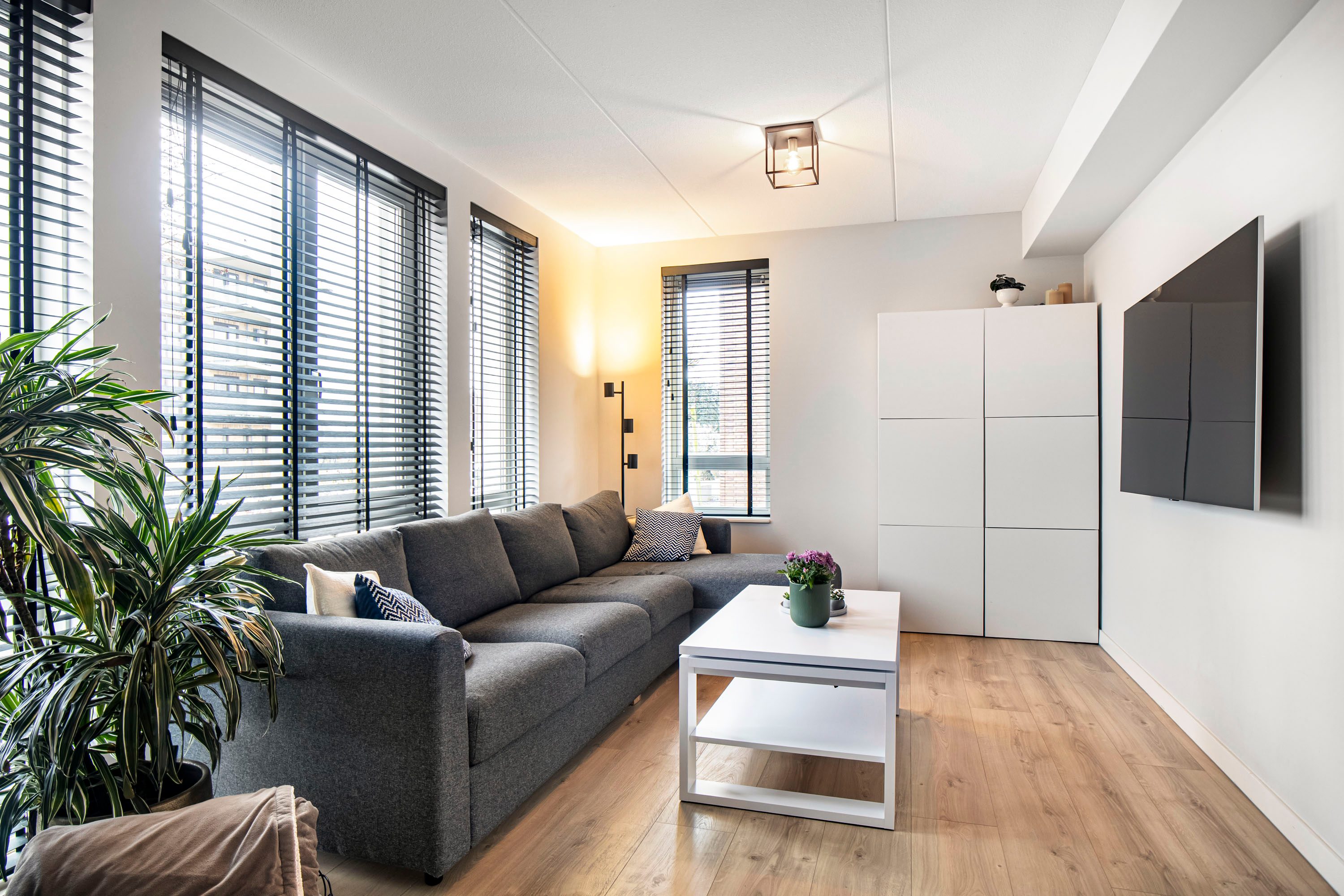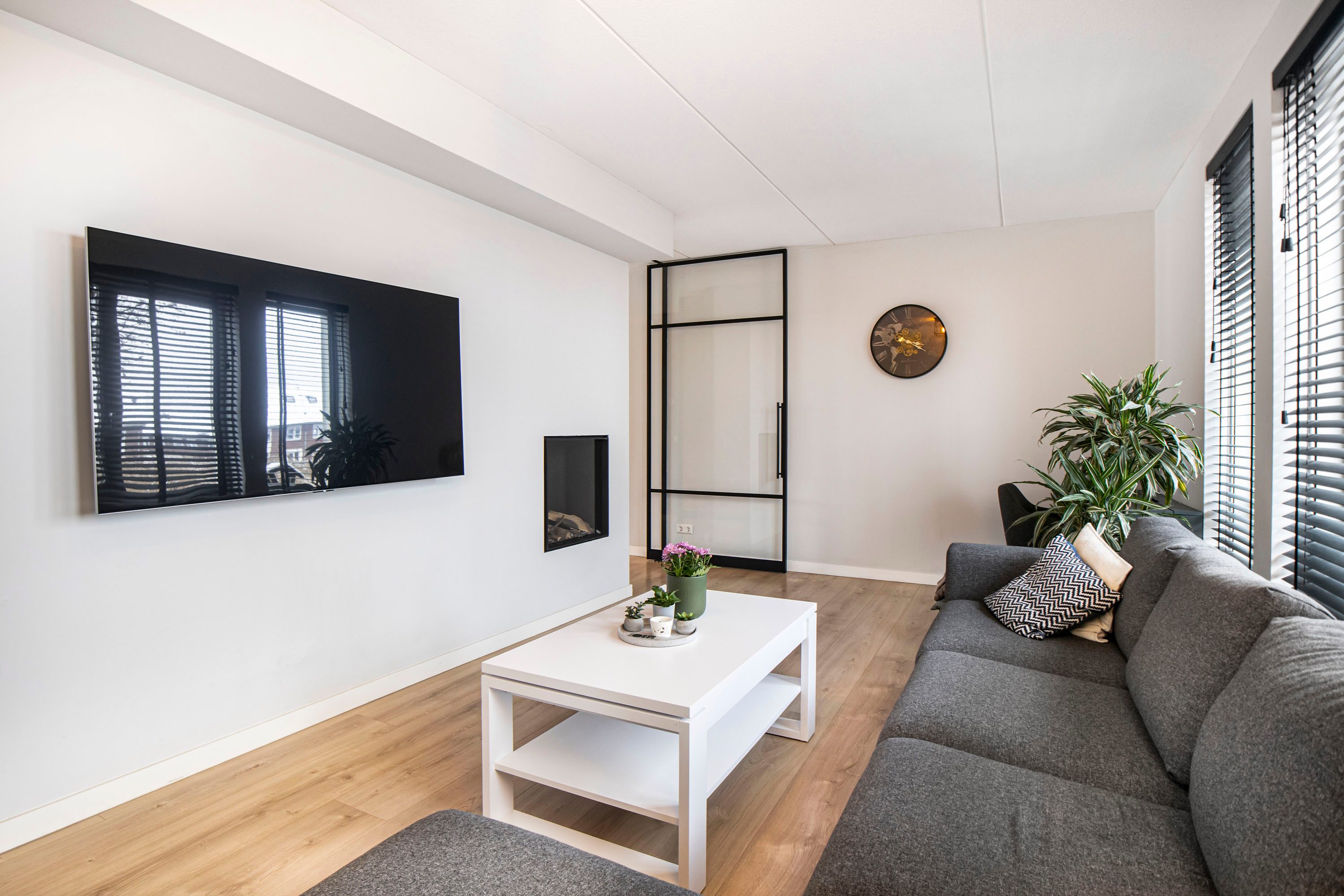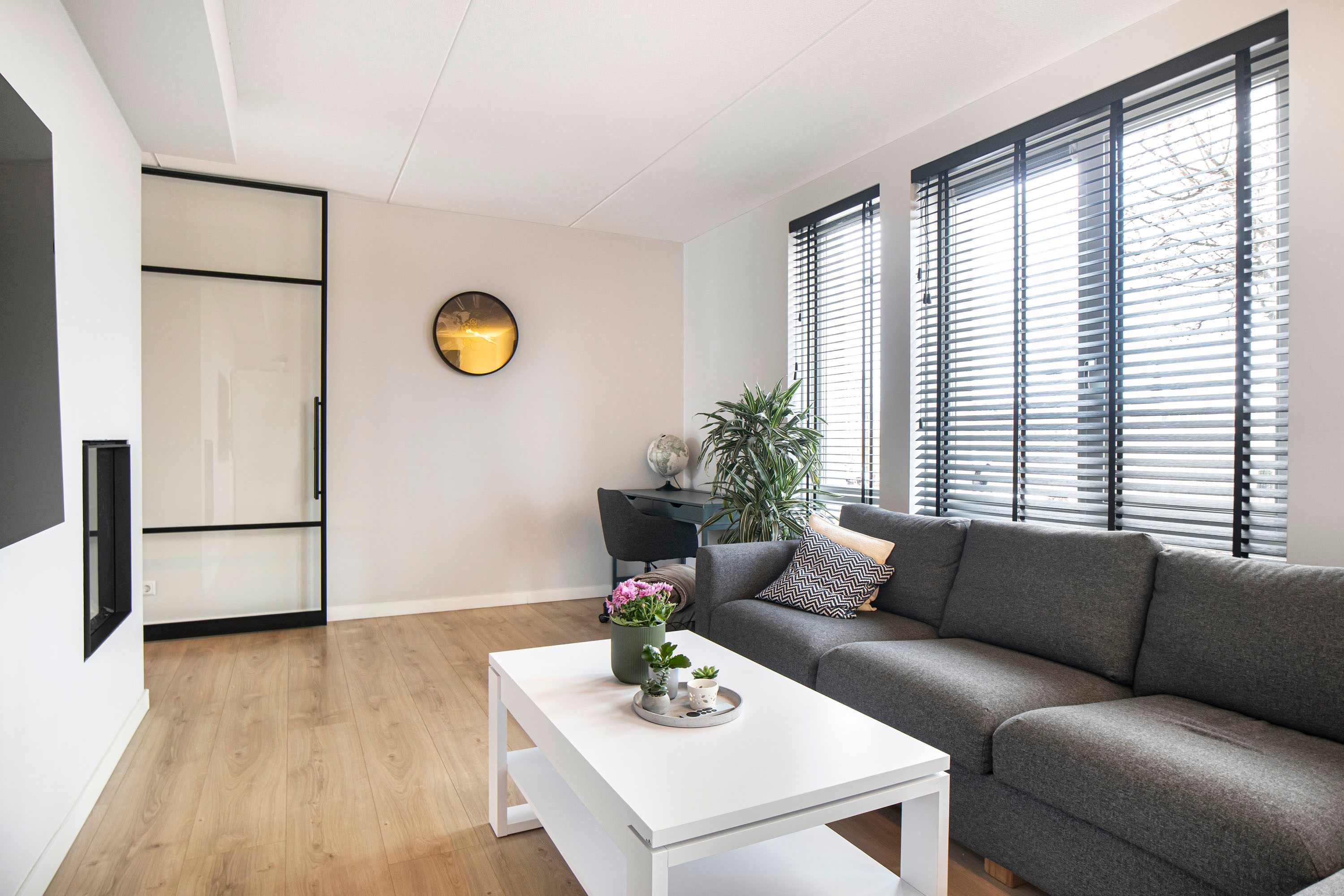 Aan de voorzijde van de woning bevindt zich de woonkamer. Deze ruimte is heerlijk licht dankzij de grote raampartij en het zijraam en sfeervol ingericht met een elektrische haard. De woonkamer is af te sluiten met een stijlvolle taatsdeur, waardoor je desgewenst een extra rustige leefruimte creëert.