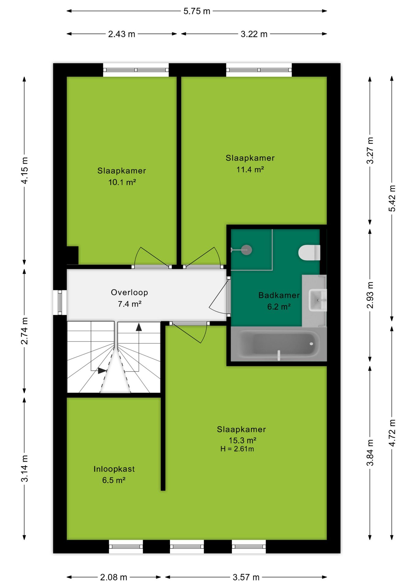 Op de eerste verdieping bevinden zich drie ruime slaapkamers van circa 15 m², 11 m² en 10 m², allen voorzien van airconditioning.