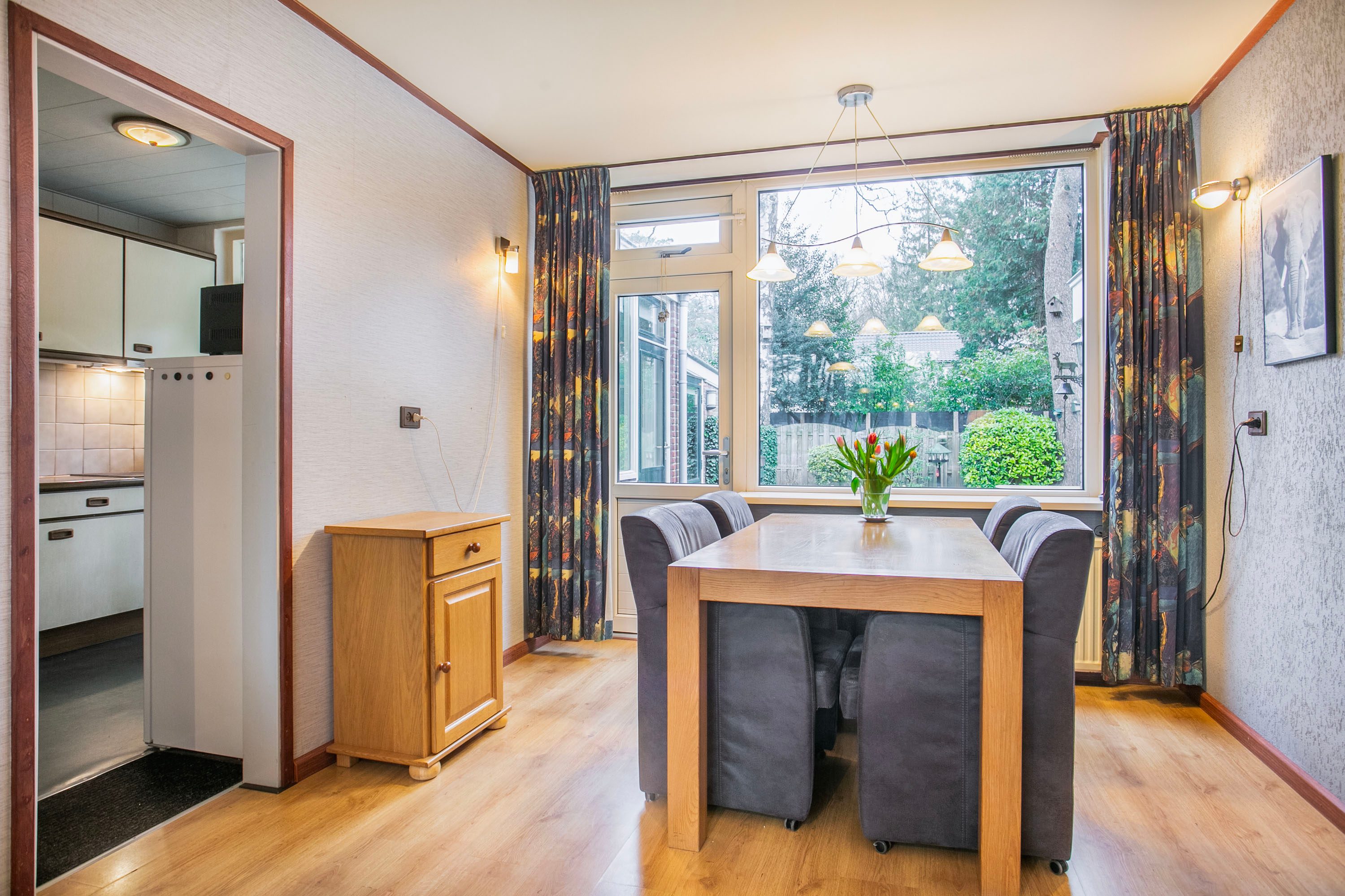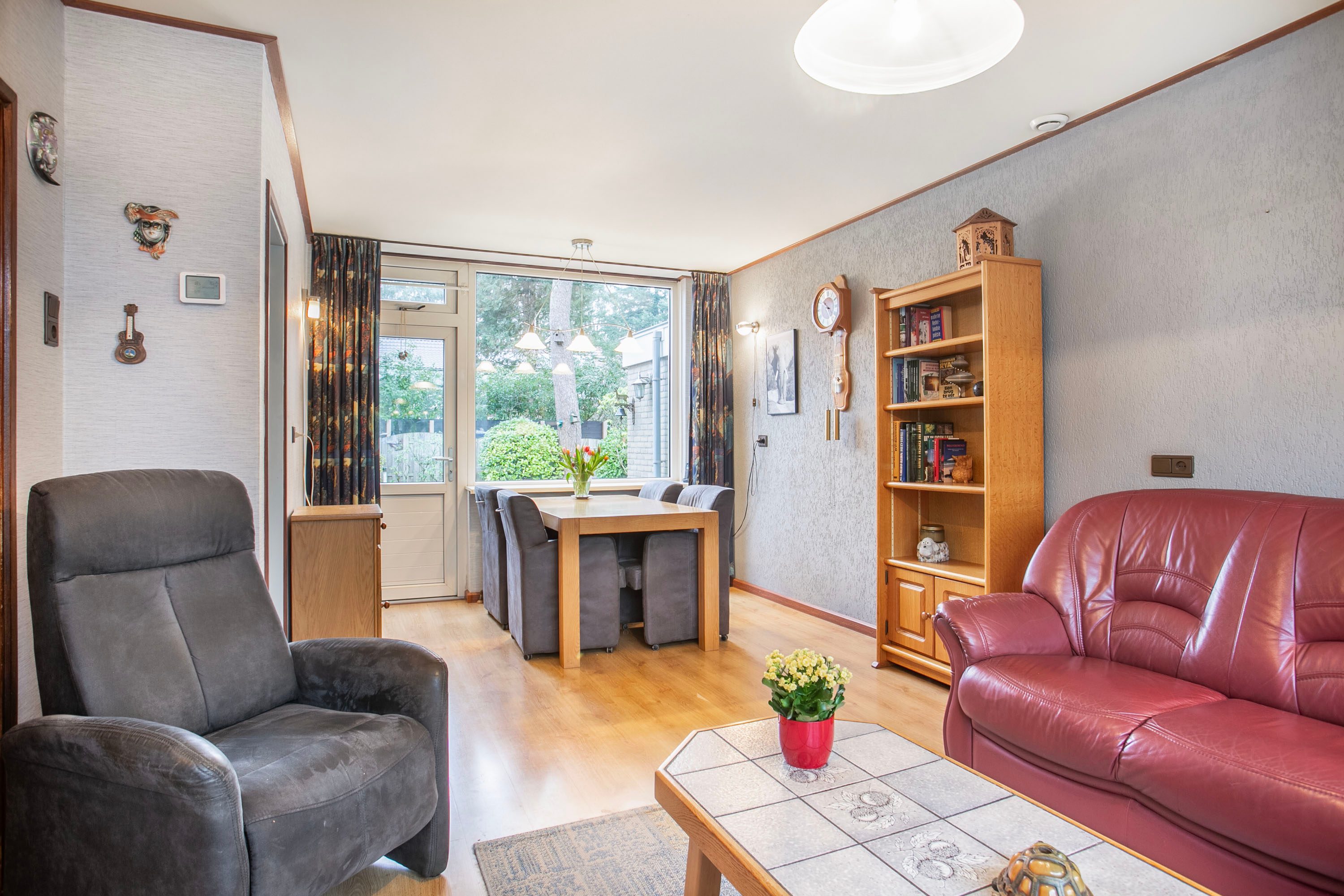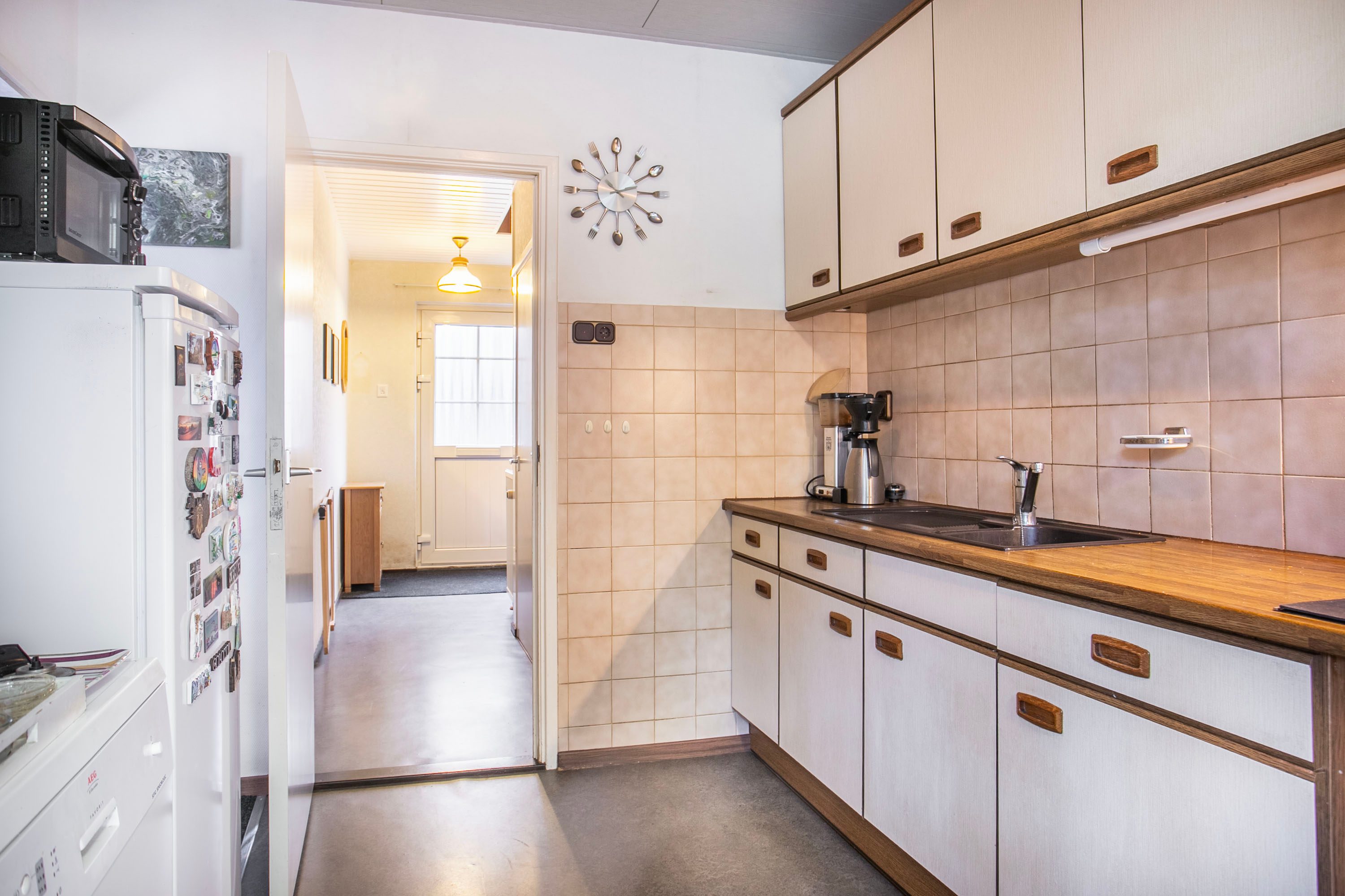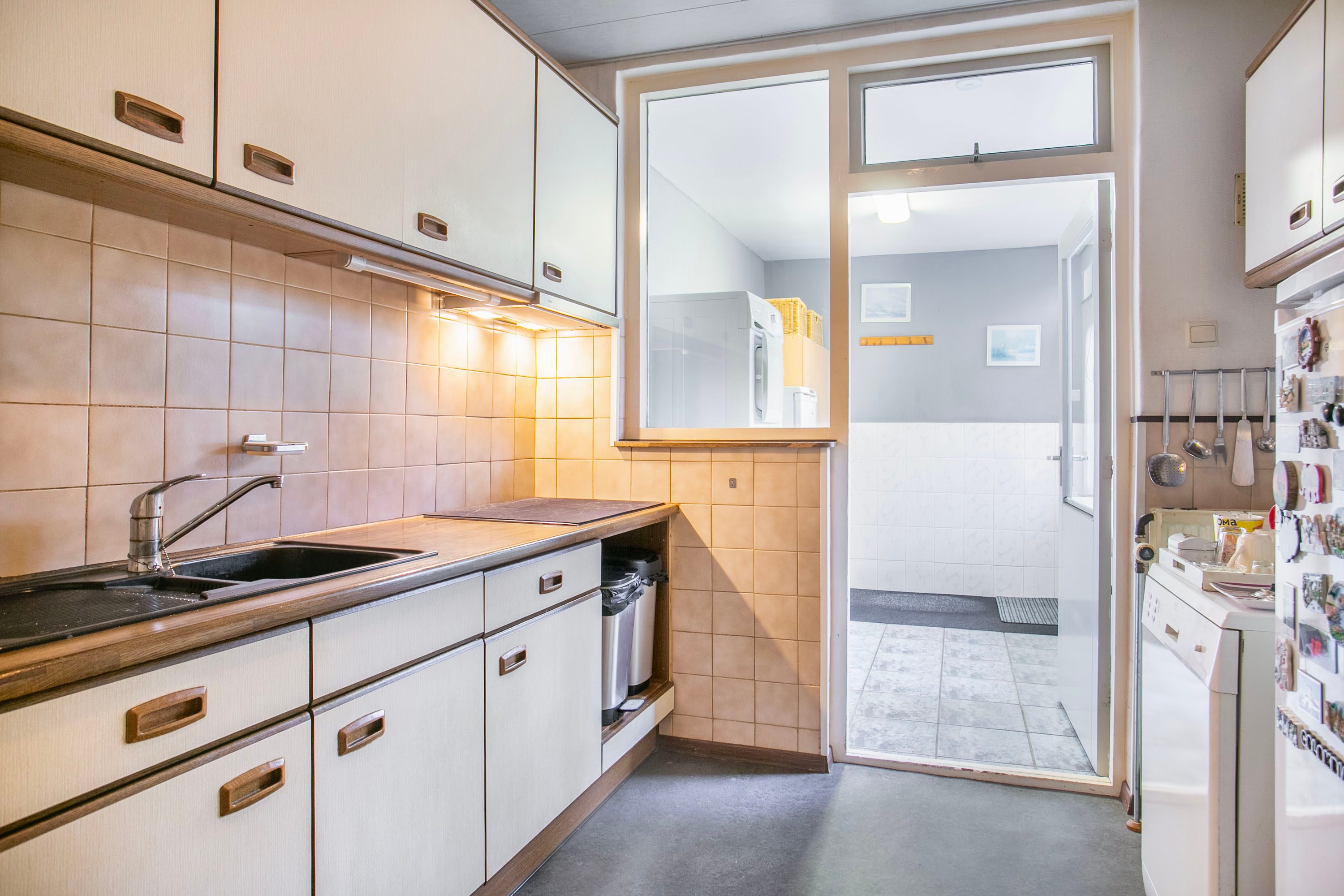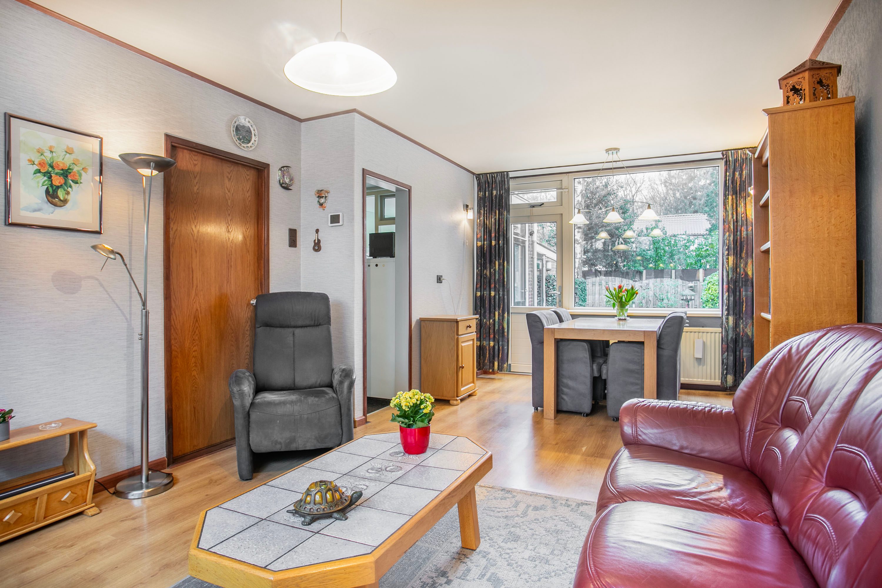 Bij binnenkomst in de hal heb je toegang tot de toiletruimte, de trapkast, de trapopgang naar de eerste verdieping én zowel de woonkamer als de keuken. Zodra je de woonkamer binnenstapt, valt het prachtige groene en vrije uitzicht aan zowel de voor- als achterzijde direct op. De woonkamer heeft een oppervlakte van circa 23 m²; de huidige bewoners hebben de zithoek aan de voorzijde ingericht en de eethoek aan de achterzijde geplaatst. Uiteraard biedt de ruimte volop mogelijkheden om deze geheel naar eigen wens in te delen. Zie je het al voor je? Een royale aanbouw met een moderne open woonkeuken? Dit zijn plannen die je nu óf in de toekomst kunt realiseren. Met openslaande deuren naar de tuin creëer je een prachtige verbinding tussen binnen en buiten, waardoor de tuin op mooie zomerse dagen als een natuurlijk verlengstuk van de woonkamer aanvoelt. De huidige keuken is gescheiden van de woonkamer en biedt toegang tot een praktische bijkeuken. In deze bijkeuken vind je bovendien de aansluiting voor het witgoed.