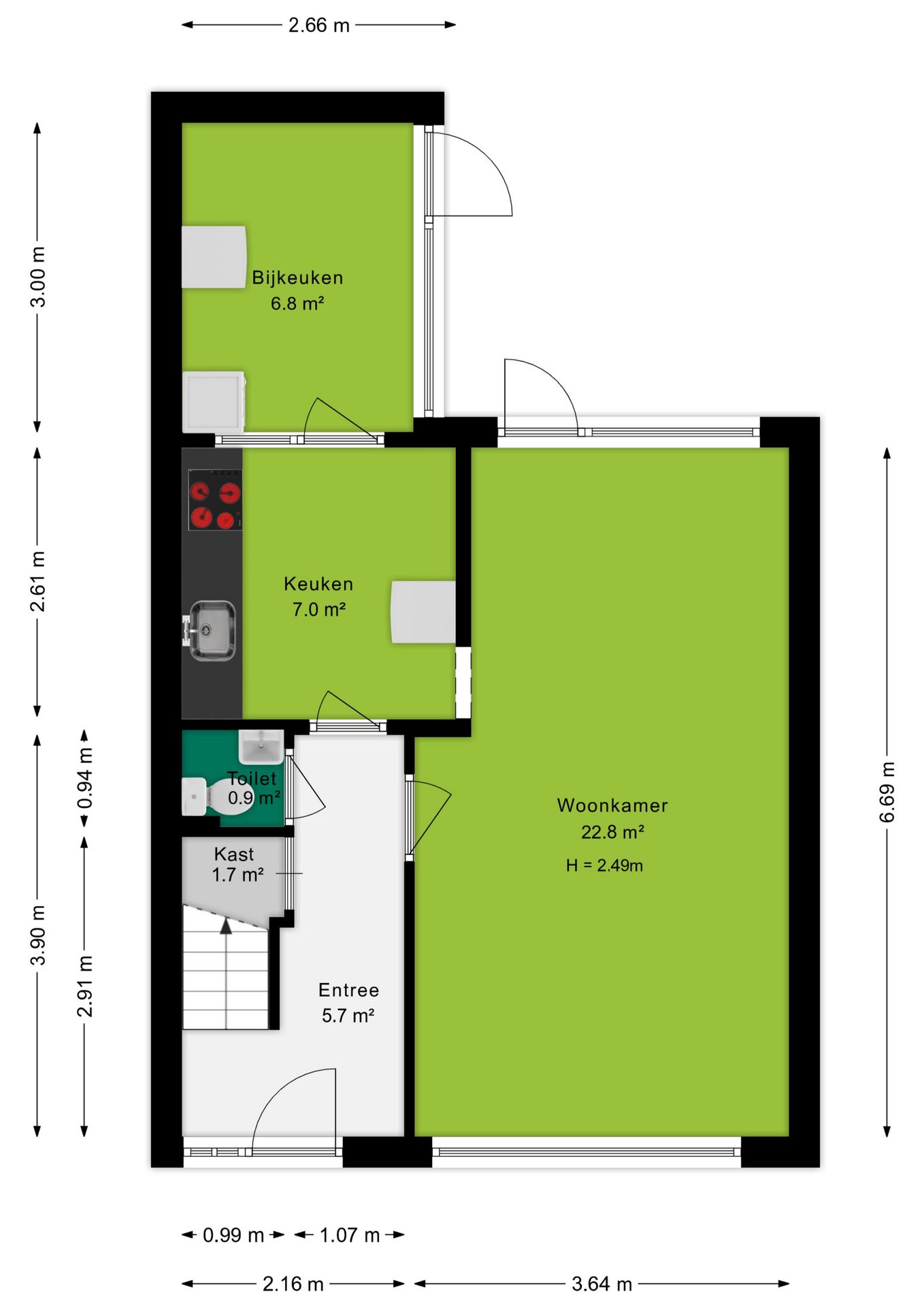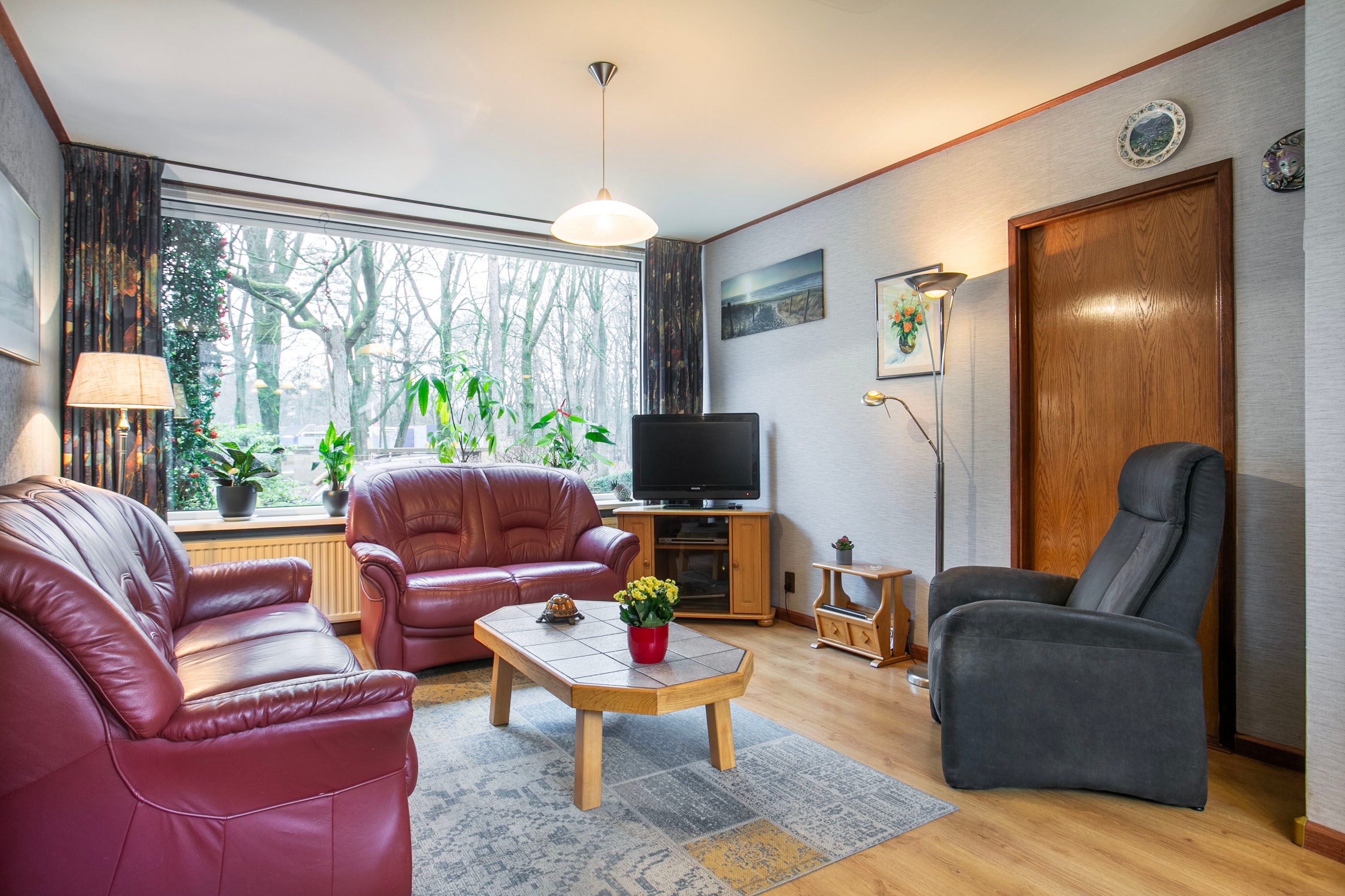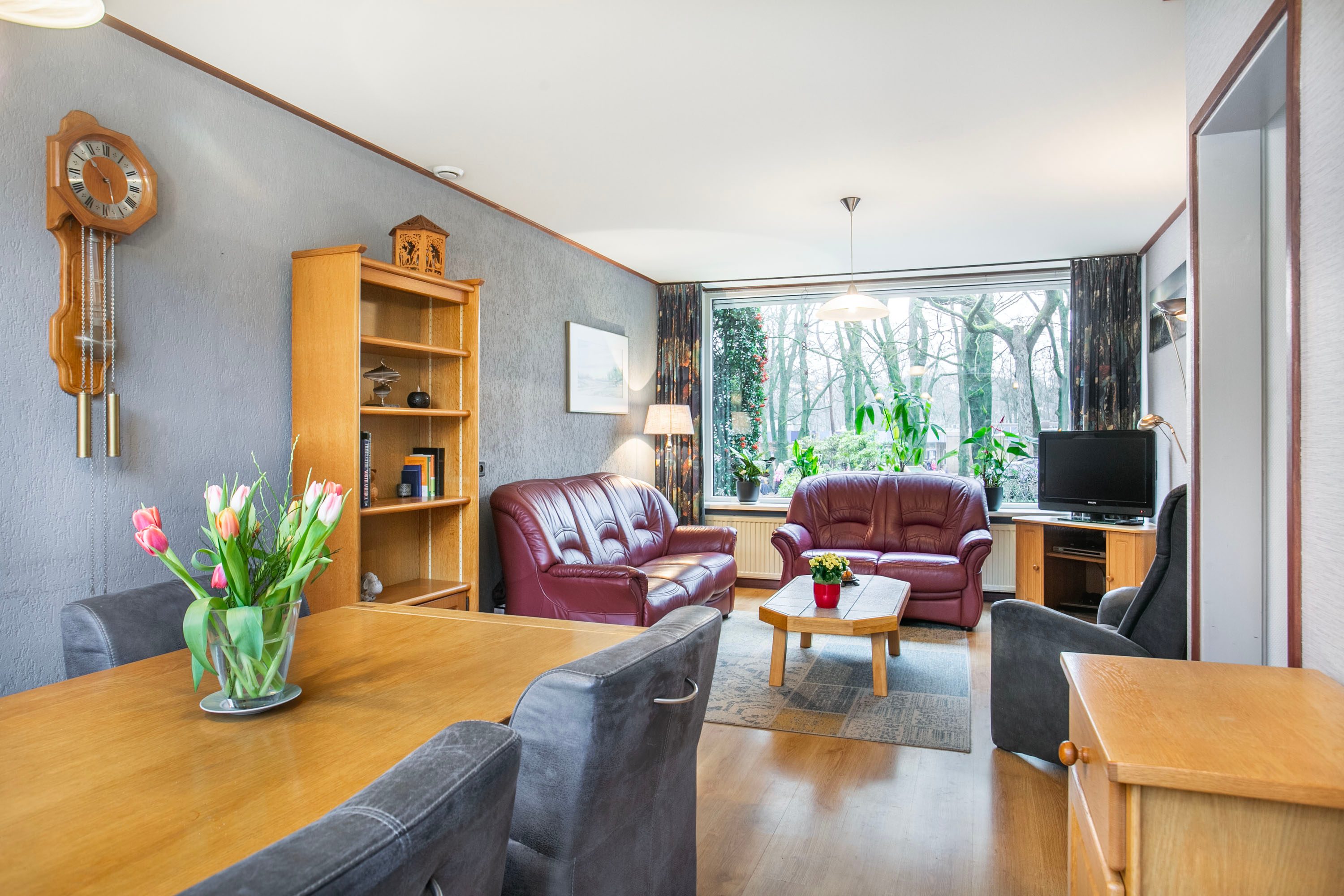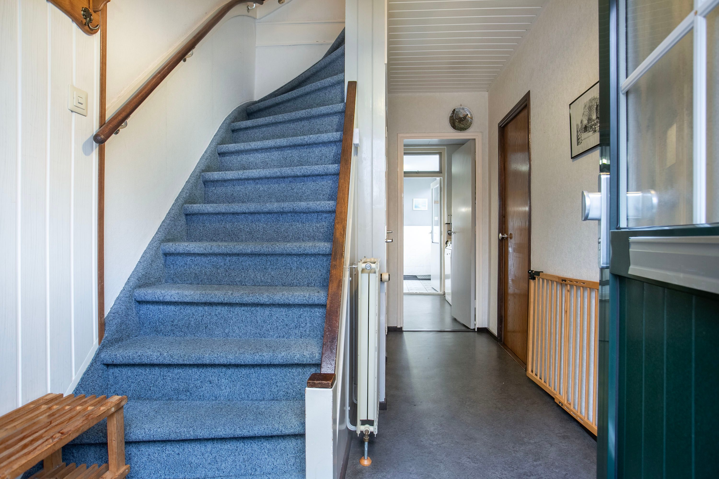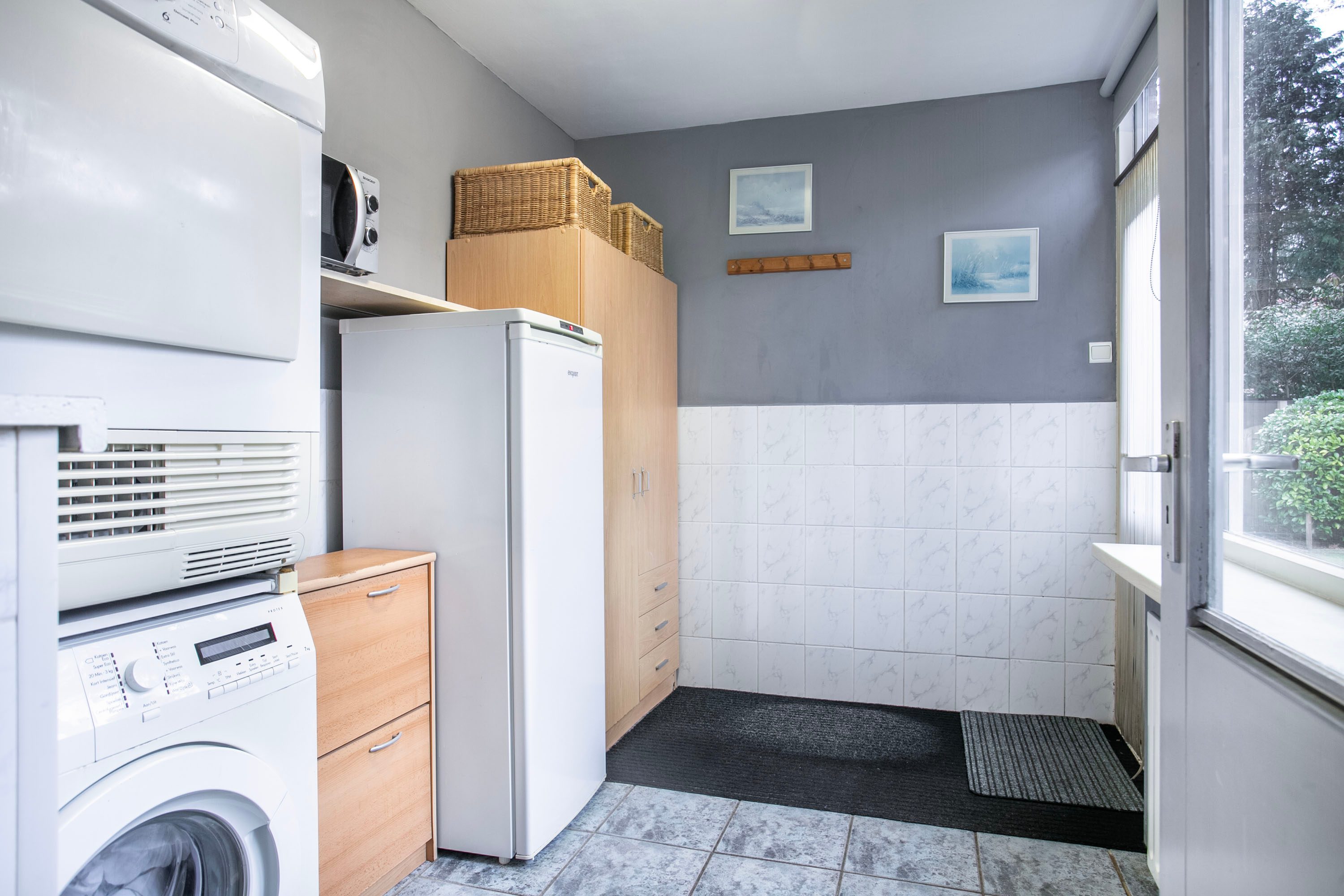 Bij binnenkomst in de hal heb je toegang tot de toiletruimte, de trapkast, de trapopgang naar de eerste verdieping én zowel de woonkamer als de keuken. Zodra je de woonkamer binnenstapt, valt het prachtige groene en vrije uitzicht aan zowel de voor- als achterzijde direct op. De woonkamer heeft een oppervlakte van circa 23 m²; de huidige bewoners hebben de zithoek aan de voorzijde ingericht en de eethoek aan de achterzijde geplaatst. Uiteraard biedt de ruimte volop mogelijkheden om deze geheel naar eigen wens in te delen. Zie je het al voor je? Een royale aanbouw met een moderne open woonkeuken? Dit zijn plannen die je nu óf in de toekomst kunt realiseren. Met openslaande deuren naar de tuin creëer je een prachtige verbinding tussen binnen en buiten, waardoor de tuin op mooie zomerse dagen als een natuurlijk verlengstuk van de woonkamer aanvoelt. De huidige keuken is gescheiden van de woonkamer en biedt toegang tot een praktische bijkeuken. In deze bijkeuken vind je bovendien de aansluiting voor het witgoed.