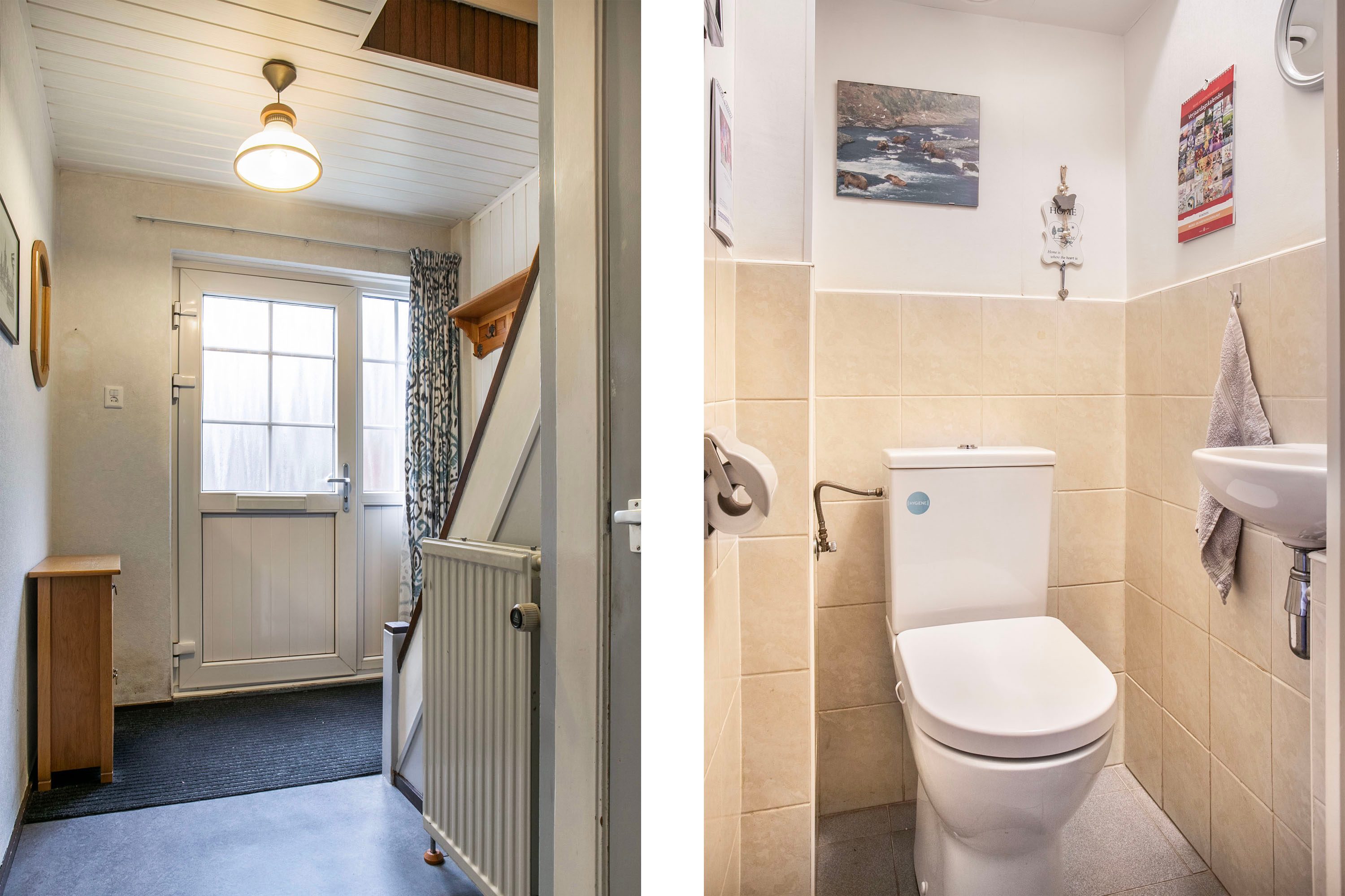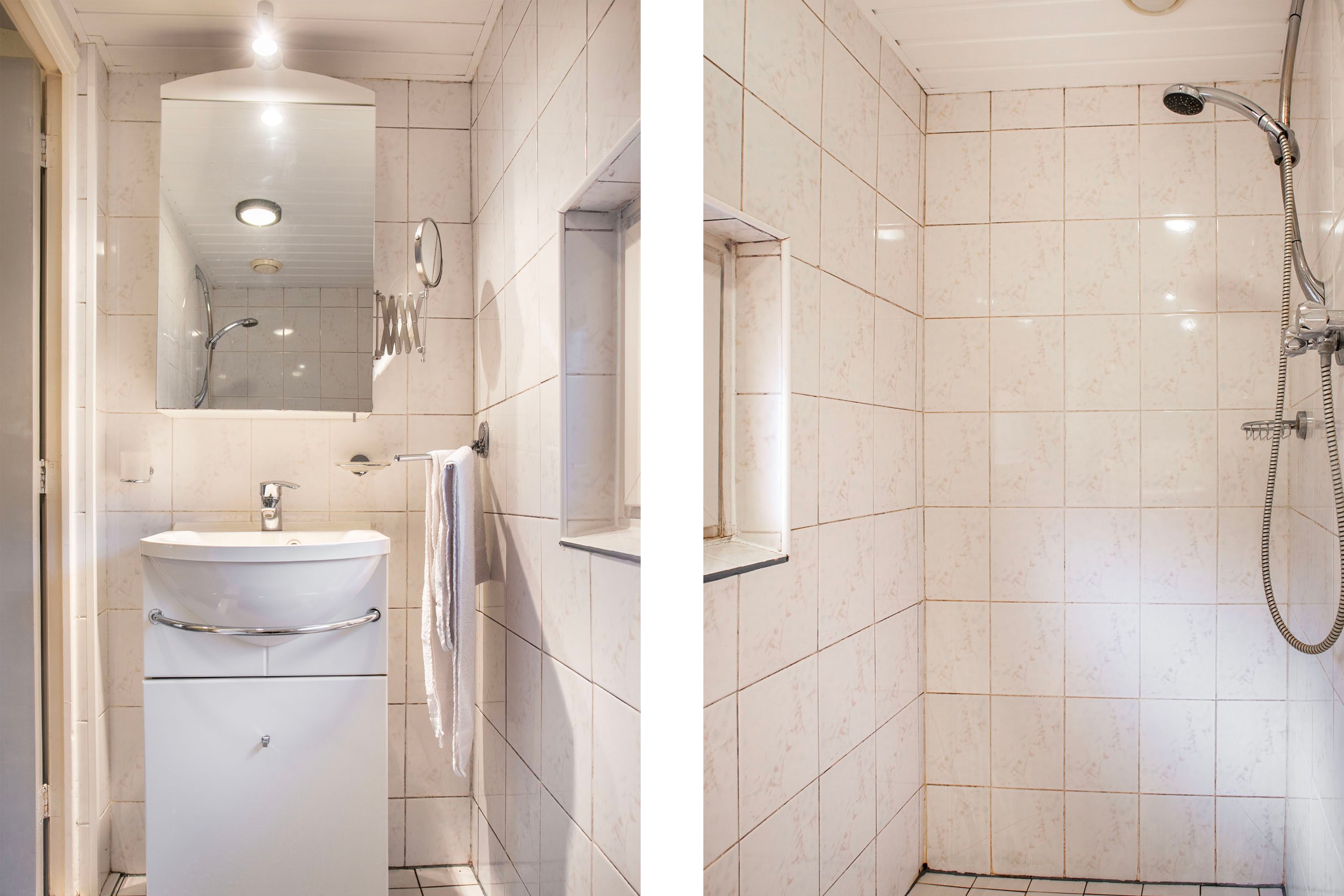 De badkamer is volledig betegeld in een lichte kleurstelling en uitgerust met een douche en een wastafelmeubel. De ruimte is eenvoudig van opzet en toe aan modernisering, waardoor je deze geheel naar eigen smaak kunt vernieuwen.