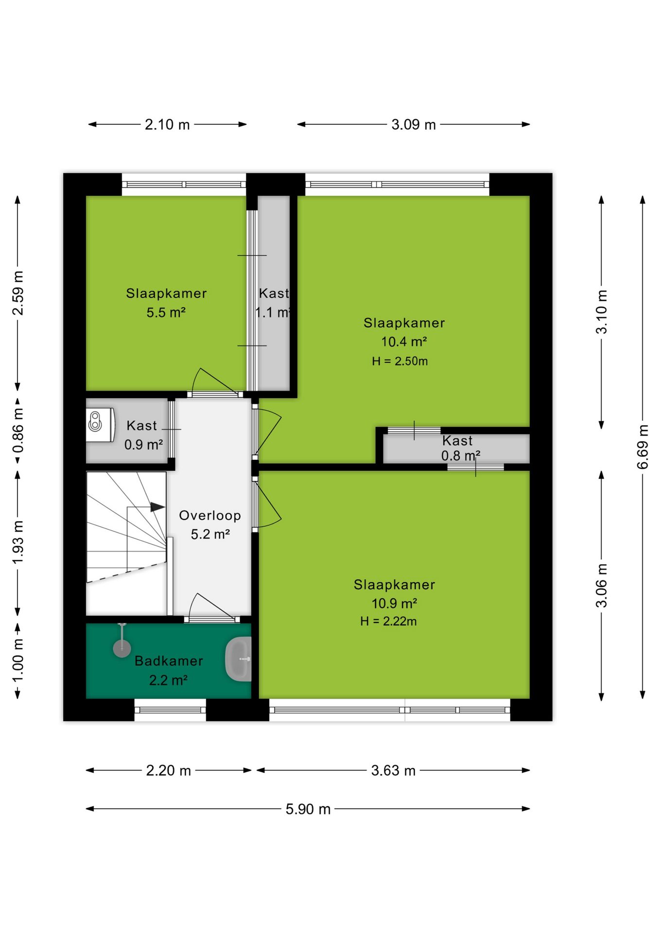 Op de eerste verdieping bevinden zich drie slaapkamers en de badkamer. De slaapkamers meten circa 11 m², 10 m² en 6 m² en zijn allemaal voorzien van praktische vaste bergkasten. Op de overloop bevindt zich bovendien een extra vaste kast met daarin de C.V.-opstelling.