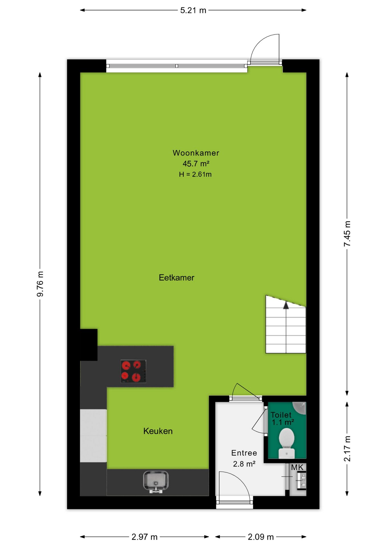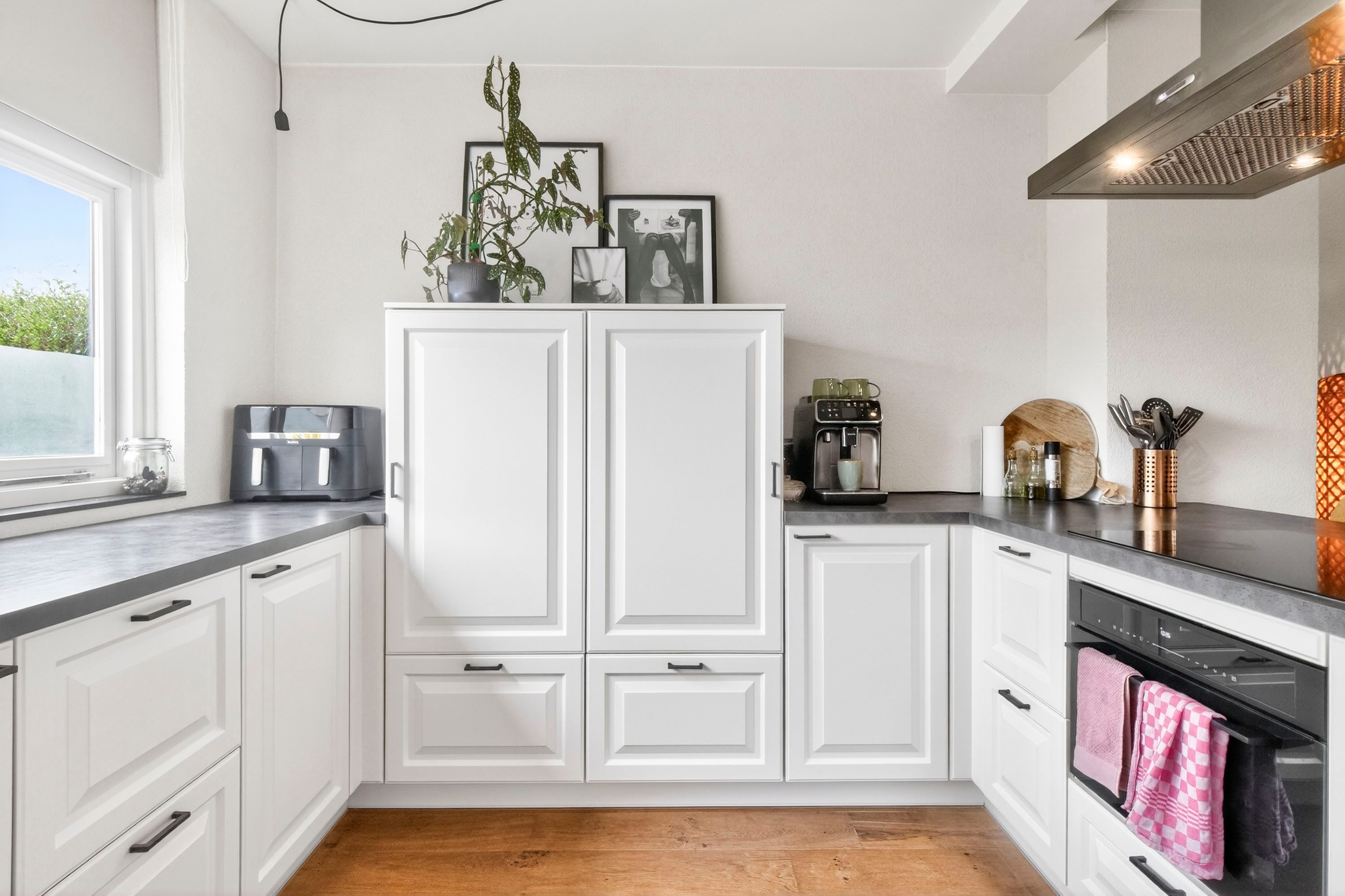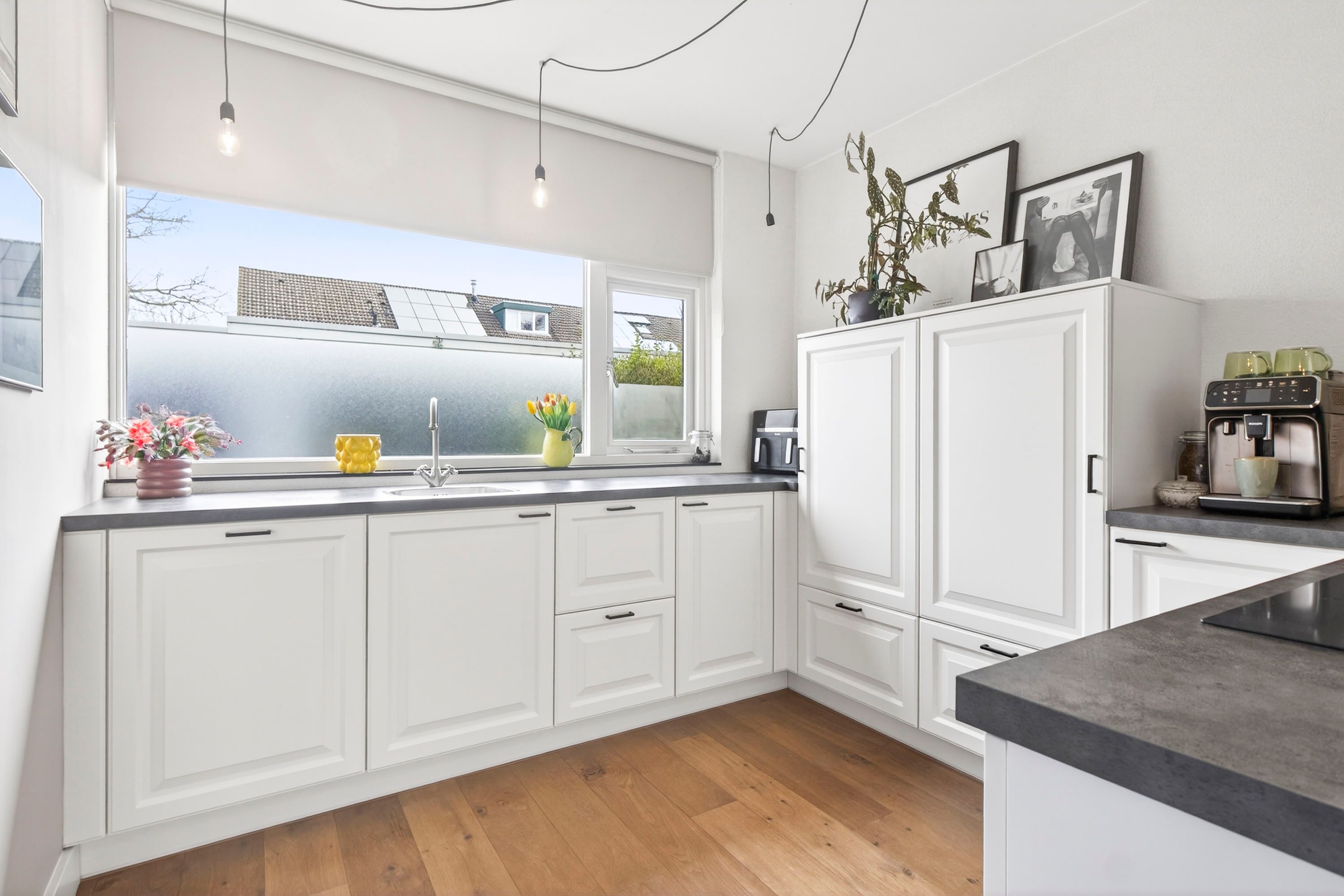 Aan de voorzijde bevindt zich de open keuken, het hart van het huis voor wie van koken houdt. De keuken is opgesteld in een hoek waar je gezellig kunt aanschuiven voor het ontbijt of een drankje terwijl er gekookt wordt. Je vindt hier alle gewenste apparatuur, zoals een kookplaat met RVS-afzuigkap, een oven, vaatwasser en een koelkast. Het grote raam boven het aanrecht geeft een fijn uitzicht op de rustige straat aan de voorzijde.