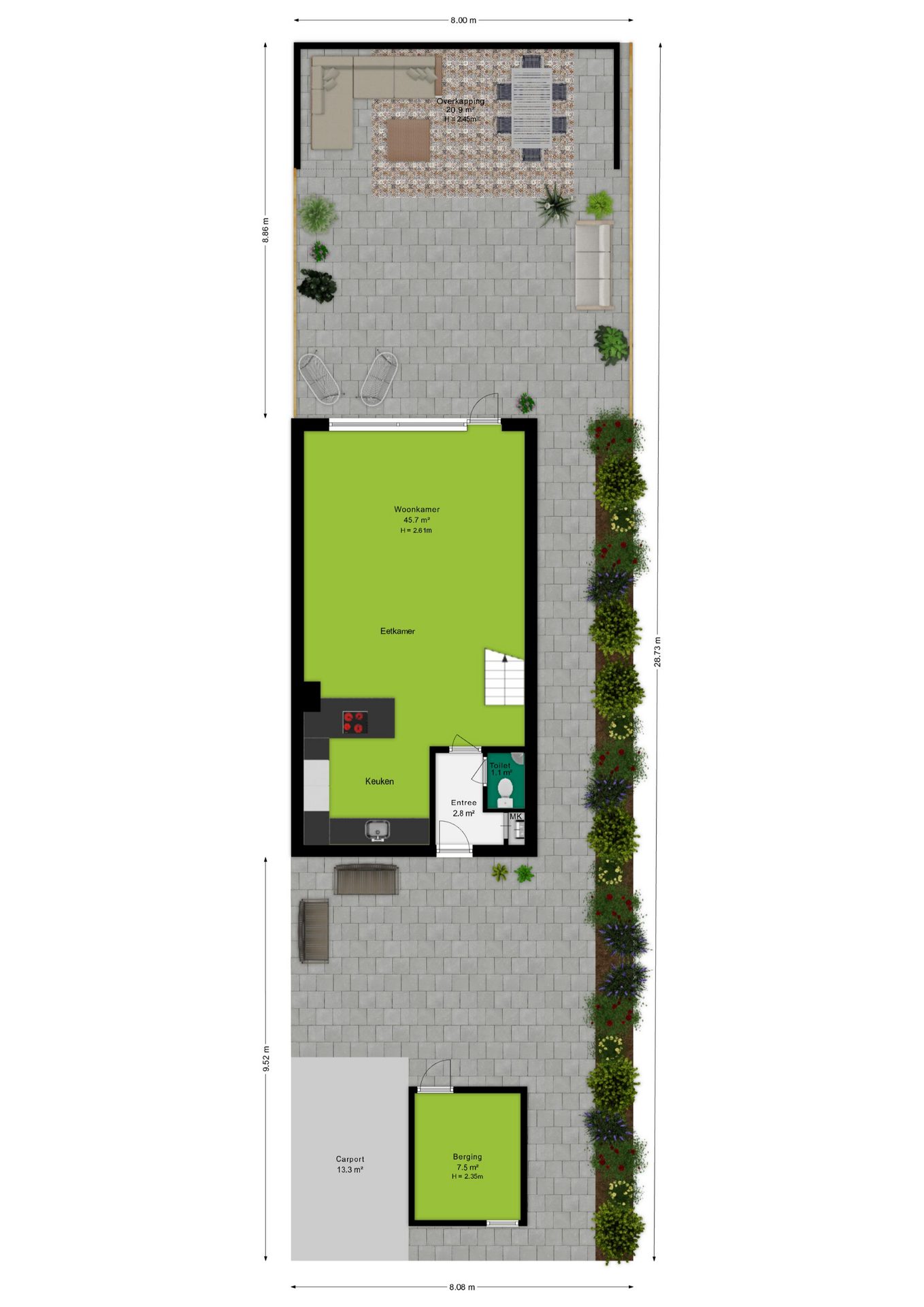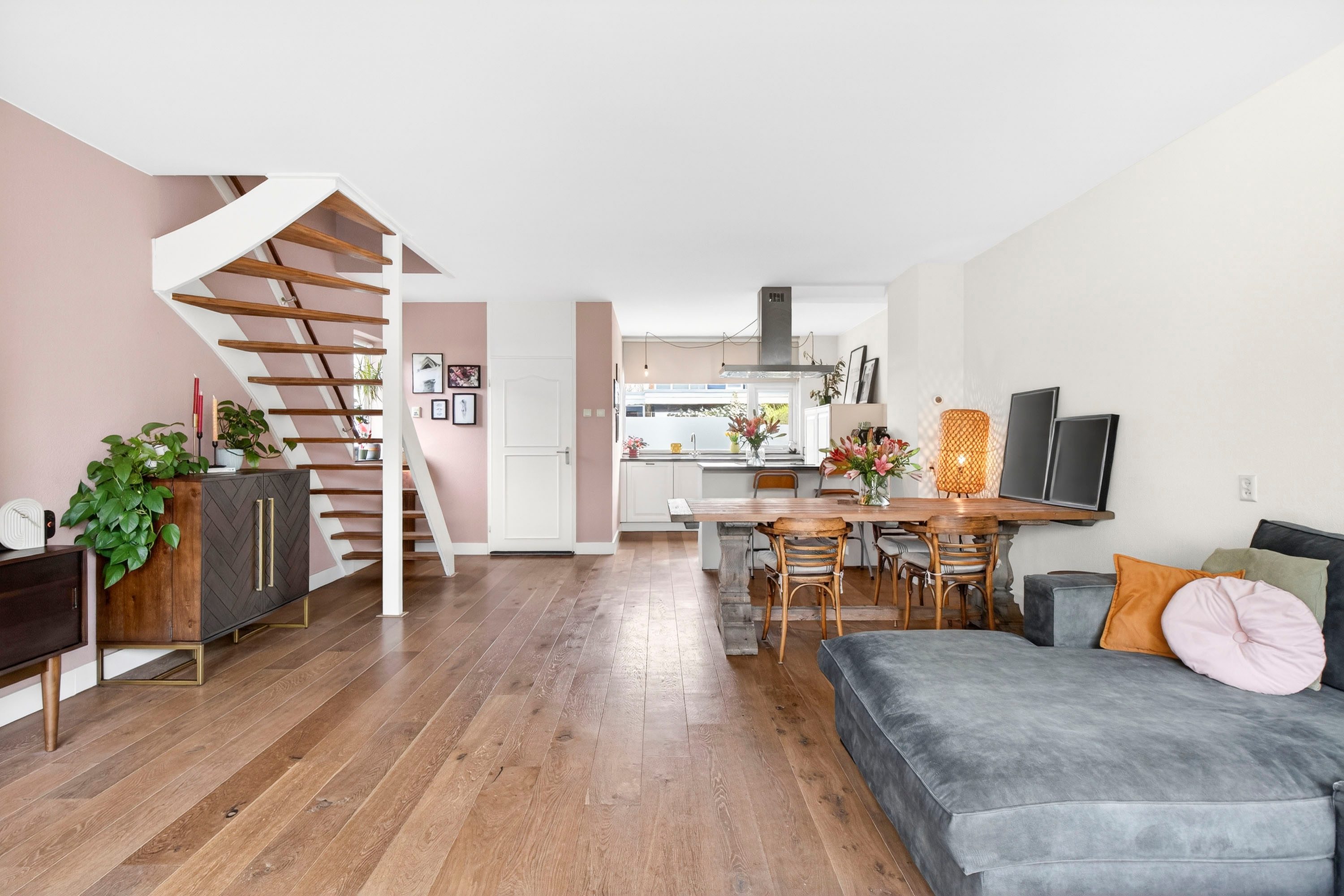 Je parkeert de auto droog onder je eigen carport en komt binnen in een lichte, verzorgde hal. Hier vind je het moderne toilet met fonteintje en de trapopgang. Zodra je de woonkamer binnenstapt, valt op hoe licht en ruimtelijk de woning is. De woonkamer is volledig tuingericht; door de grote raampartijen aan de achterzijde stroomt het daglicht naar binnen en heb je een mooi uitzicht op je terras. De warme houtlook vloer is over de gehele verdieping doorgelegd, wat zorgt voor eenheid en rust.
