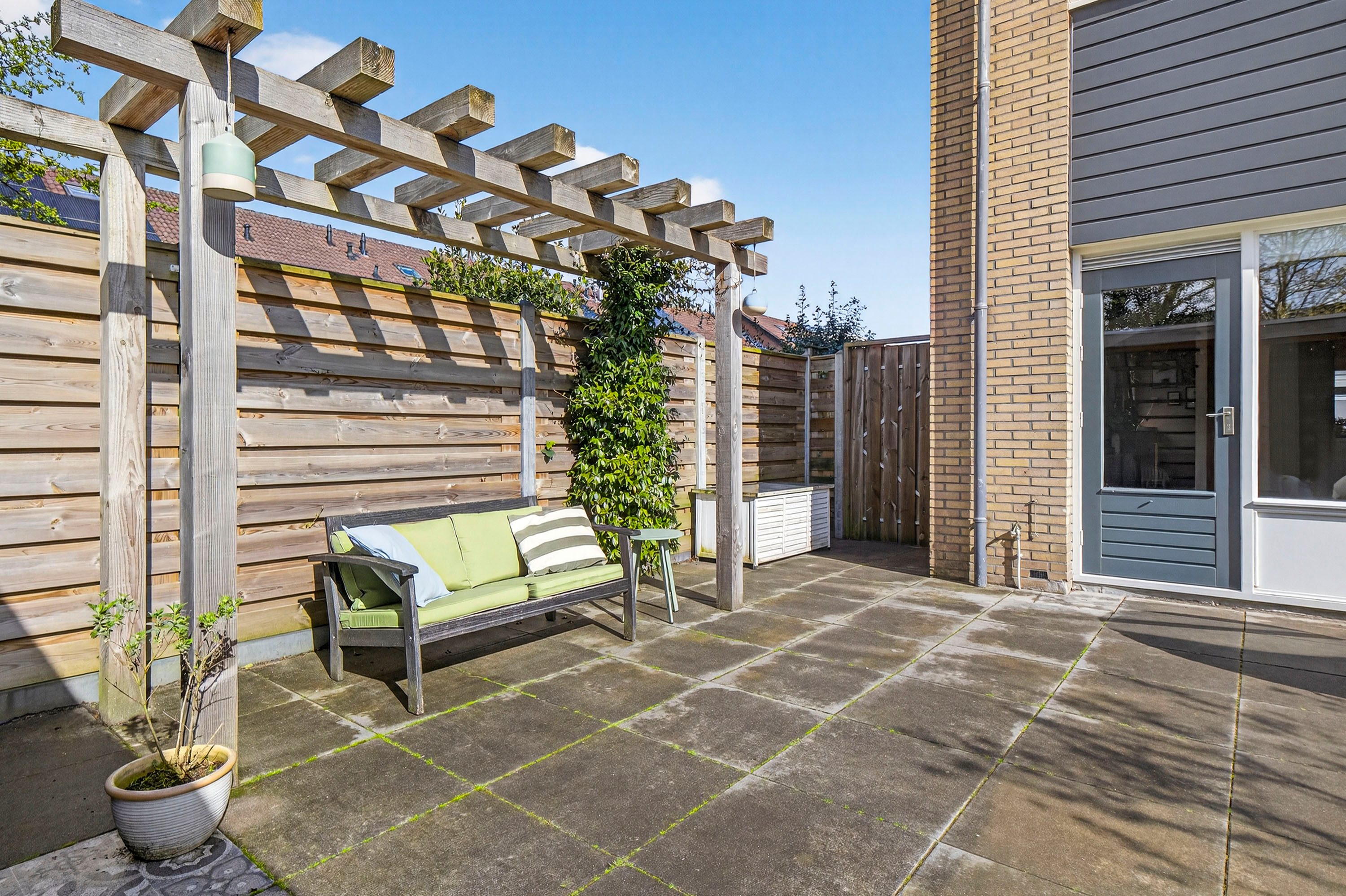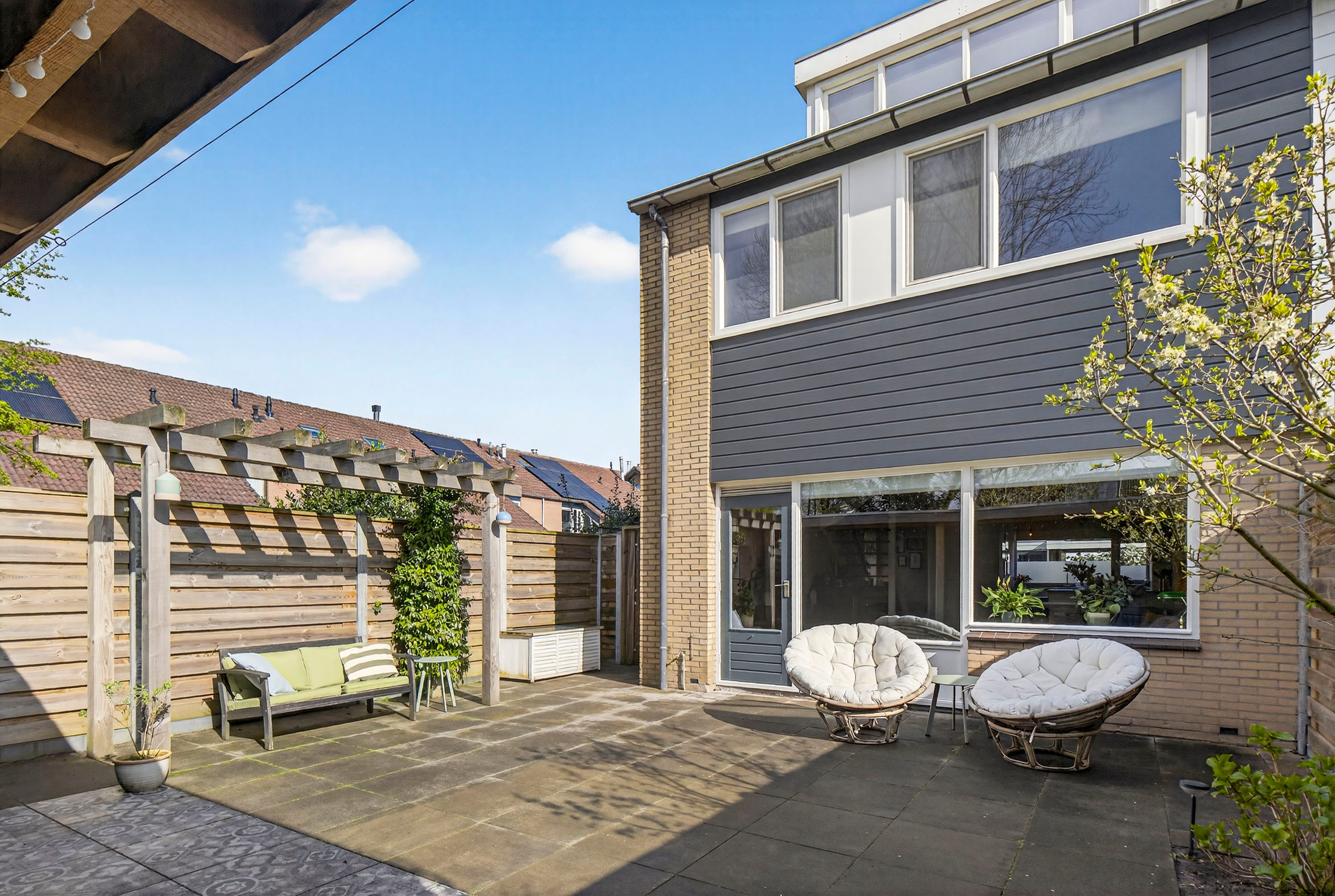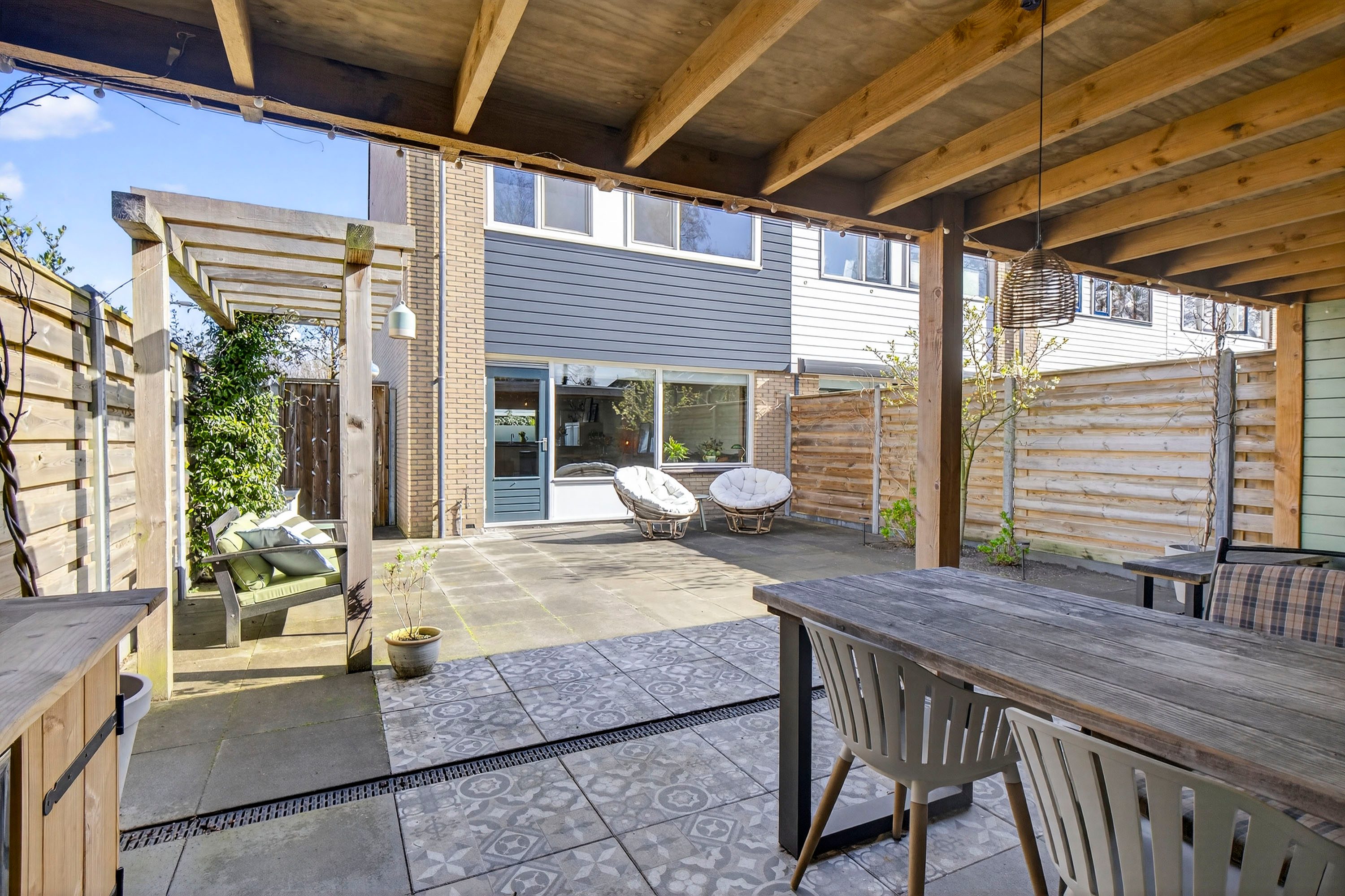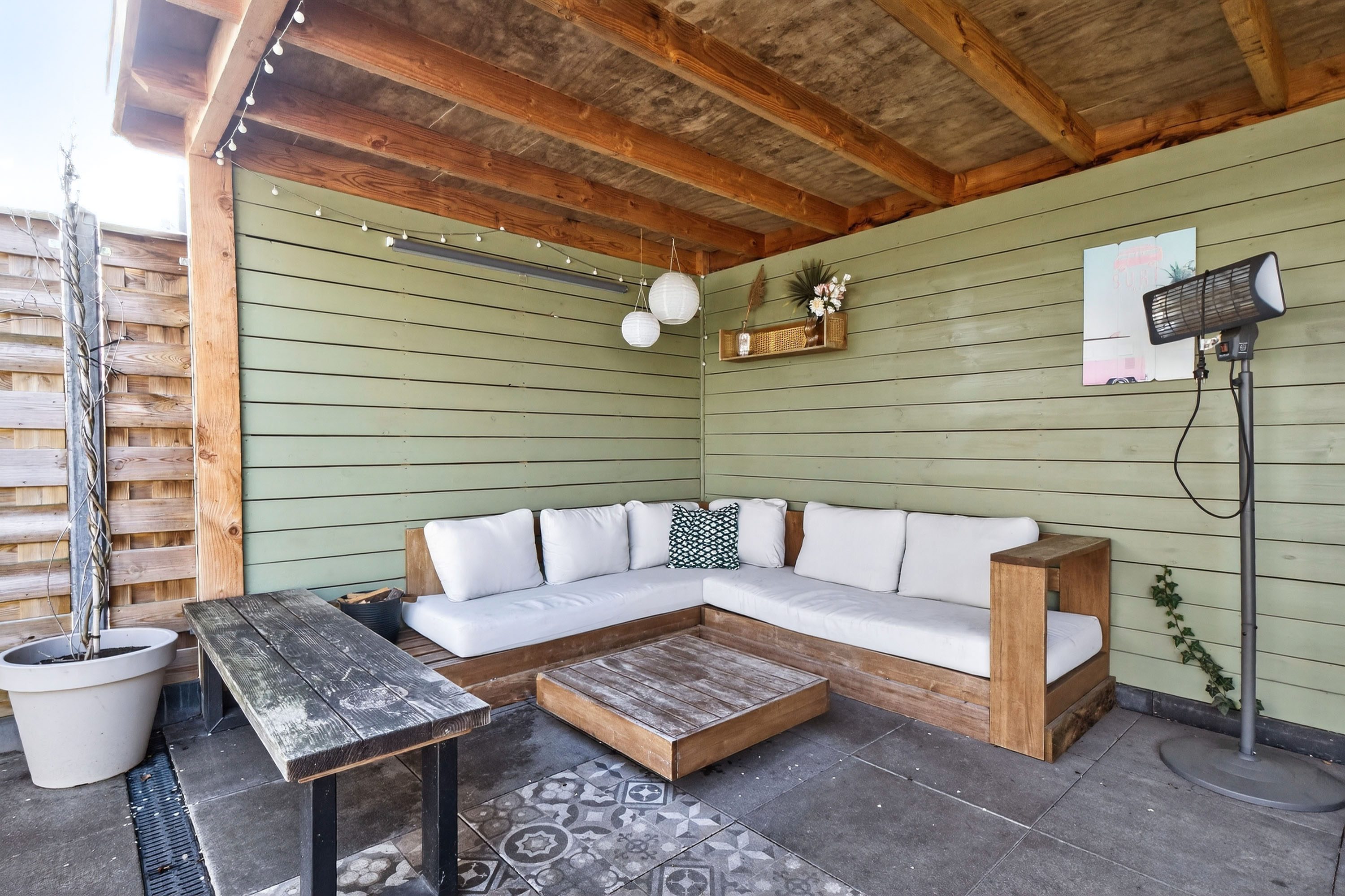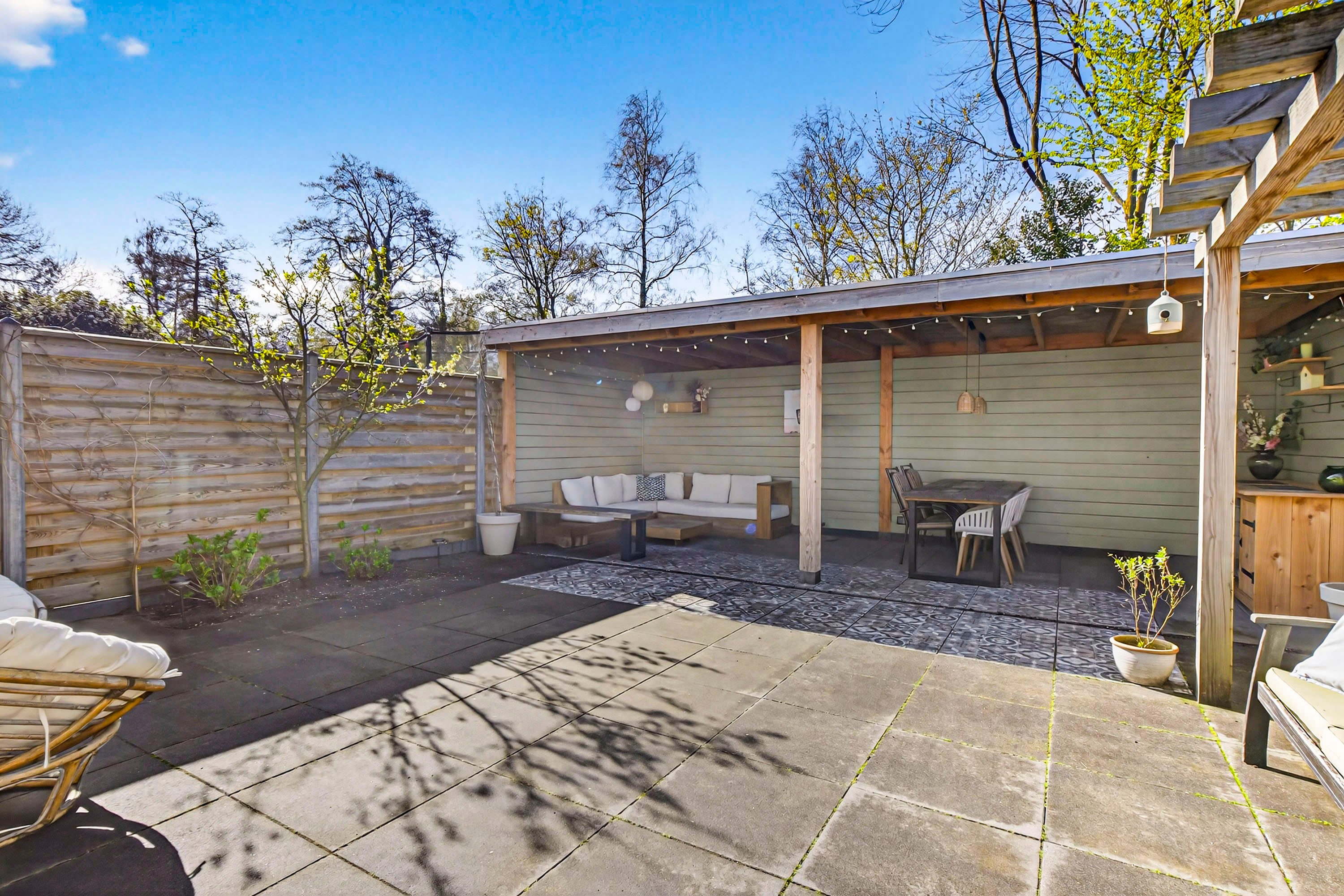 De achtertuin is echt een verlengstuk van je woonkamer, zeker door de ligging op het zonnige zuidwesten. De tuin is met zorg aangelegd met een mix van moderne bestrating en vaste beplanting. Achterin de tuin staat de 'eyecatcher': een robuuste houten overkapping die functioneert als een volwaardige buitenkamer.