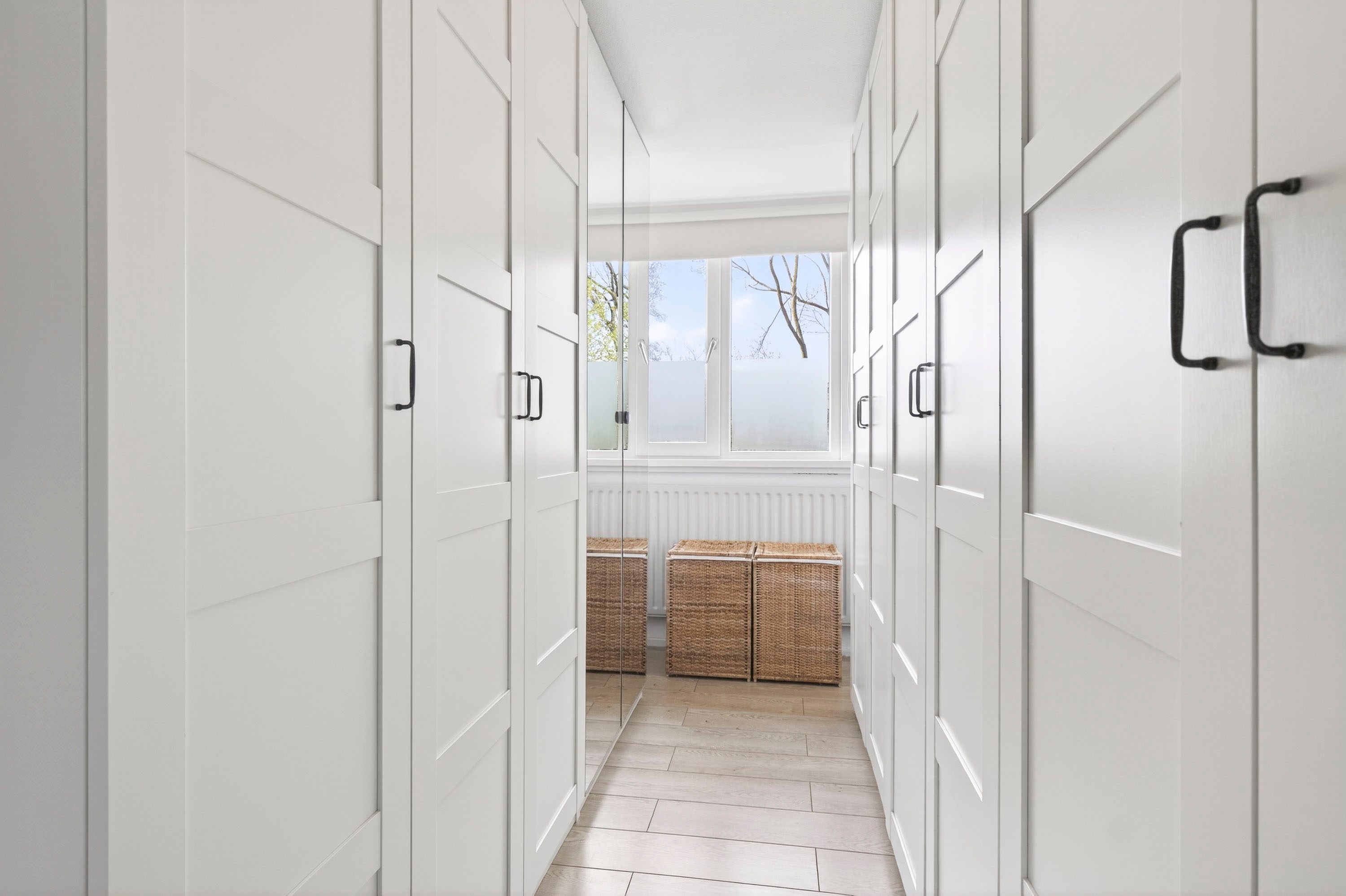 Op de eerste verdieping is de indeling slim aangepast voor maximaal comfort. De hoofdslaapkamer aan de voorzijde is ruim en sfeervol. Wat deze kamer echt bijzonder maakt, is de directe toegang tot de luxe walk-in closet. Deze is voorzien van vaste kastenwanden, waardoor al je kleding en schoenen een eigen plek krijgen. Aan de achterzijde ligt de tweede slaapkamer, een lichte ruimte die perfect te gebruiken is als kinder- of werkkamer.