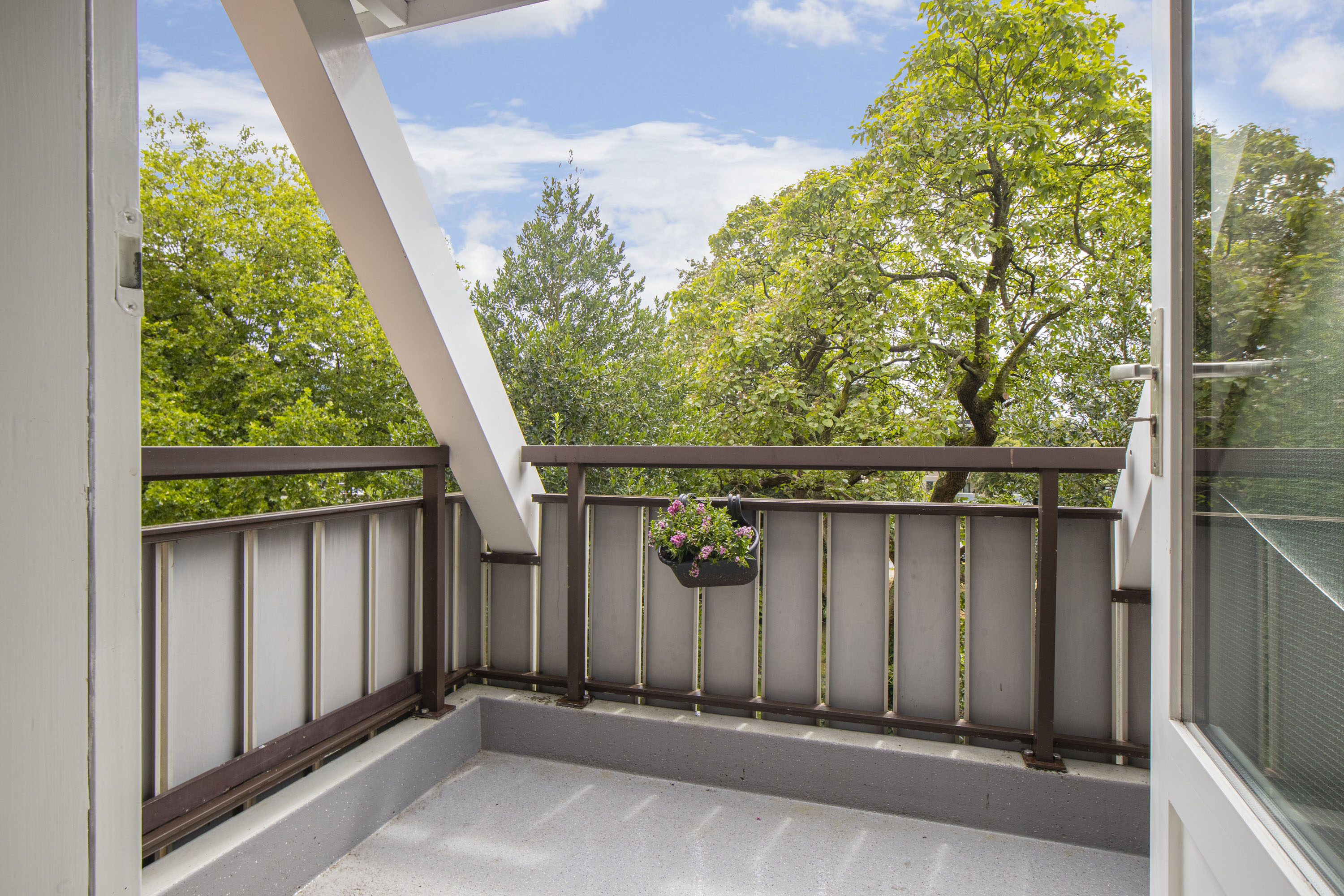 Ruime entree met op maat gemaakte garderobekast. De entree geeft toegang tot een ruime, lichte woonkamer met houten vloer en strak gestucte wanden. Via de openslaande deur stap je zo het balkon op, gelegen op het zonnige zuidoosten — een heerlijke plek om de dag te beginnen met een kop koffie.