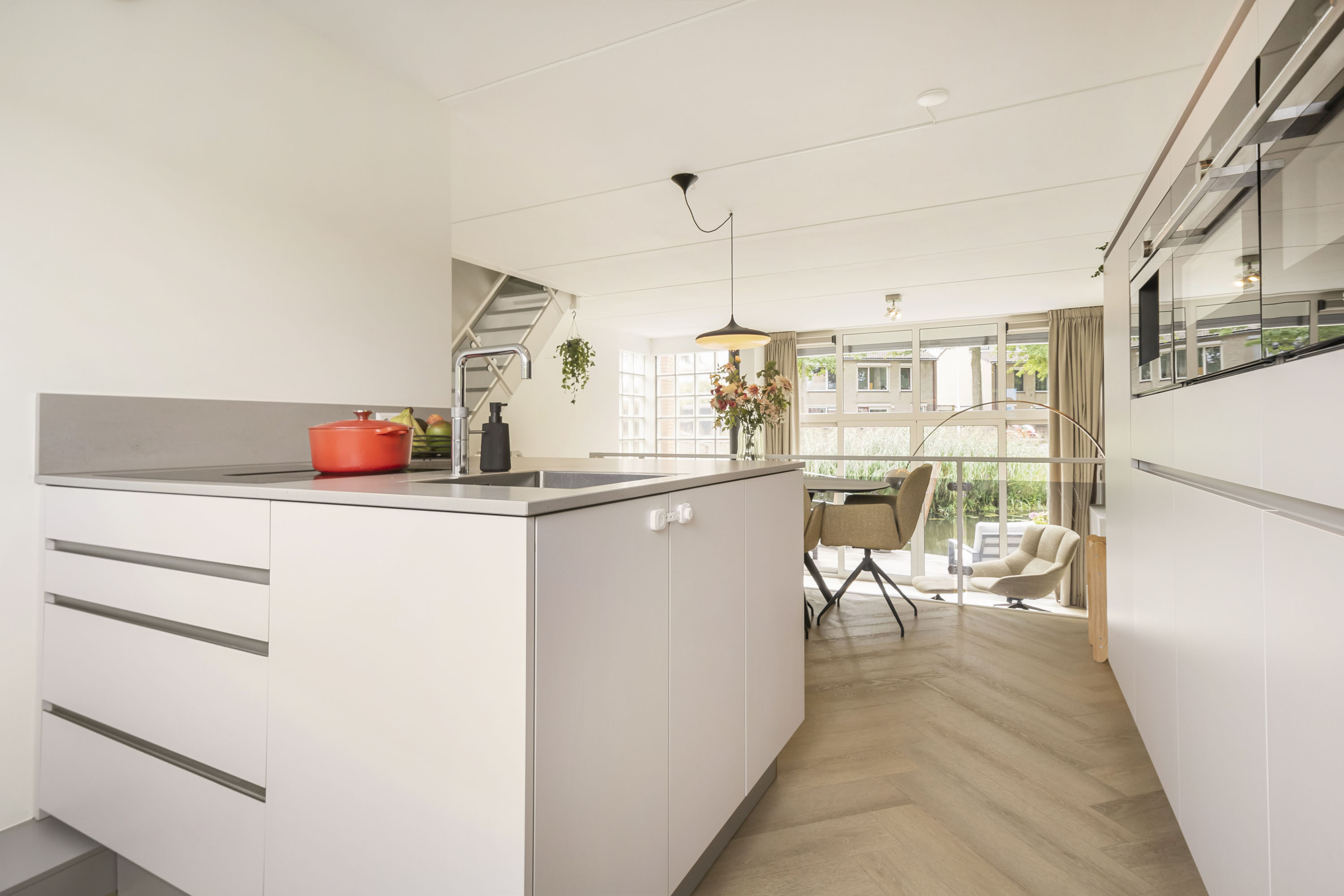 De entree biedt toegang tot de hal met toilet en meterkast. De luxe woon-eetkeuken is voorzien van een combimagnetron (2024), (stoom) oven, vaatwasser, koelkast, vriezer, inductiekookplaat met geïntegreerde afzuigkap en Quooker. De ruime woonkamer heeft een hoog plafond van circa 3,40 meter, een fraaie houtkachel en grote raampartijen met HR++ beglazing die zorgen voor veel lichtinval. Via de schuifpui loop je zo het zonneterras op en kijk je uit over het water.