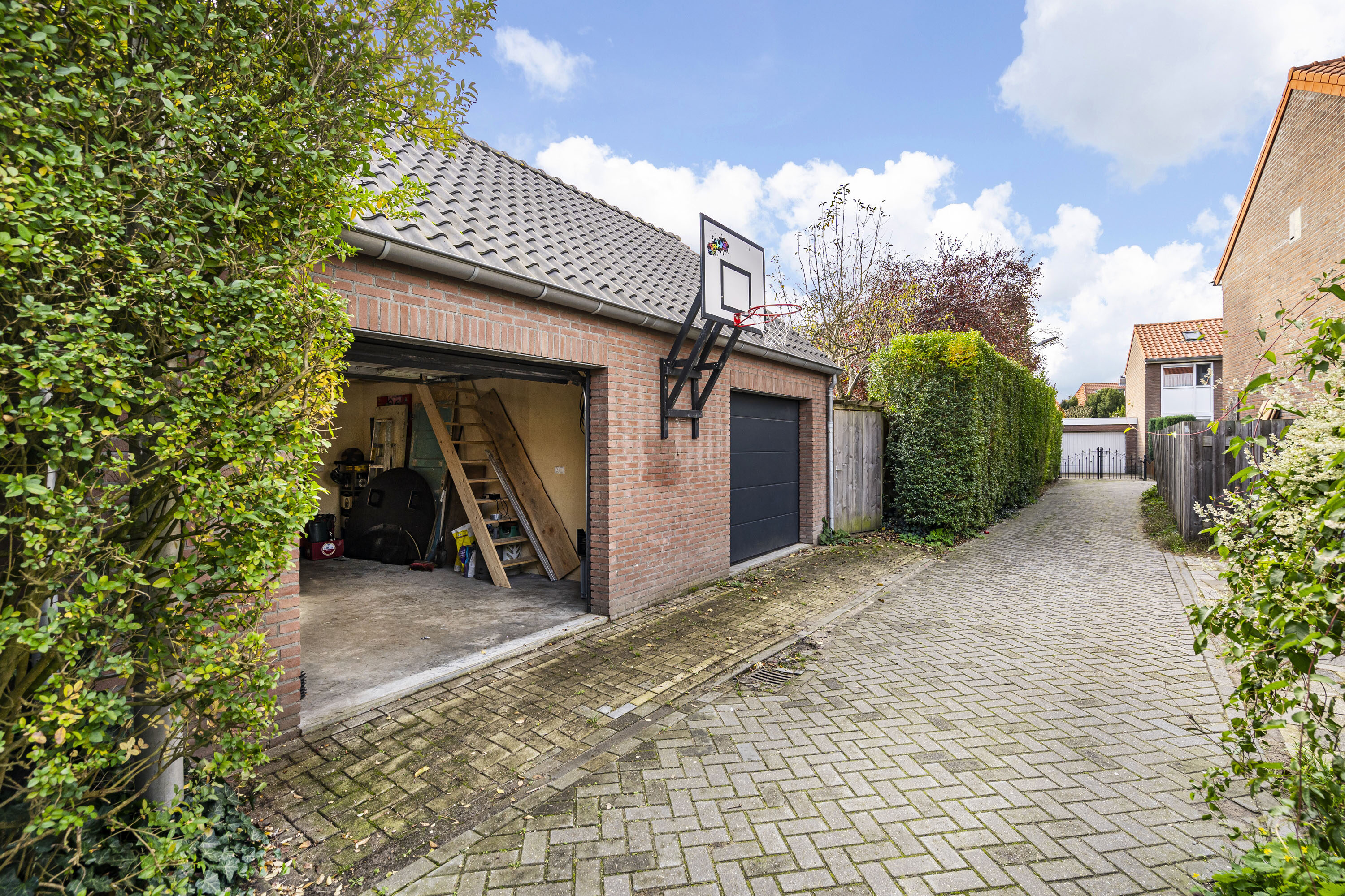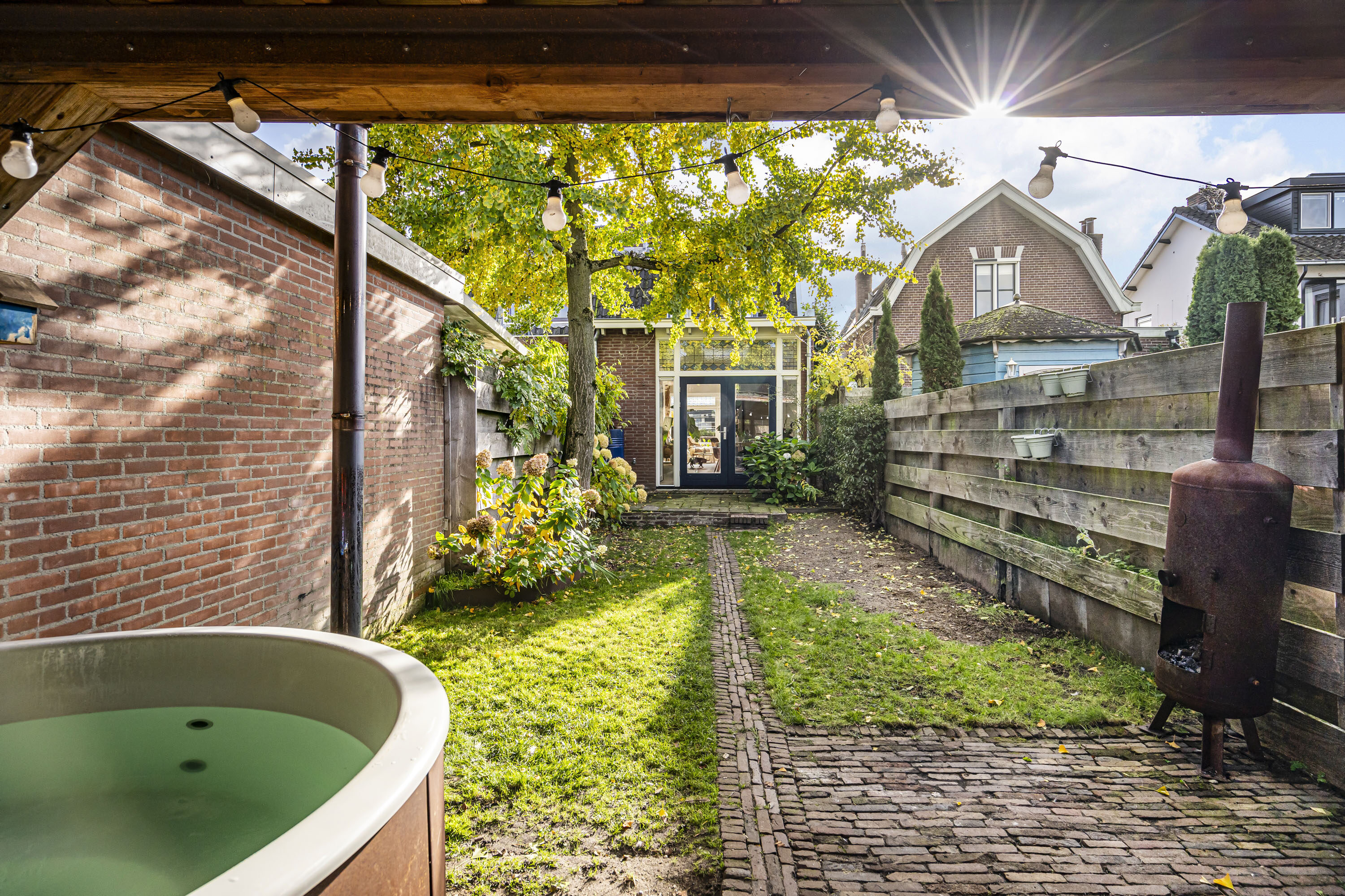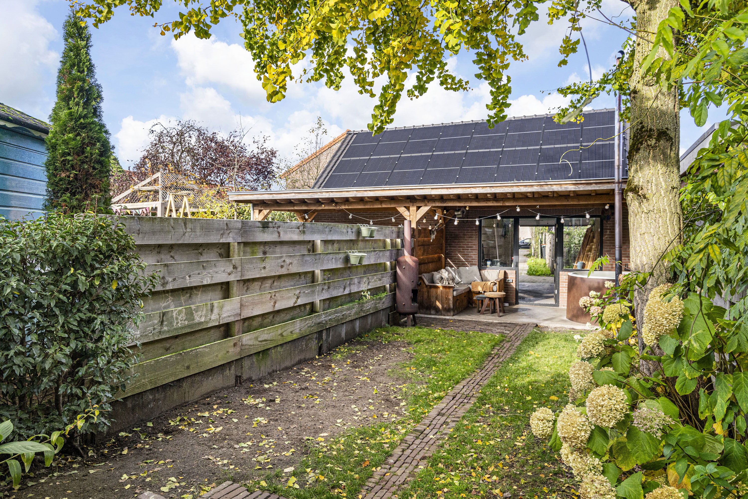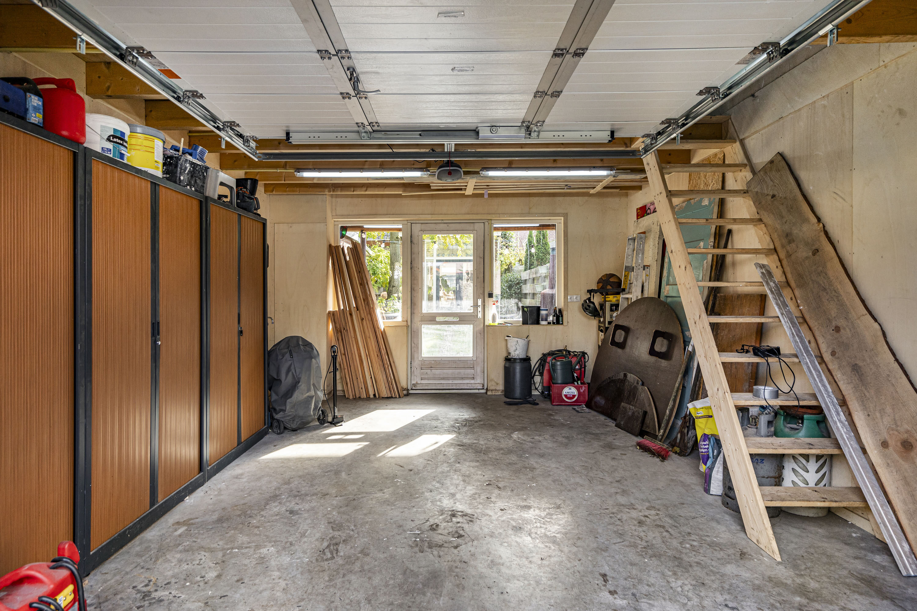 De achtertuin ligt op het noordwesten en biedt zowel zon als schaduw. Achter in de tuin staat een stenen schuur/garage met vliering — ideaal als werkplaats, berging, parkeerplaats of hobbyruimte. Deze is volledig geïsoleerd en voorbereidingen zijn getroffen voor verwarming (er ligt vloerverwarming op de begane grond), water aansluiting en afvoer. Deze ruimte kan hierdoor gemakkelijk in gebruik genomen worden als atelier of woning.
