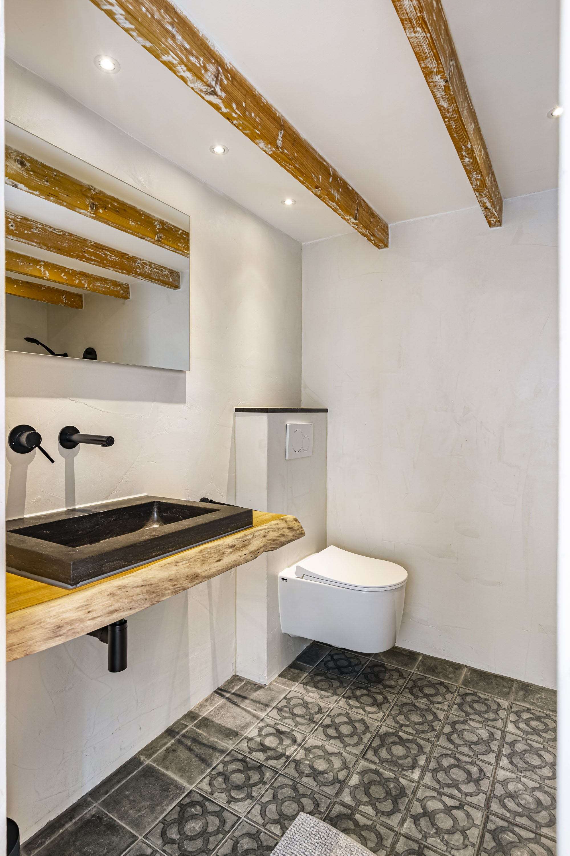 De nette badkamer is voorzien van een douche, wastafel en tweede toilet. Ook hier is vloerverwarming aanwezig.