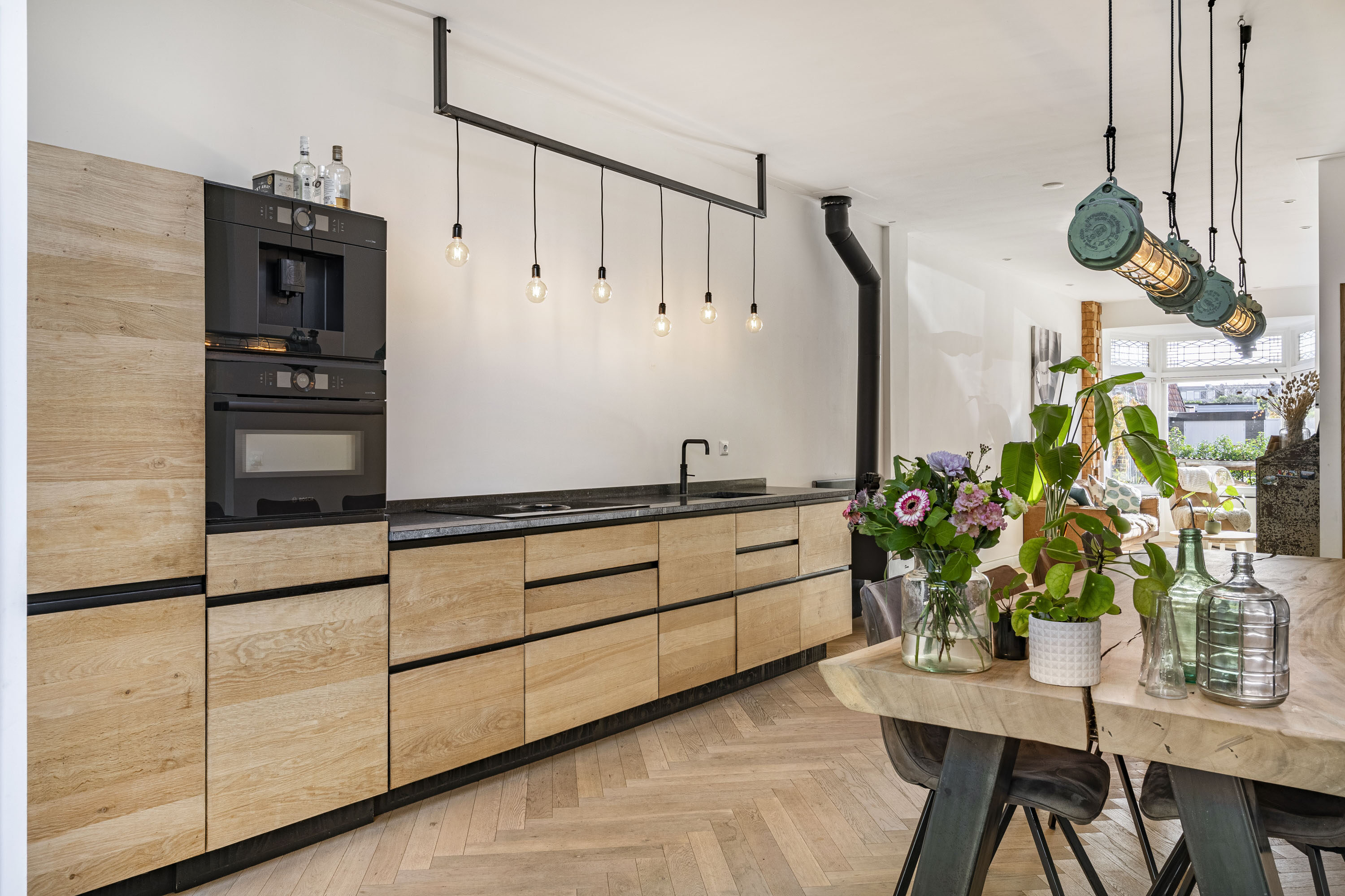 De keuken ligt aan de achterzijde en is uitgevoerd in een moderne rechte opstelling (2020) met inbouwapparatuur. Vanuit hier zijn de openslaande deuren naar de tuin bereikbaar.