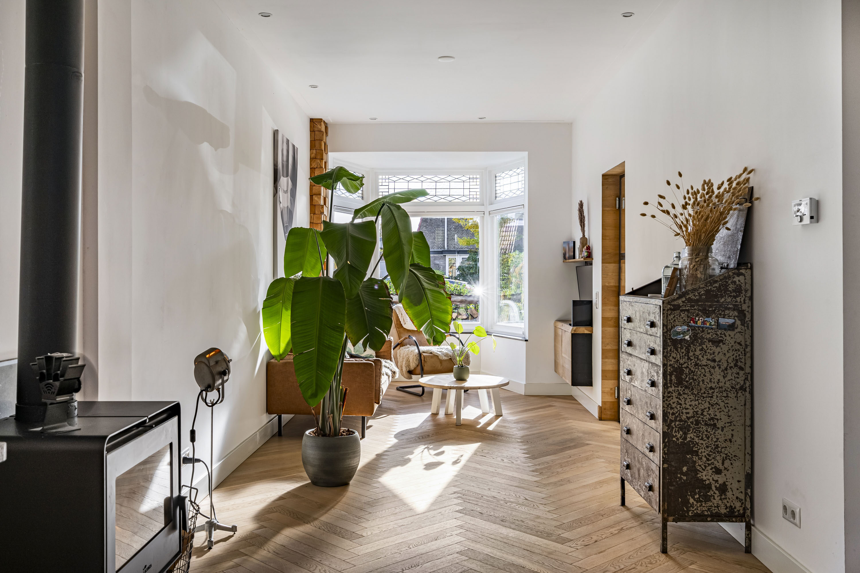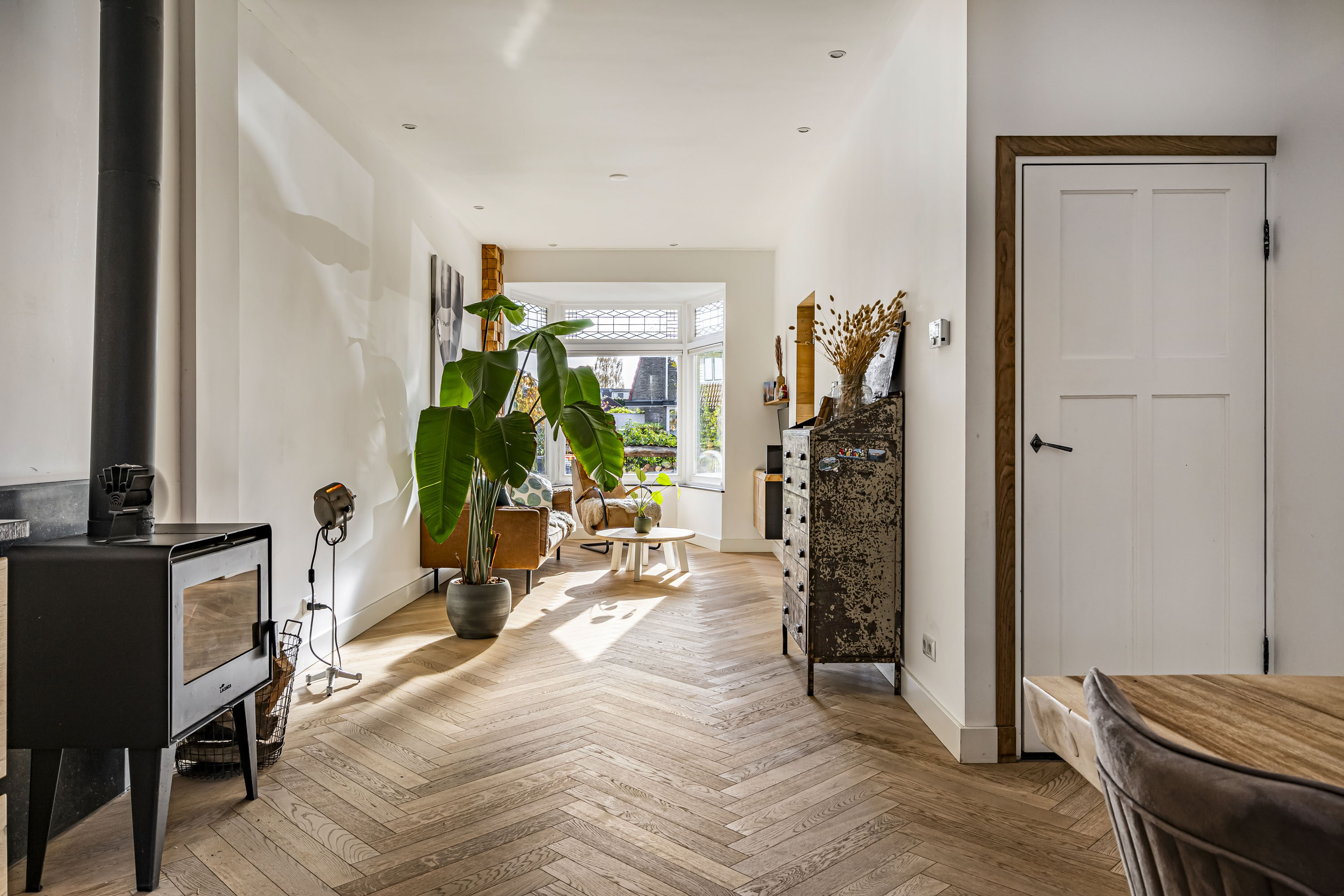 Entree met hal en trapopgang naar de eerste verdieping. De woonkamer is aan de voorzijde gelegen en heeft een sfeervolle houthaard en een karakteristieke erker die zorgt voor extra lichtinval. De vloer, welke afgewerkt is met een eiken visgraat vloer, is geïsoleerd, uitgevoerd in beton en voorzien van vloerverwarming.