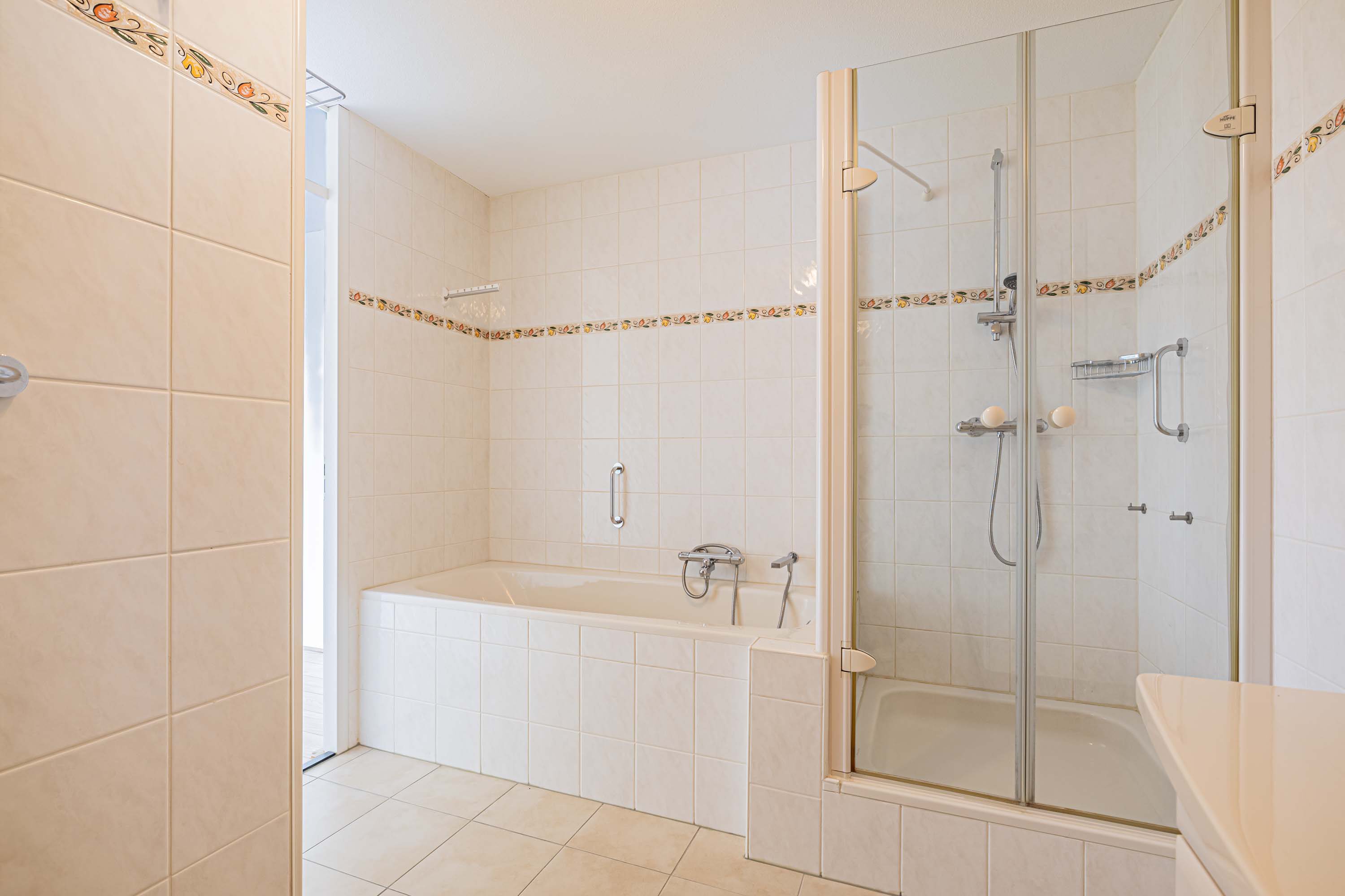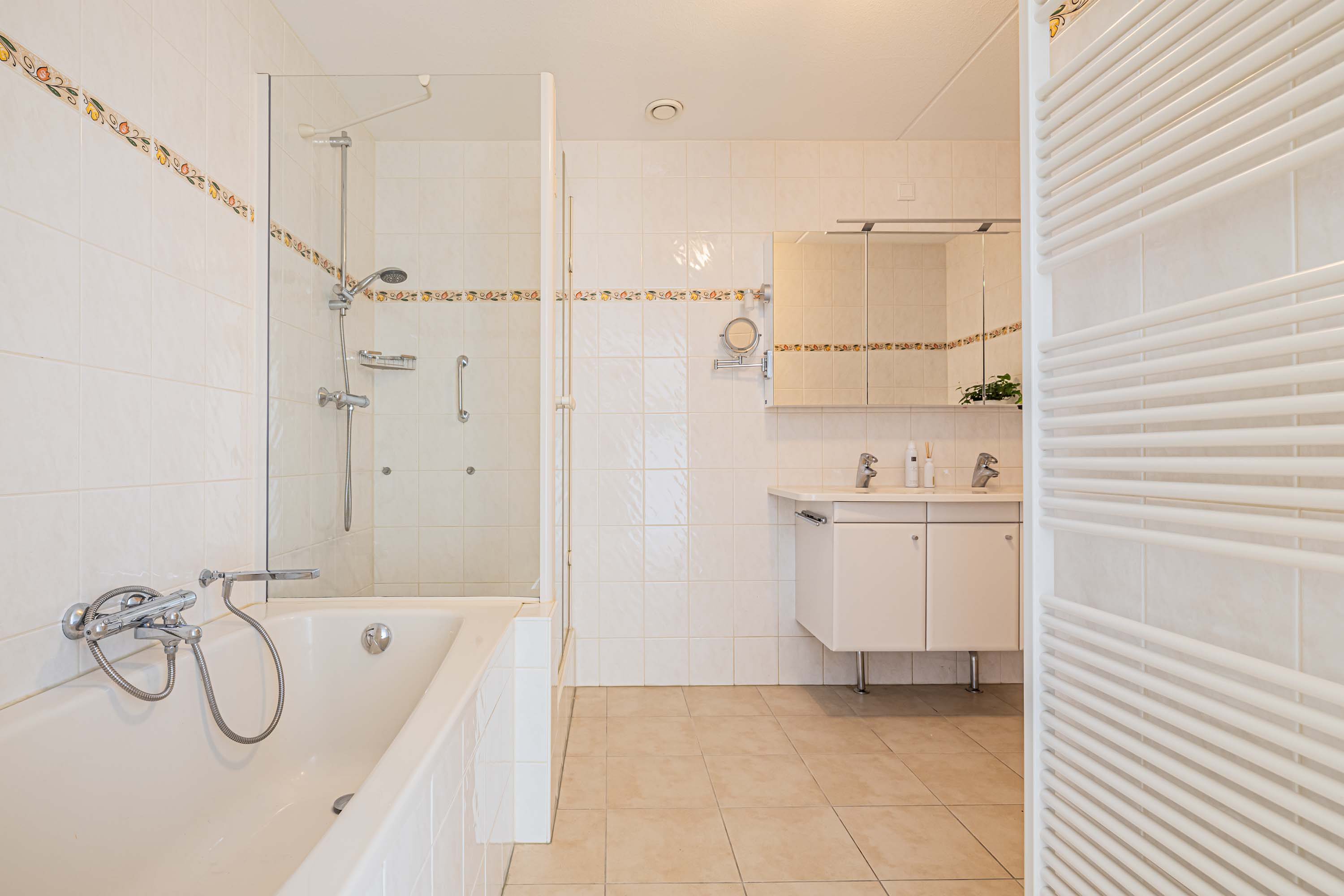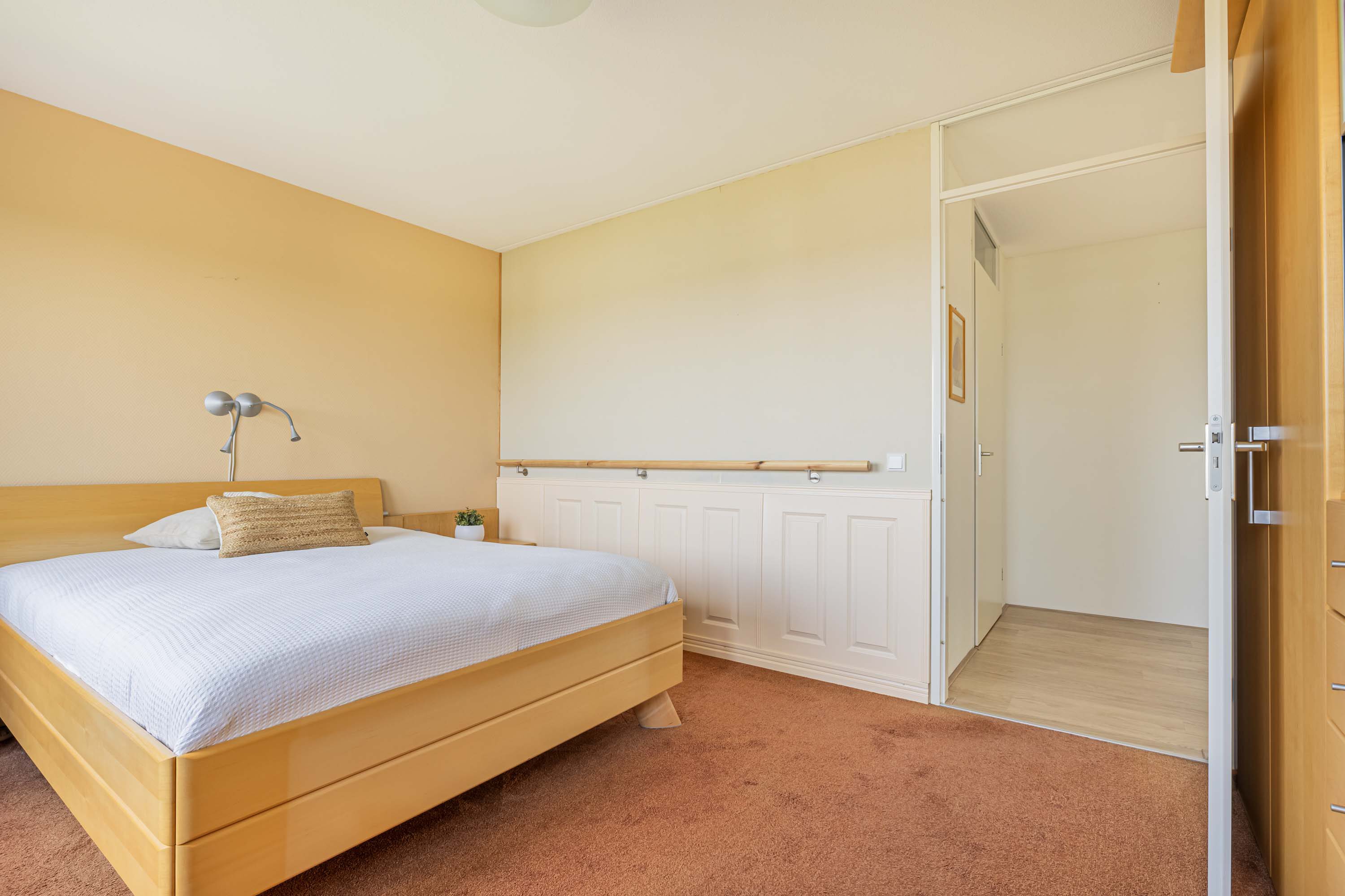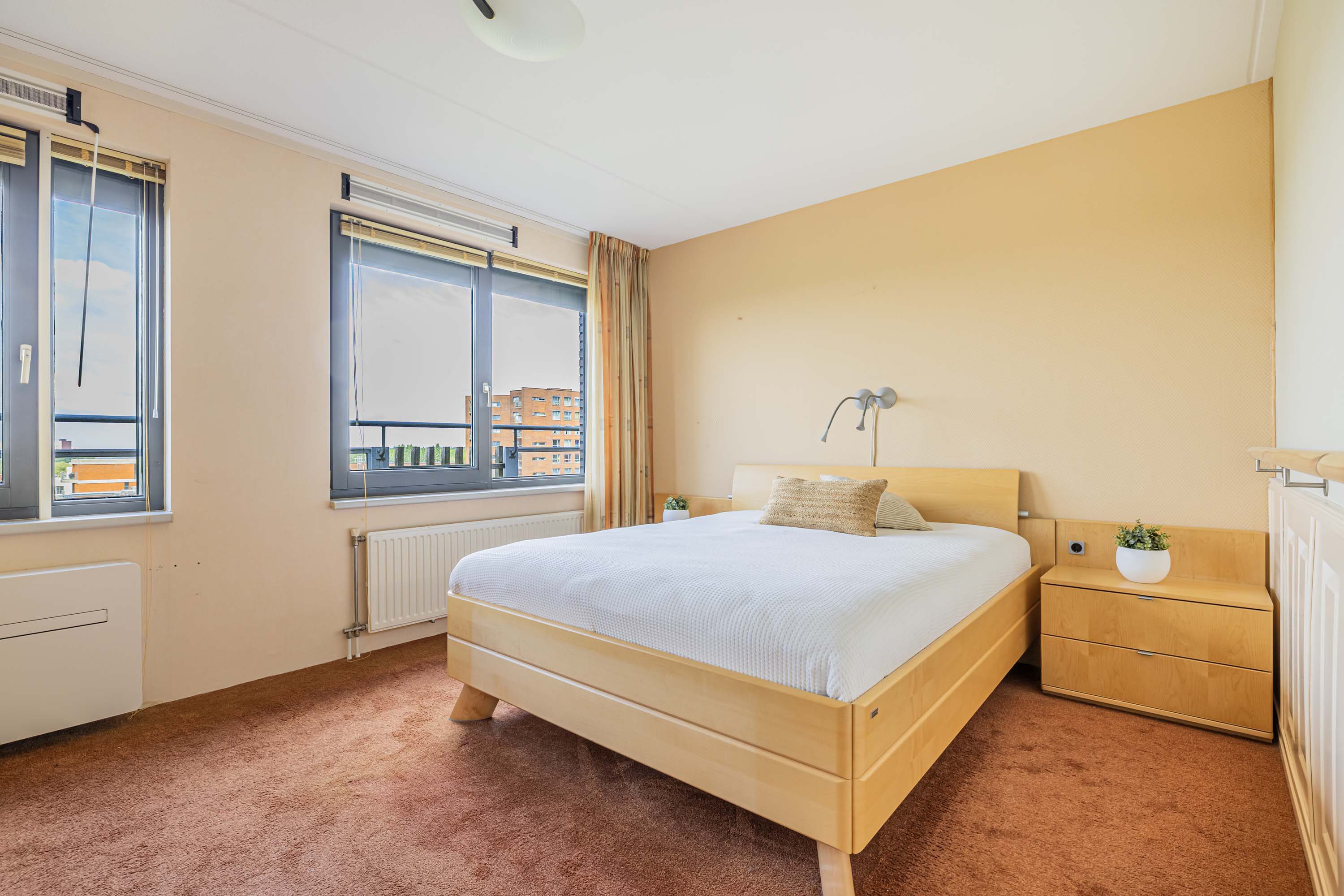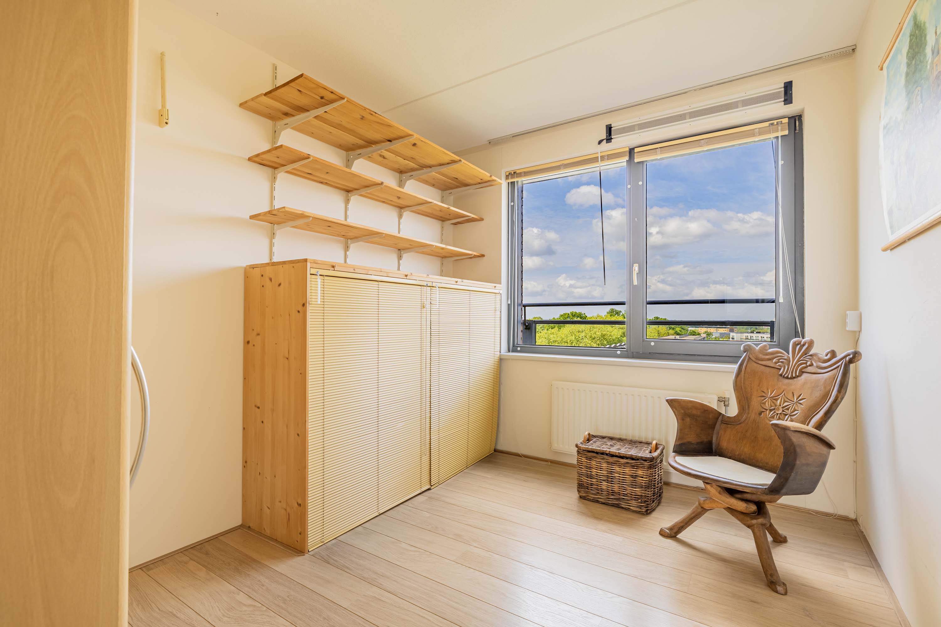 Aan de andere kant van de hal bevindt zich de ruime keuken, voorzien van inbouwapparatuur uit 2007. Vanuit de keuken heb je toegang tot een intieme buitenruimte aan de noordzijde, waar je geniet van een mooi uitzicht door de hoogte van het appartement. De drie slaapkamers bieden flexibiliteit; één slaapkamer beschikt over airconditioning, een tweede over screens en de derde over een rolluik, zodat aan elk comfort is gedacht. Verder zijn er een complete badkamer, een separaat toilet en een praktische bergruimte aanwezig, waar ook de aansluiting voor de wasmachine, cv-installatie en mechanische ventilatie te vinden zijn.