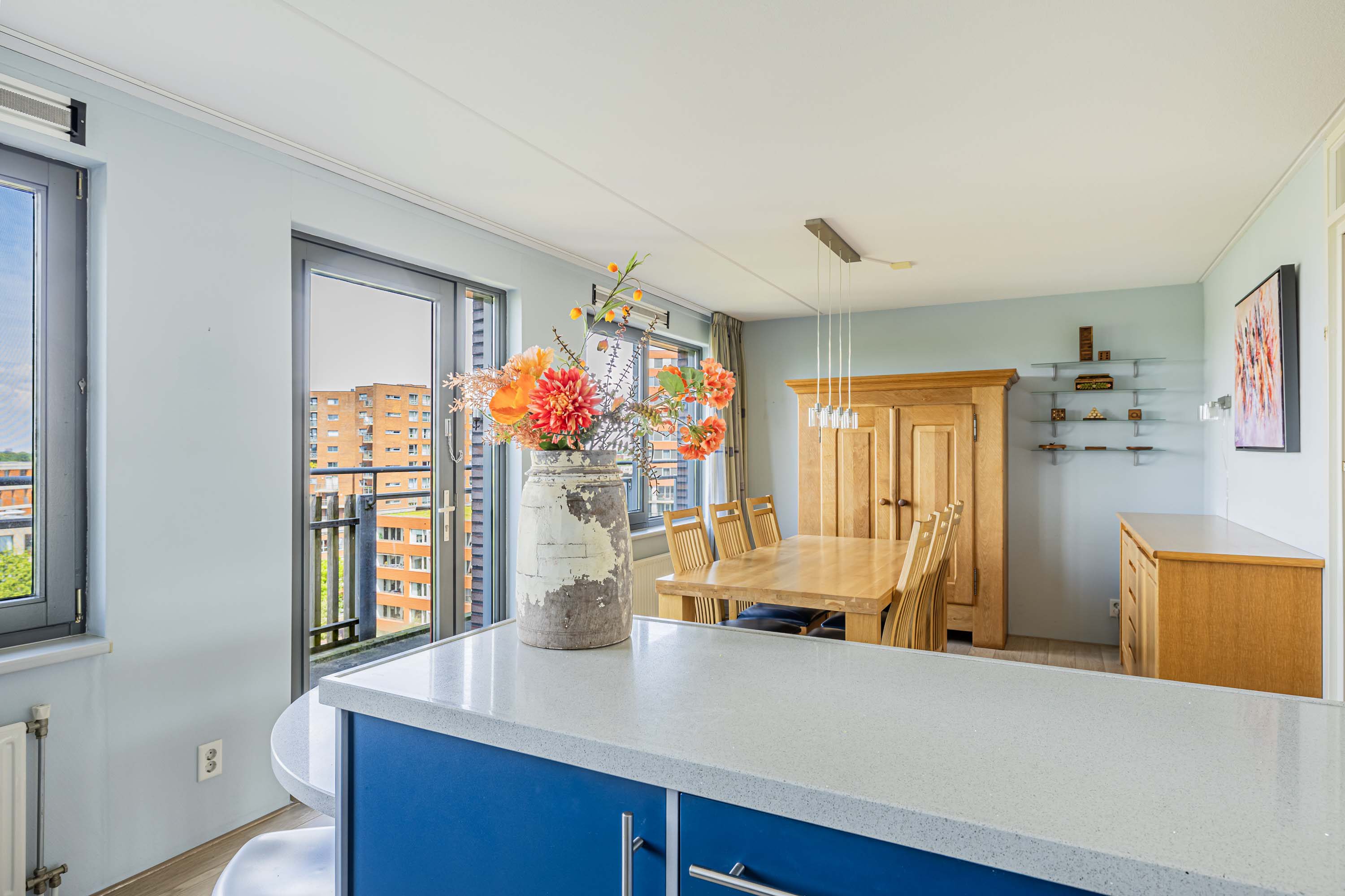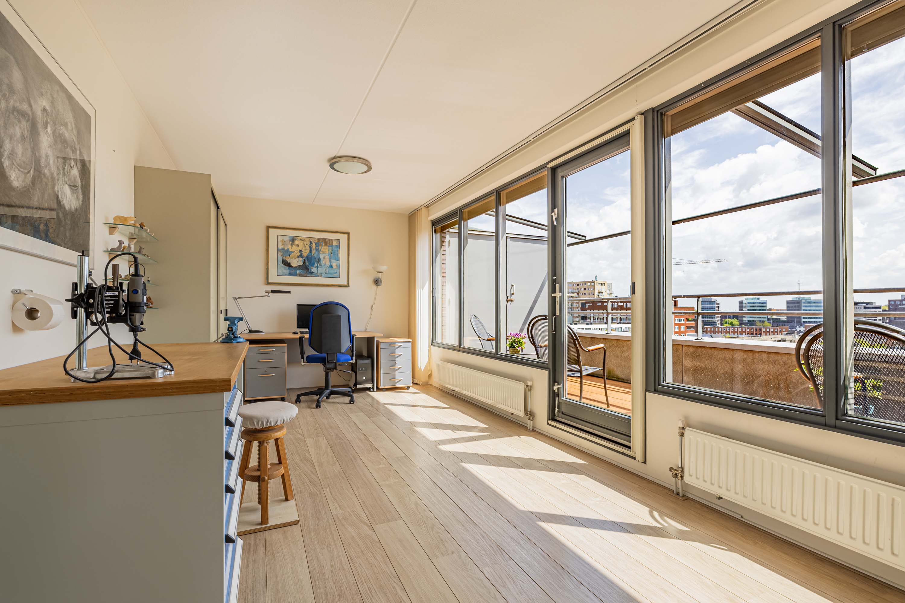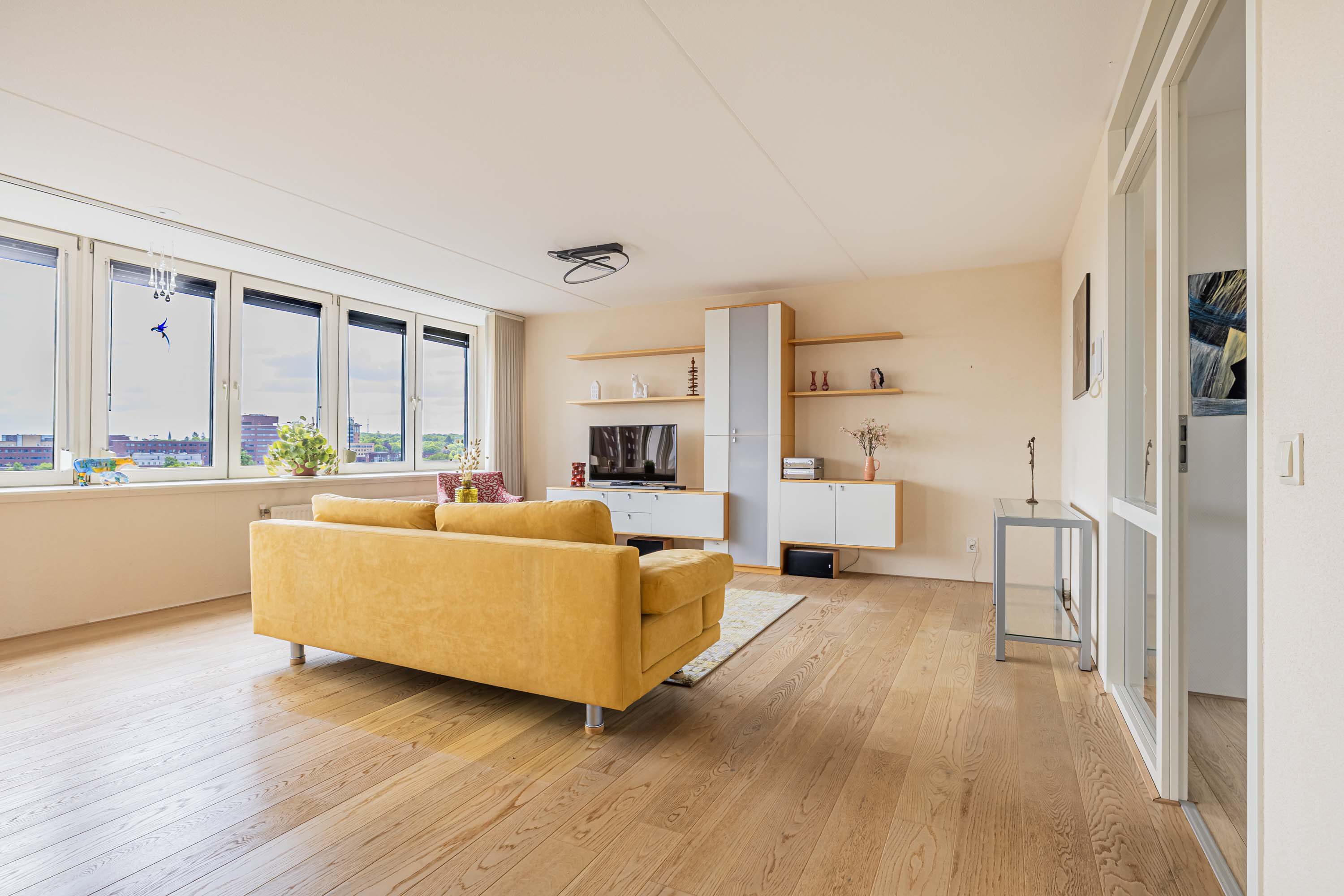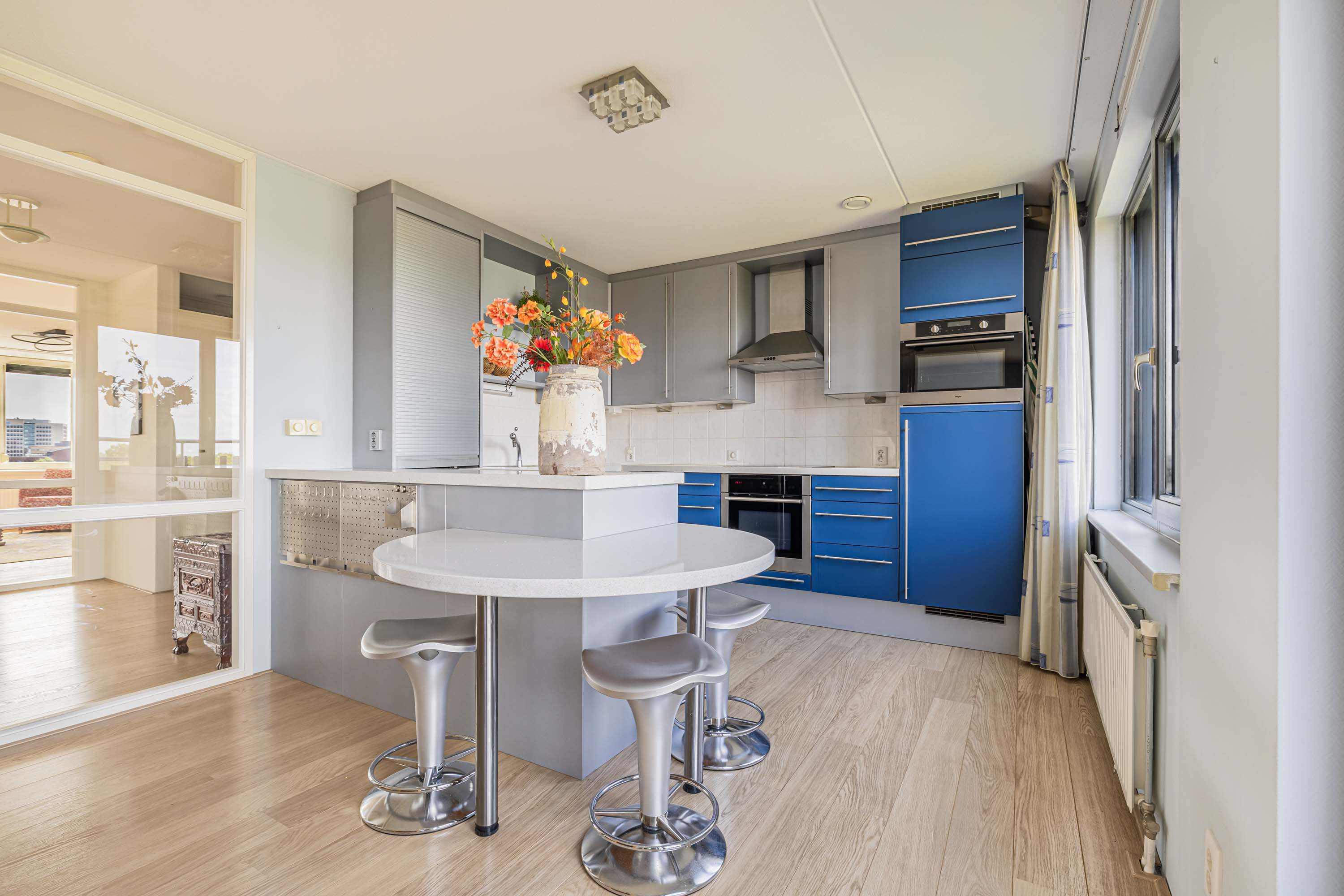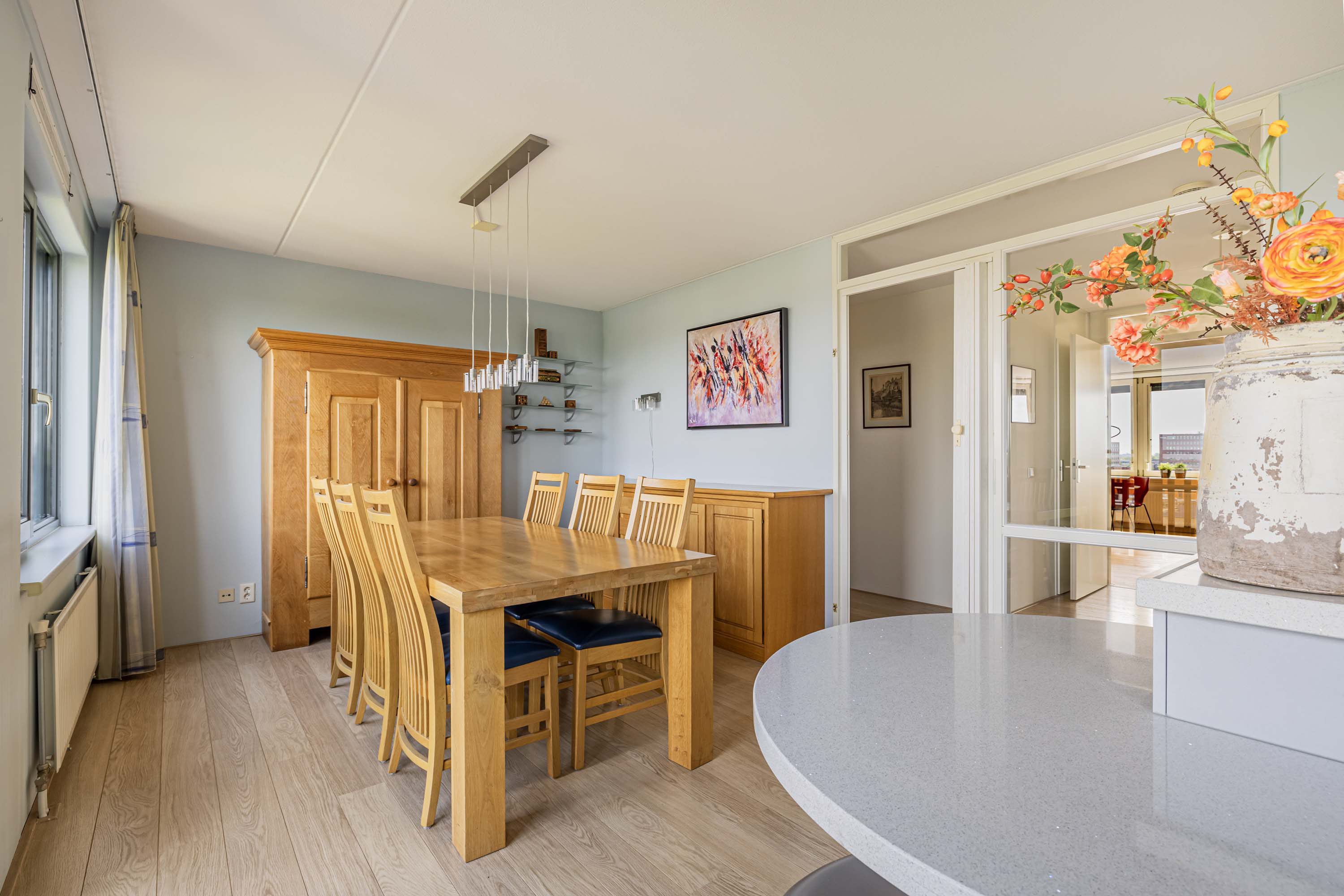 De lichte woonkamer, gesitueerd op het zonnige zuiden, vormt de centrale plek van het penthouse. Dankzij de grote raampartijen geniet je hier de hele dag van prachtig natuurlijk licht en een ruimtelijke sfeer. De massief eikenhouten vloer geeft de ruimte een warme en stijlvolle uitstraling, en de aanwezige airco zorgt voor een prettig binnenklimaat.