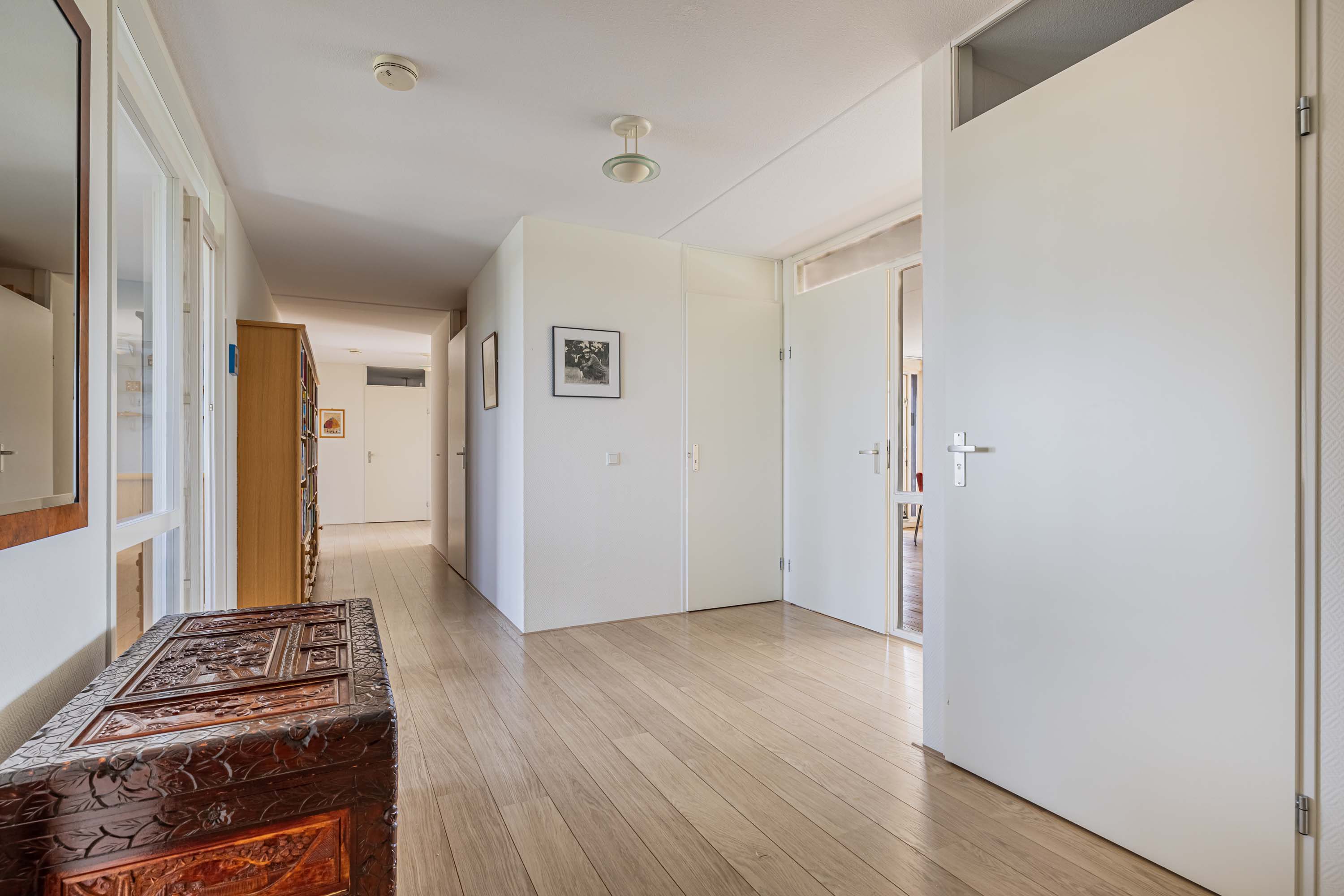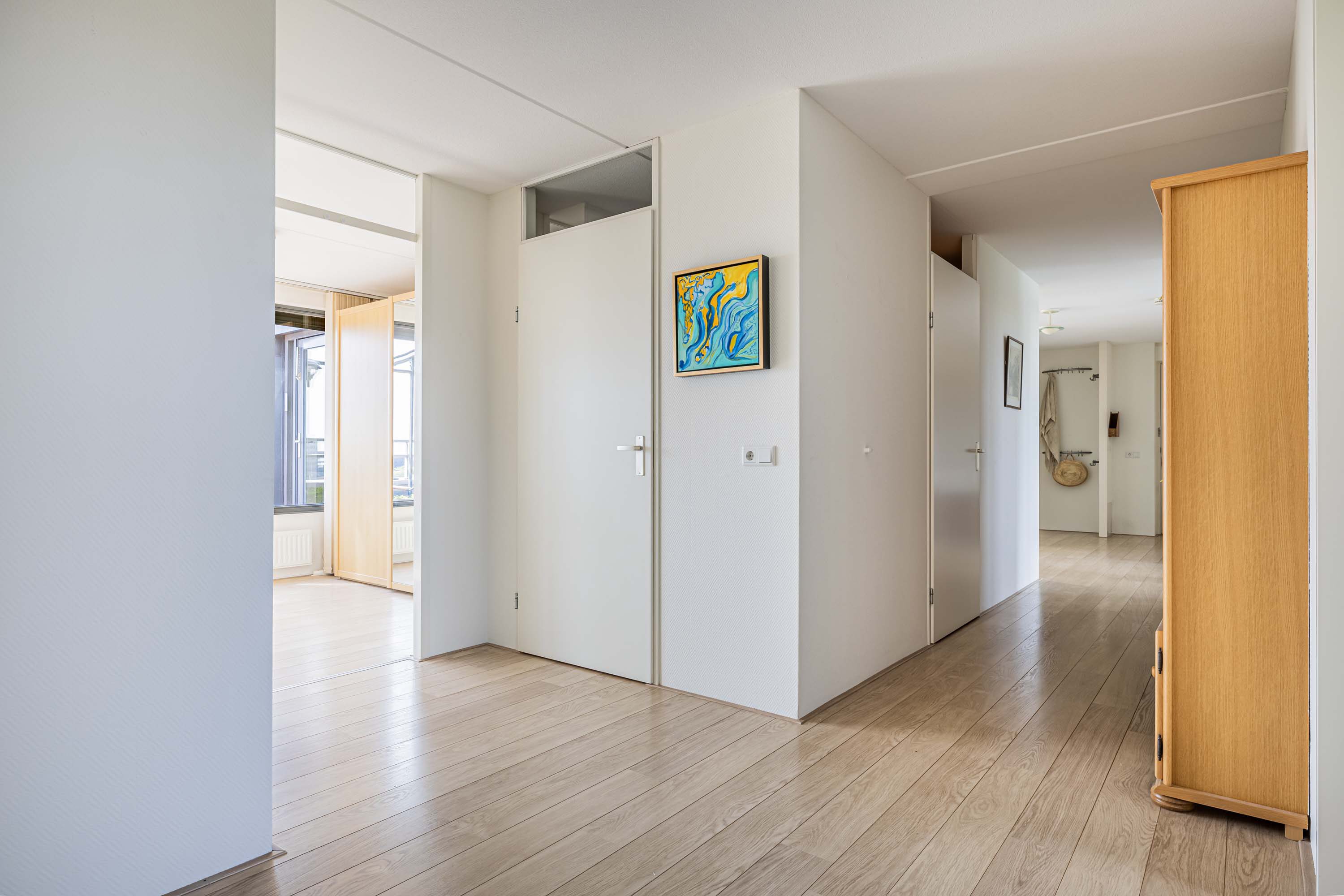 Met de lift bereik je de entree van het penthouse, waar je meteen wordt verwelkomd door een ruime hal die toegang biedt tot alle vertrekken. De lange hal creëert een open en overzichtelijke indeling en versterkt het gevoel van ruimte in de woning.