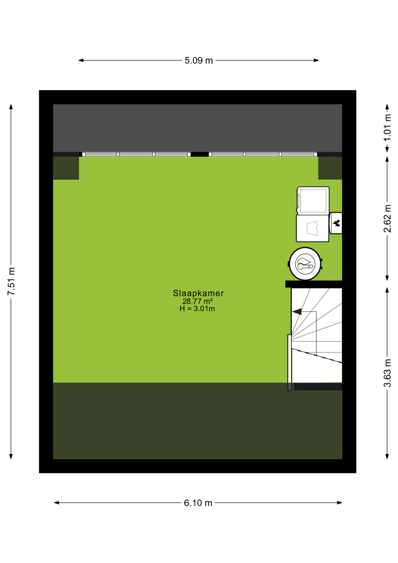 De tweede verdieping is te bereiken via een vaste trap en biedt veel mogelijkheden. De tweede verdieping kan gebruikt worden als slaapkamer of als opbergruimte. Op de tweede verdieping zijn de warmtepomp, de wasmachineaansluiting en drogeraansluiting. Door de grote dakkapel op deze verdieping is er veel lichtinval en ruimte.
