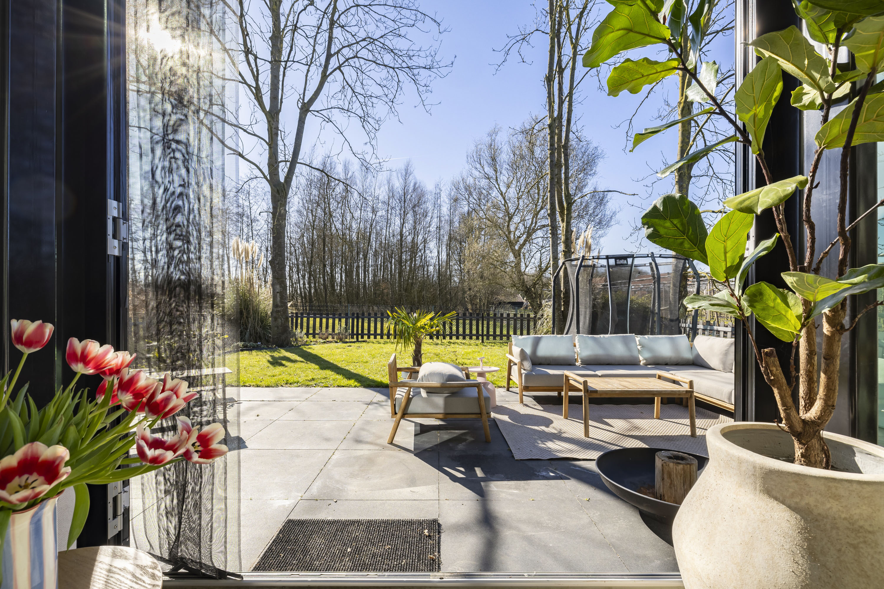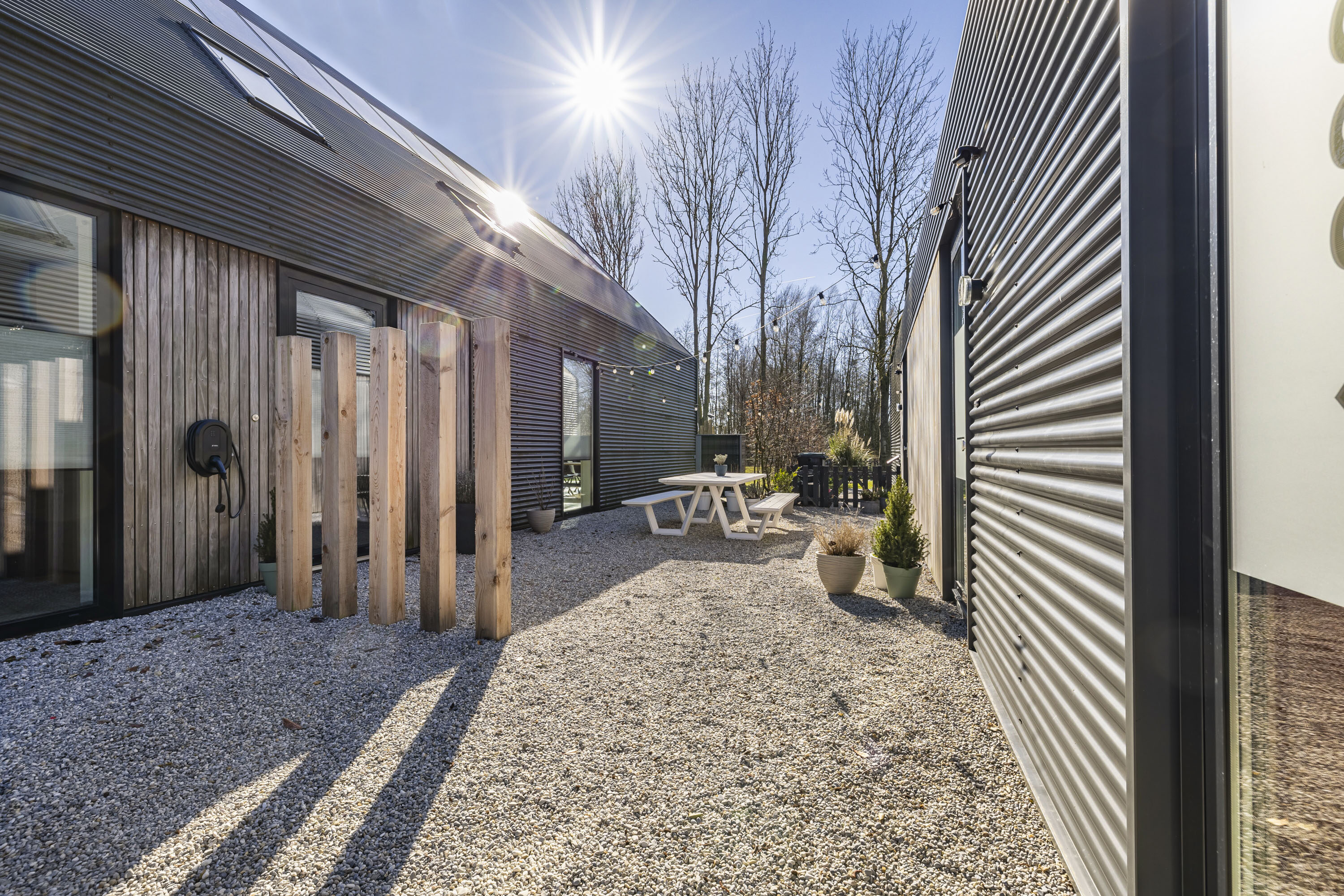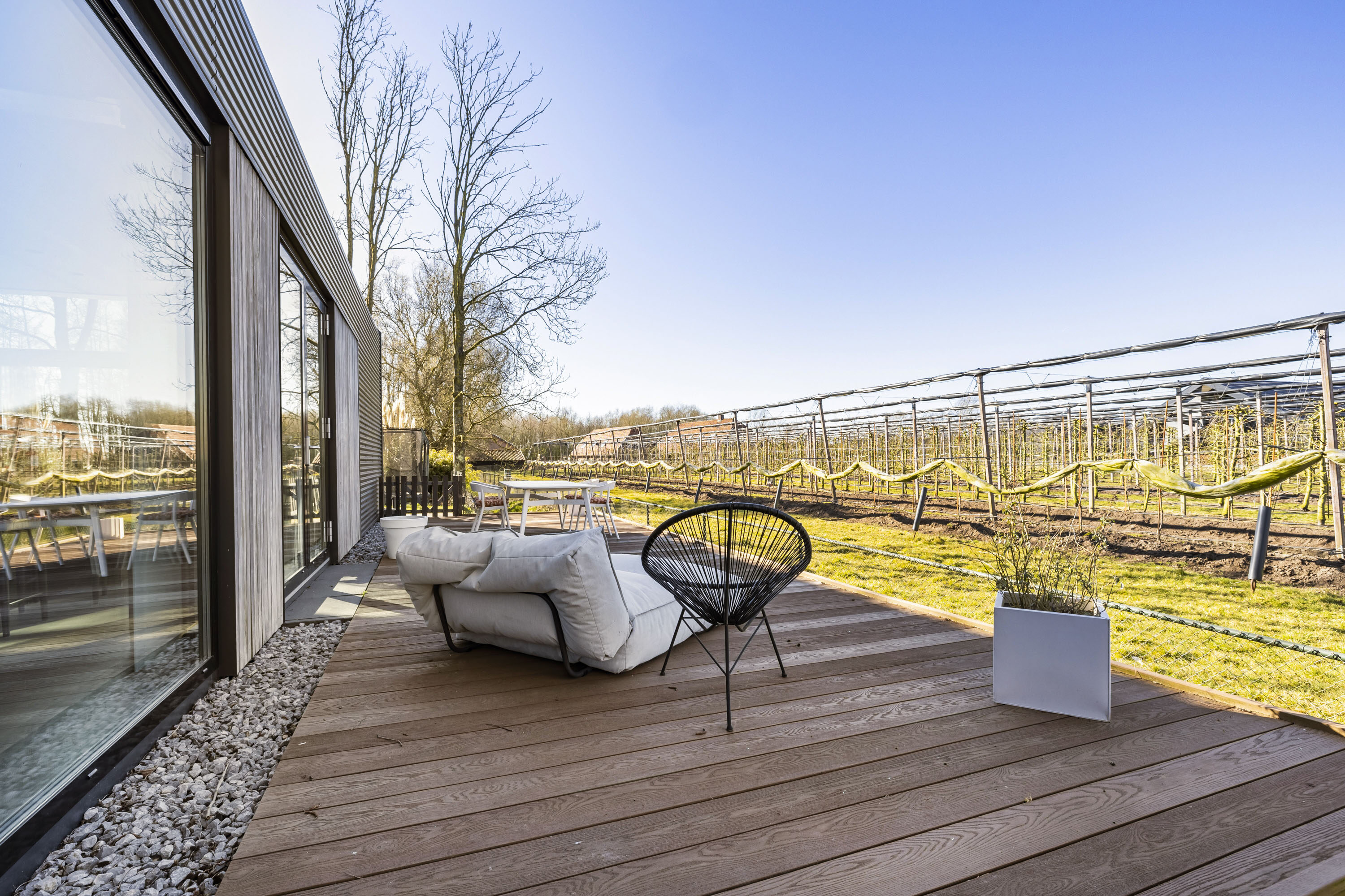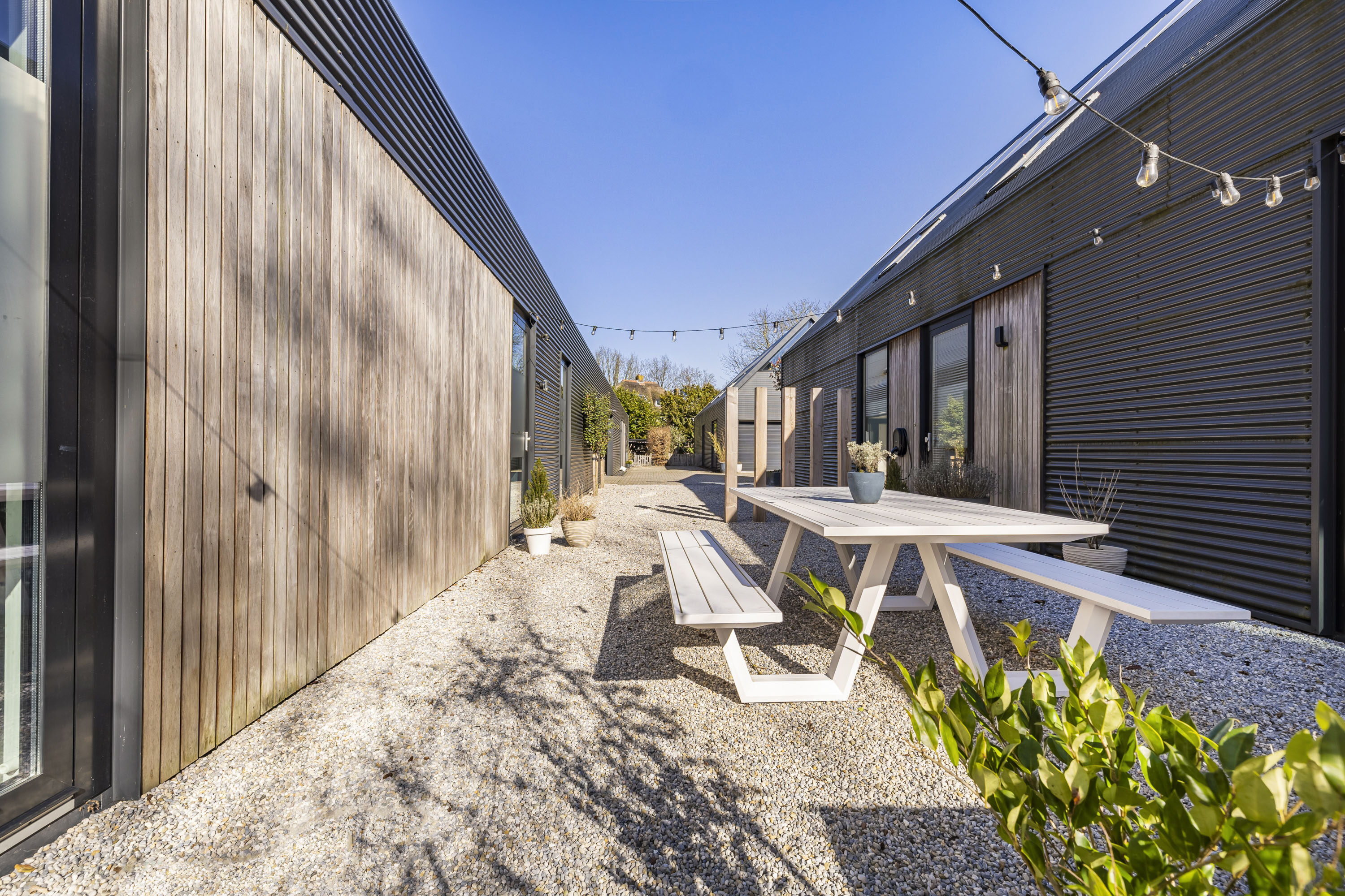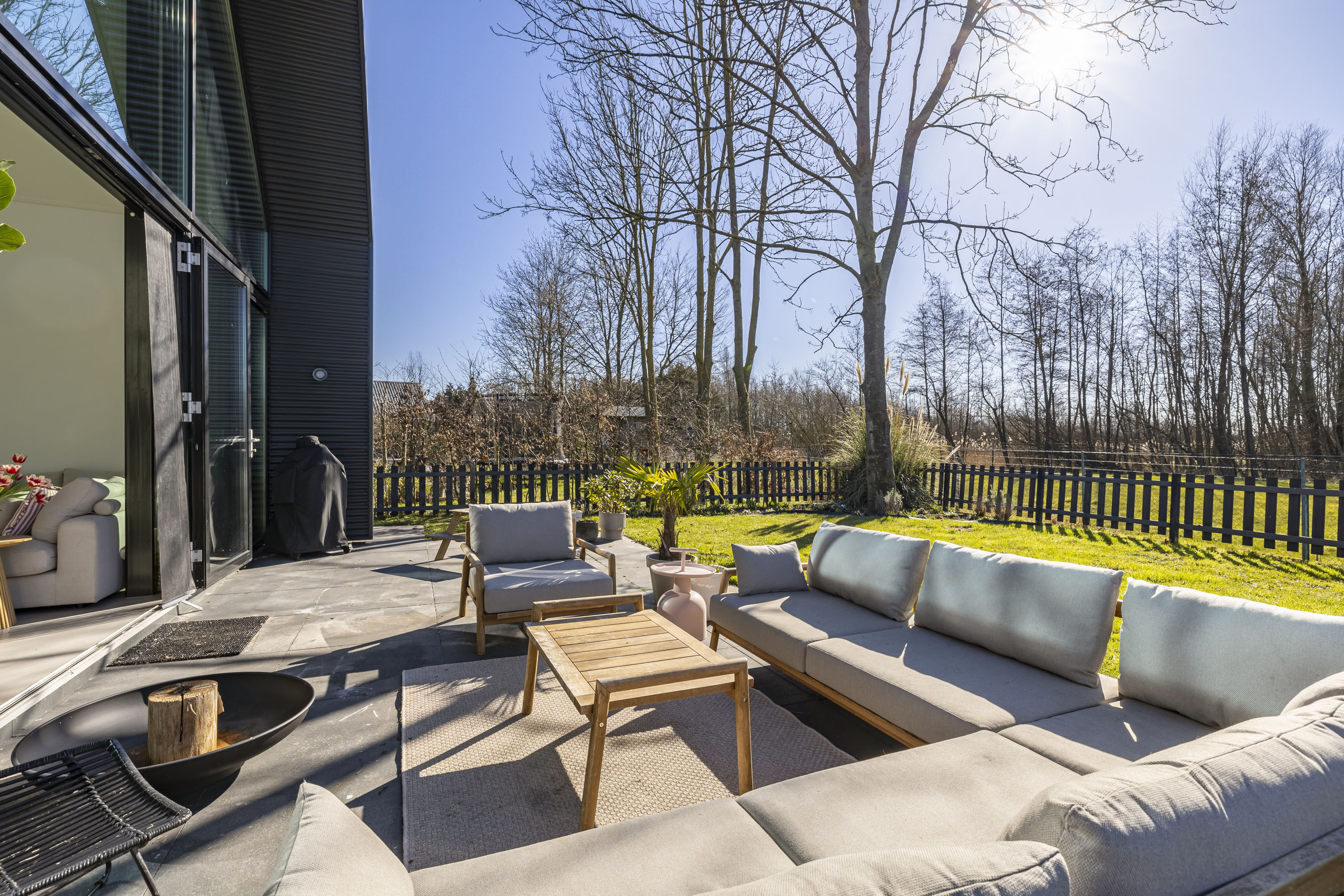 Met openslaande deuren vanuit de keuken bereik je de vlonder die is aangelegd aan de zijkant van de woning. Een onderhoudsvrije vlonder gemaakt van composiet. Het skelet van de vlonder is gemaakt van hardhout.