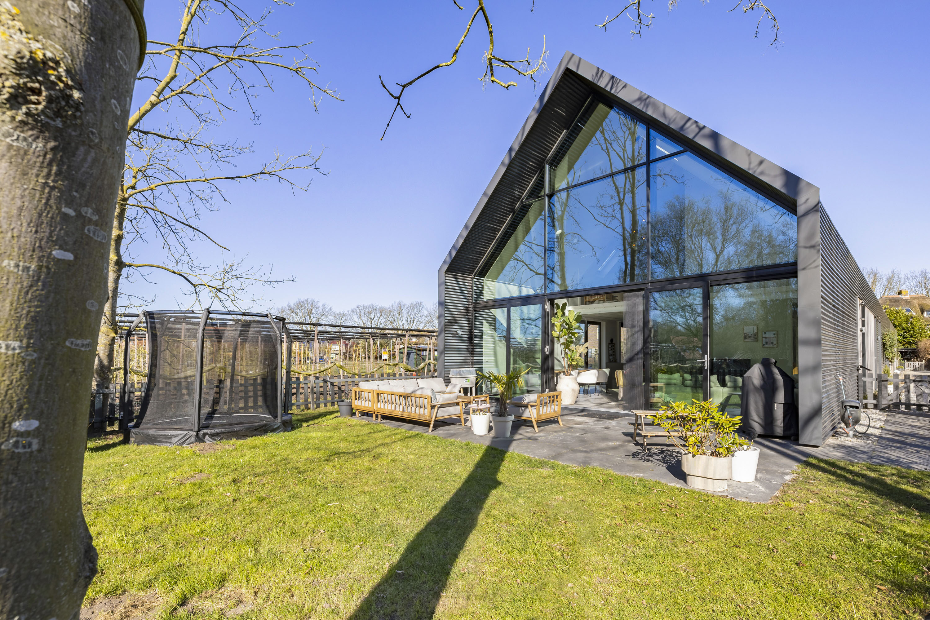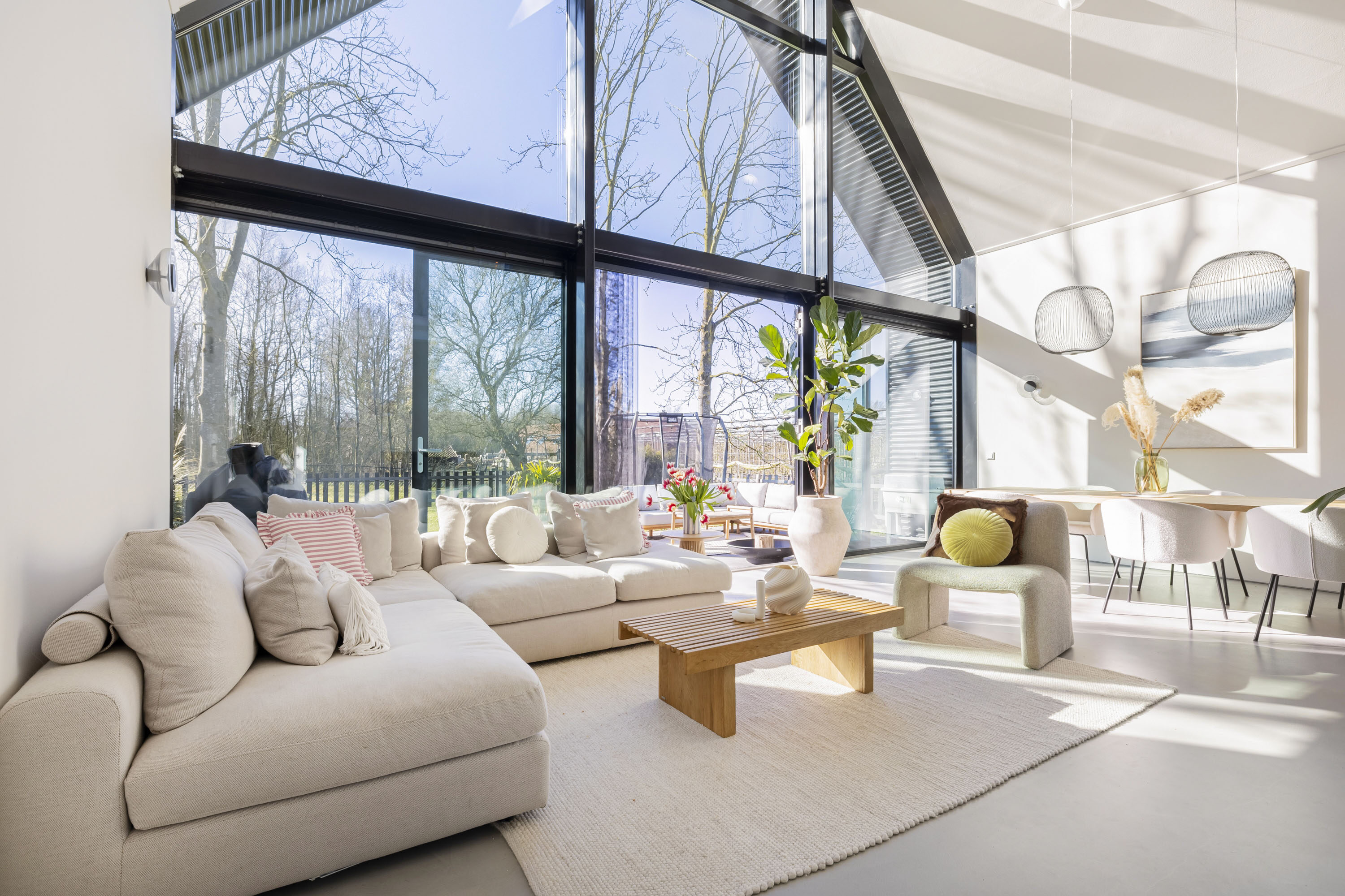 De woonkamer is aan de zuidzijde van de woning gelegen. De achtergevel is uniek met haar hoogte van bijna 7 meter in de punt en de grote glasoppervlaktes. De pui is van aluminium, heeft triple beglazing en is ook nog eens zonwerend. De dubbele openslaande deuren zorgen ervoor dat binnen en buiten samengevoegd kan worden. De achtertuin is op het zuiden gelegen, heeft vrij zicht en is omringd door groen.