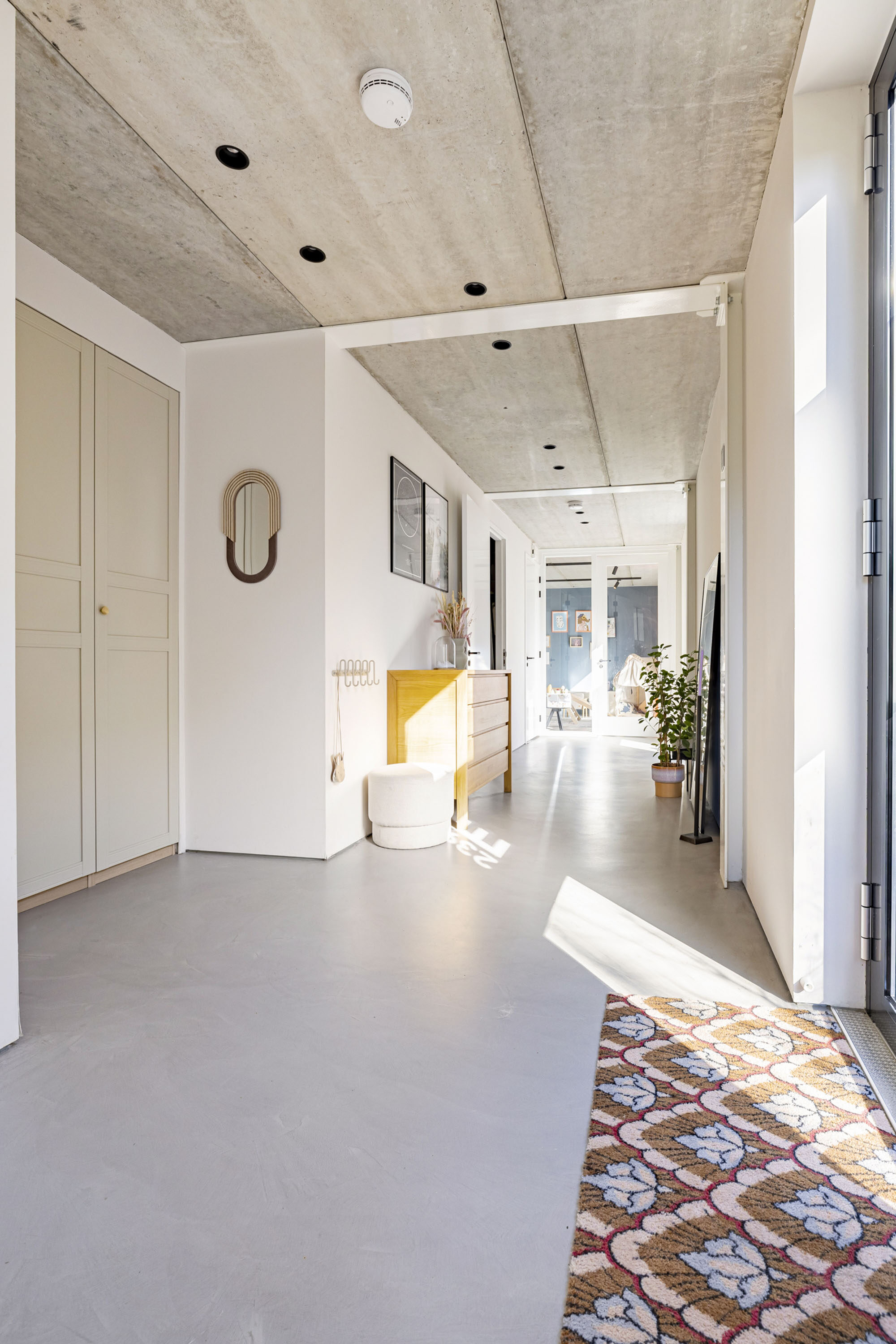De woning is te betreden vanaf de zijkant van de loft. Een tweetal voordeuren geeft de mogelijkheid om het wonen en zakelijke deel van elkaar gescheiden te houden. Bij binnenkomst merk je gelijk de rust, de fijne lichtinval en de luxe van deze woning.
