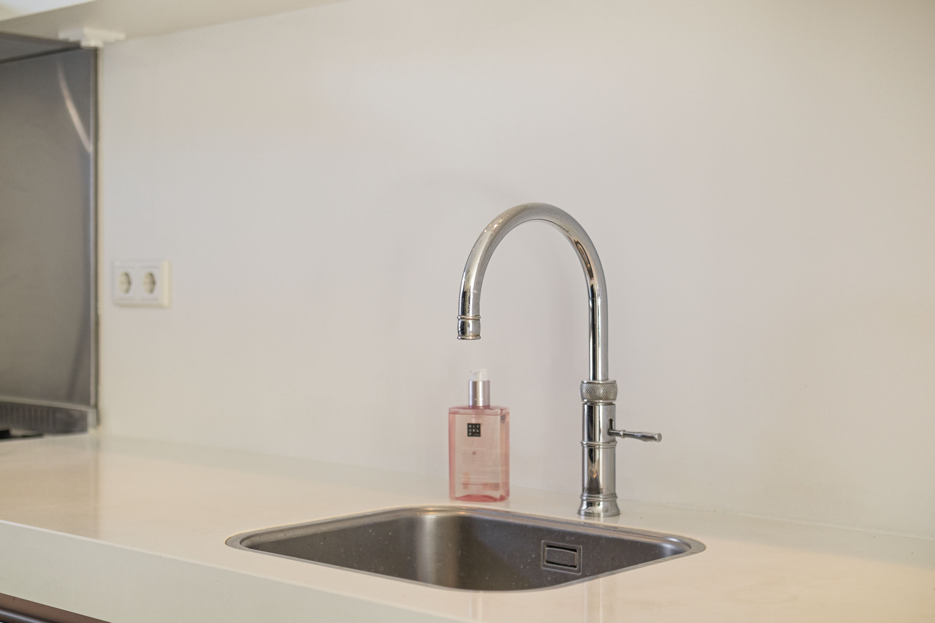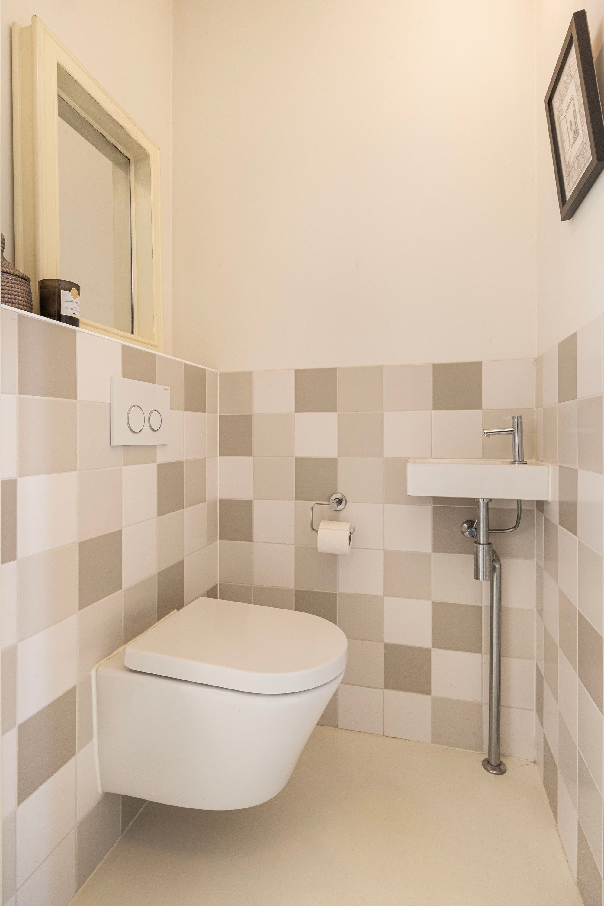 De vloer is afgewerkt met een gietvloer en voorzien van comfortabele vloerverwarming. De witte wandafwerking maakt dat de ruimte licht en ruimtelijk aanvoelt.
