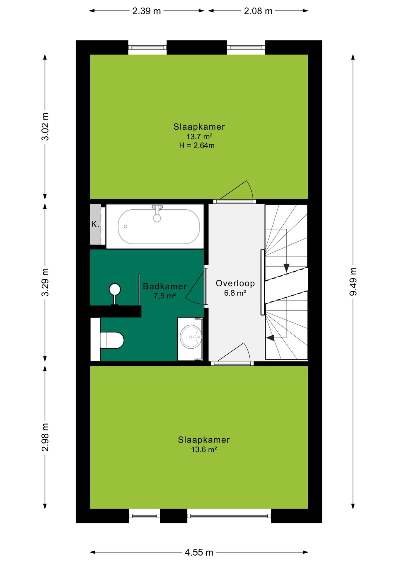Via de trap in de woonkamer is de overloop van de eerste verdieping te bereiken. De eerste verdieping heeft twee slaapkamers en een badkamer. Eén slaapkamer is aan de voorzijde gelegen en de andere slaapkamer is aan de achterzijde gelegen en beide zijn over de volle breedte van de woning gesitueerd. De slaapkamer aan de voorzijde heeft zeer grote raampartijen. Een prettige lichte kamer met een diepe vensterbank. De badkamer in het midden van deze verdieping is zeer ruim en uitgerust met alle gemakken, te weten: