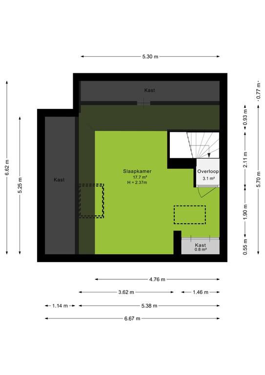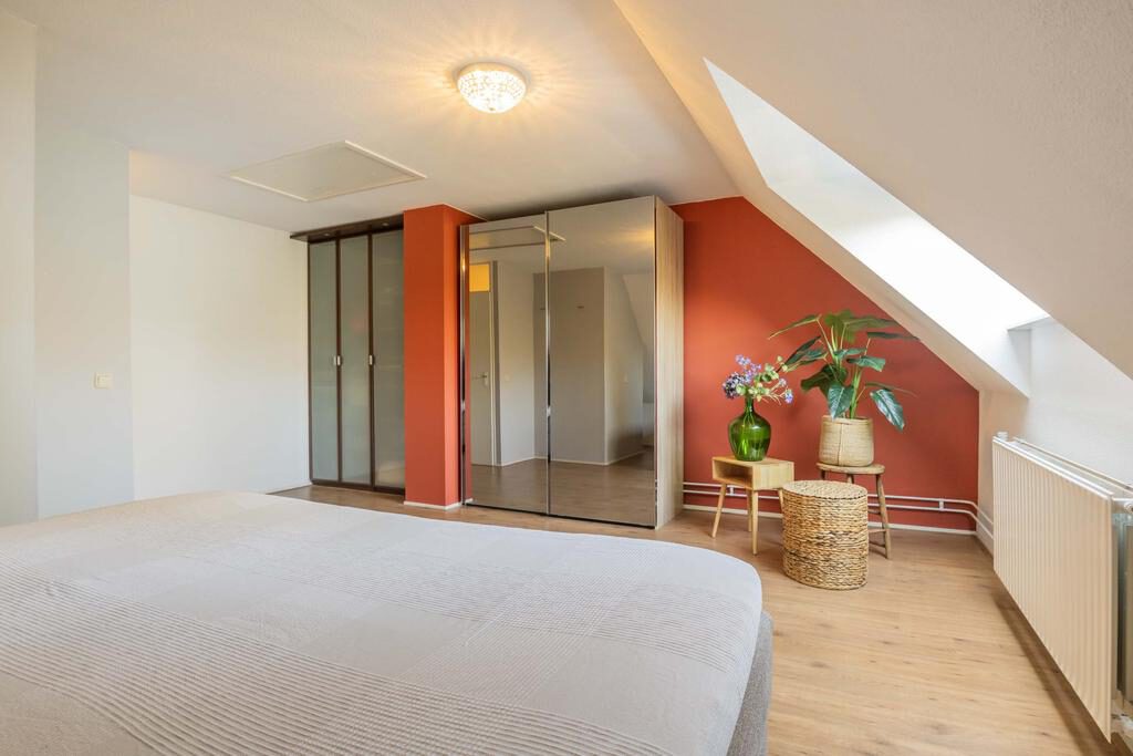 Via een vaste trap bereik je de grote tweede slaapkamer. Deze slaapkamer is keurig afgewerkt en heeft een vaste kast. Het dakraam zorgt voor voldoende daglicht. Tevens is hier een vlizo trap aanwezig naar de vliering die extra opslagruimte biedt.