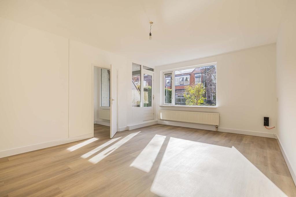 Vanuit de woonkamer is er toegang tot de slaapkamer. Vanuit de slaapkamer kijk je uit over je eigen tuin.