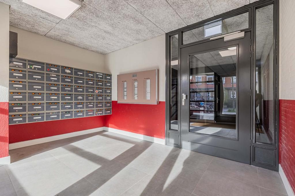 Het appartementencomplex heeft een centrale entree naast het parkeerterrein van het gebouw. De centrale portiek is afgesloten en heeft een bellenplateau. De centrale hal geeft toegang tot het trappenhuis en de lift. De gangen zijn onlangs voorzien van nieuwe PVC-vloerafwerking.