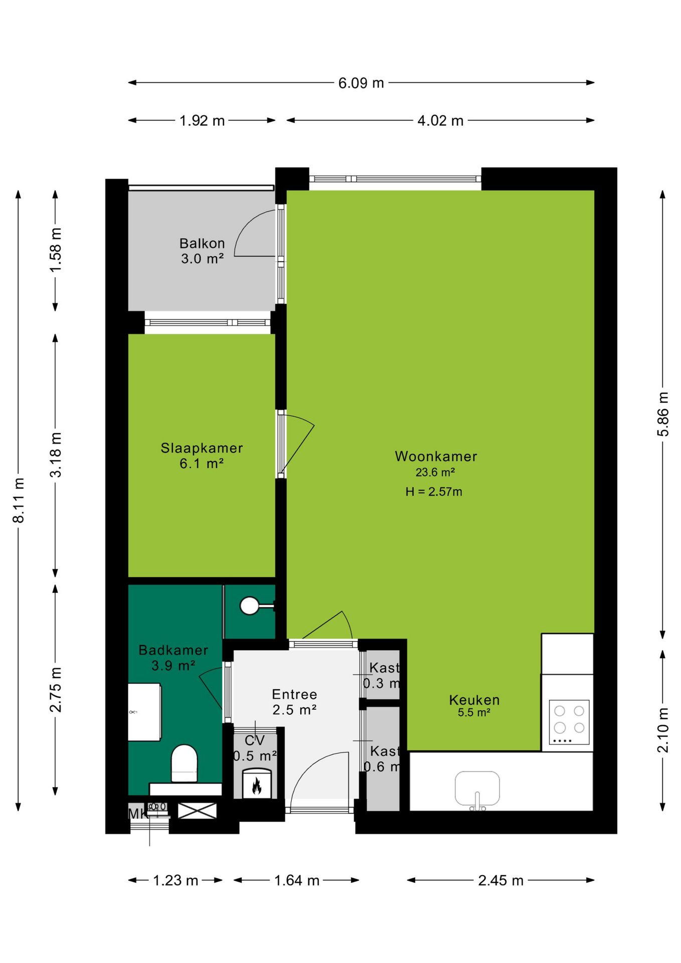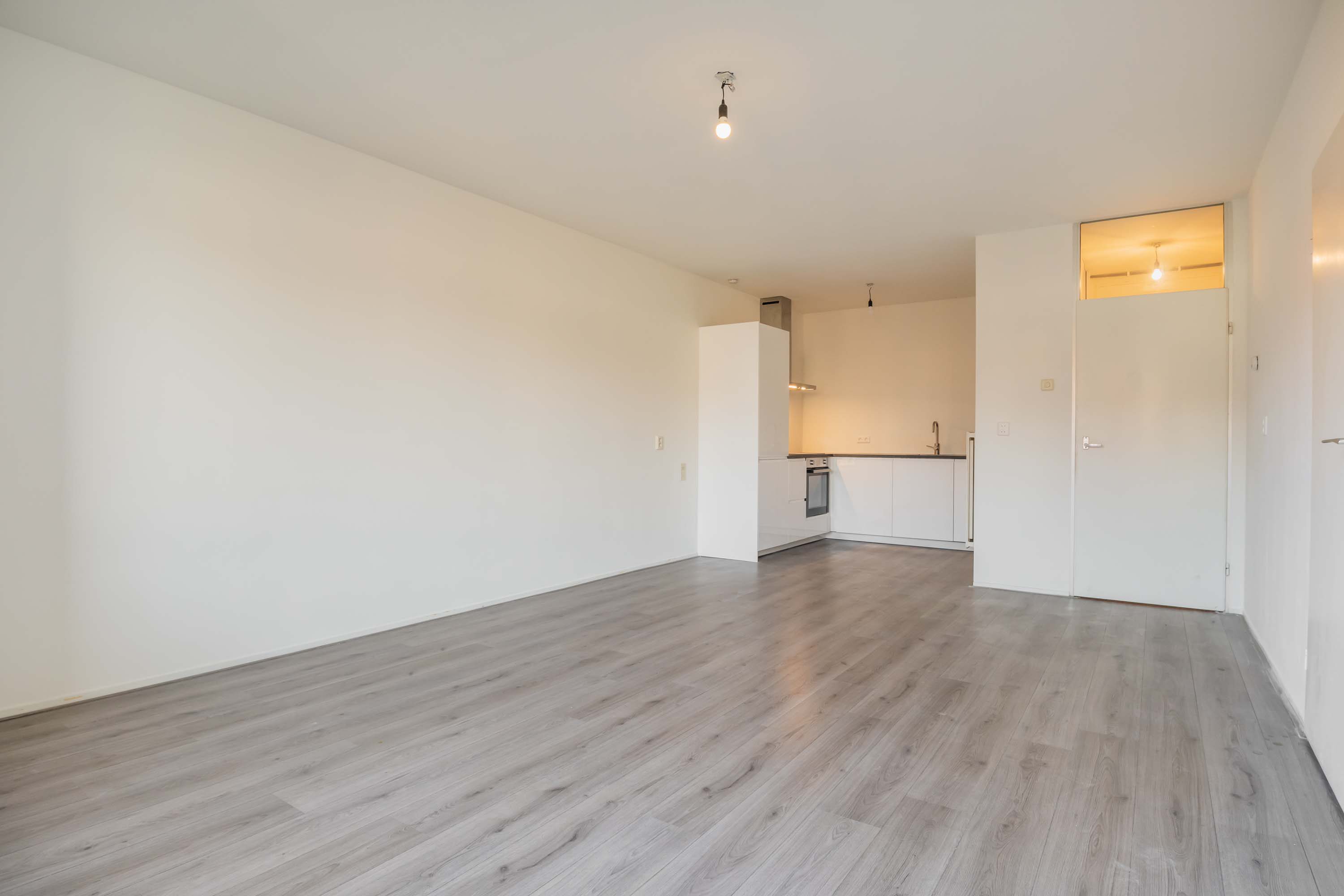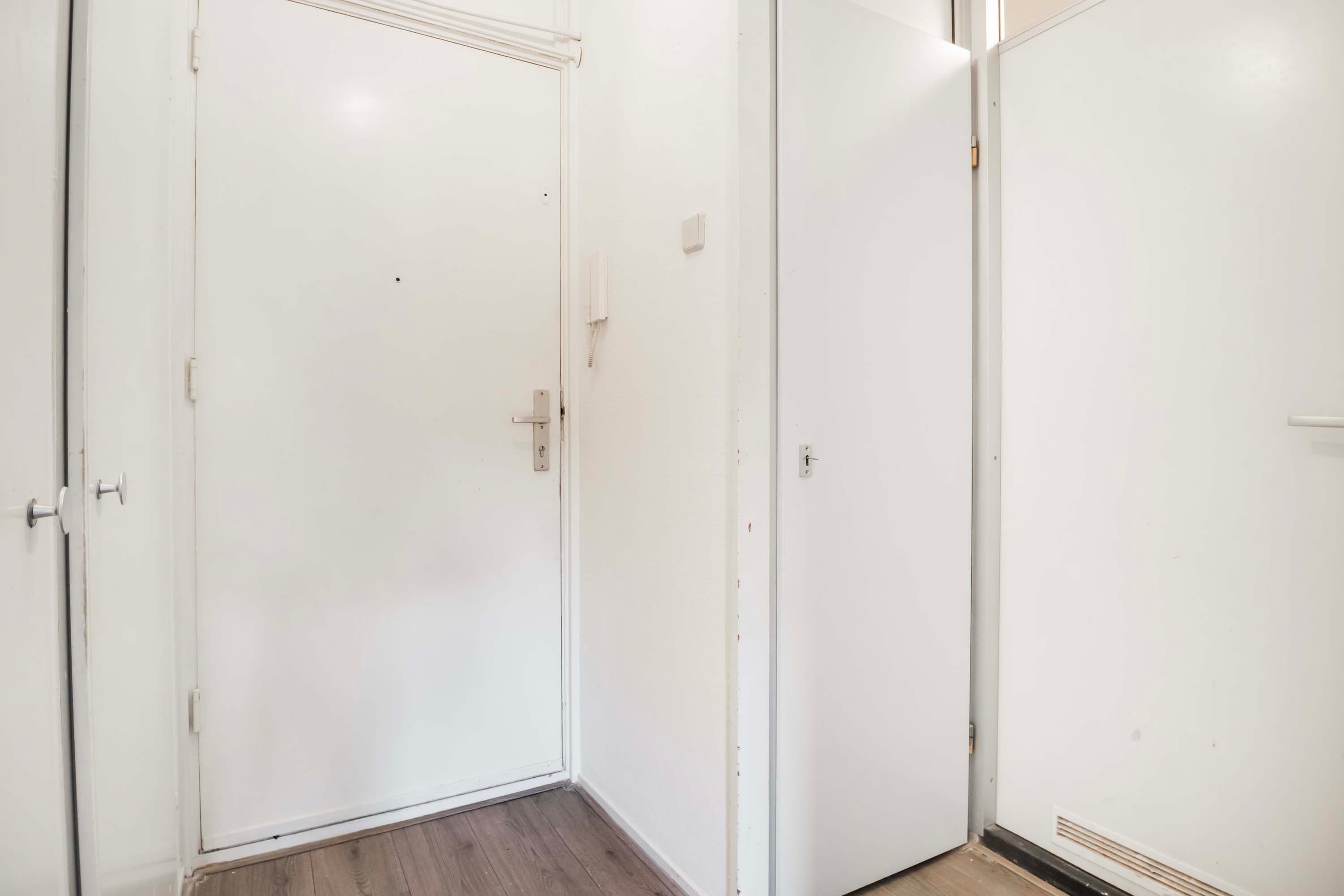 Entree/hal met toegang tot een kast met de opstelling voor de CV-ketel, 2 bergkasten en de woonkamer met open keuken. De grote raampartijen zorgen voor veel licht in het appartement.