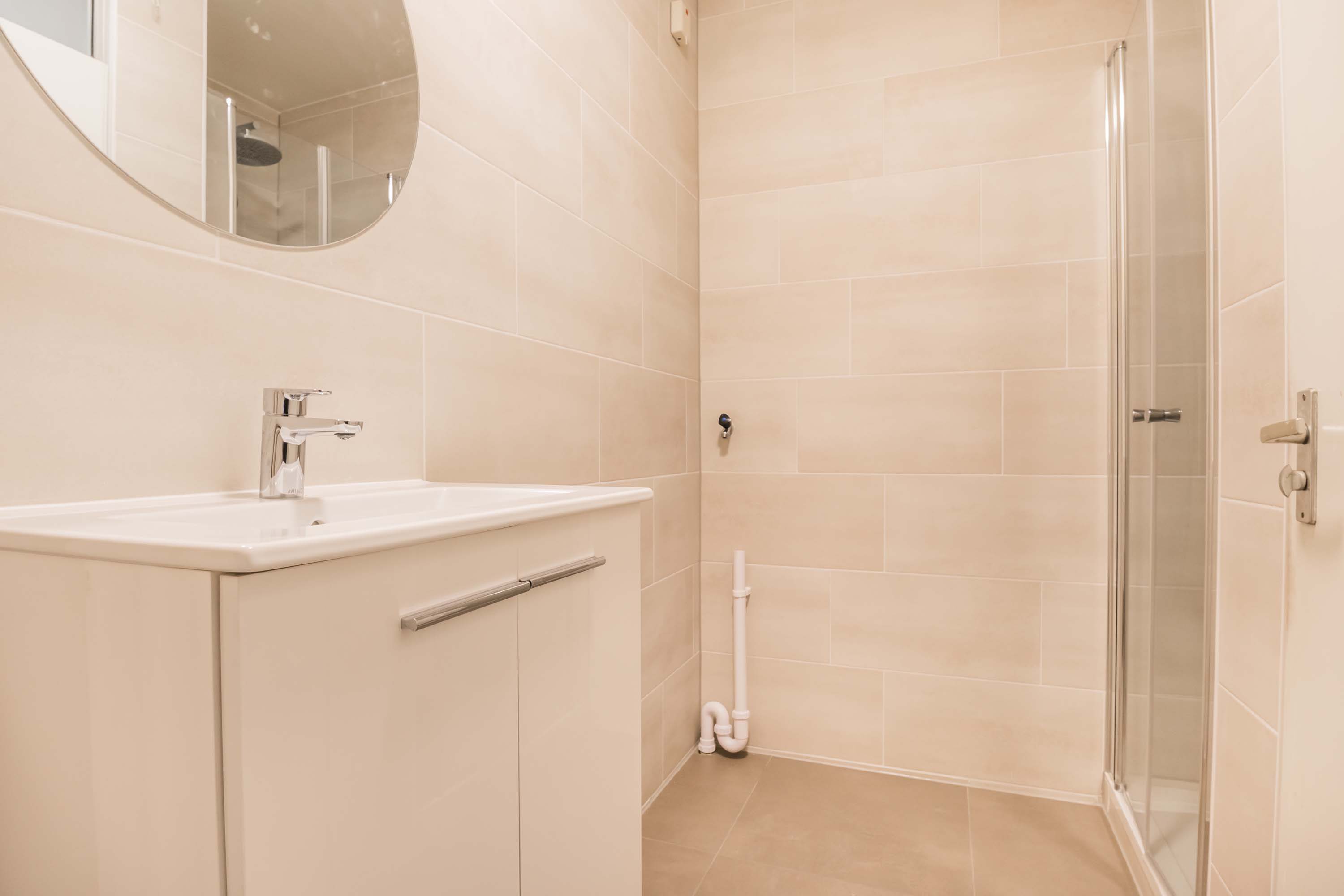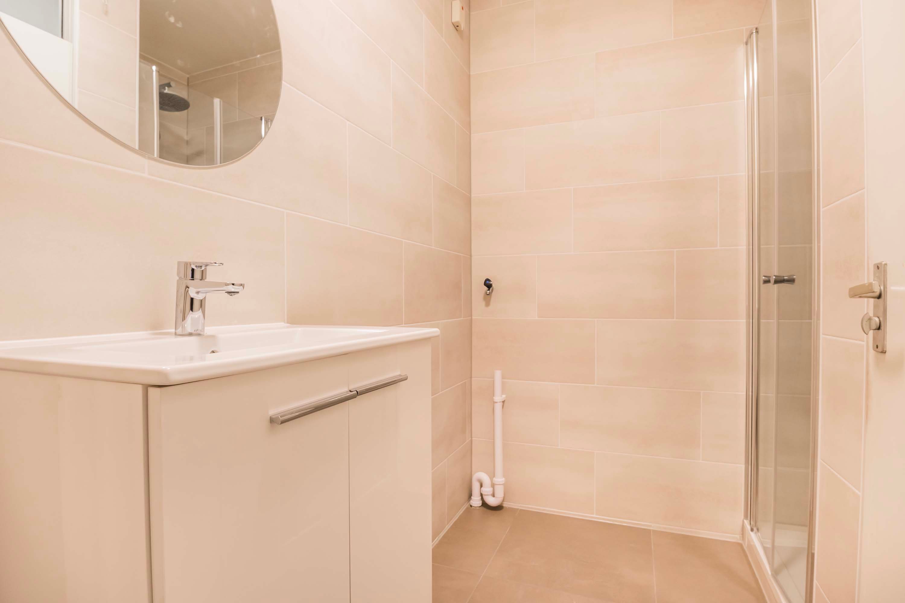 De volledig betegelde badkamer is vernieuwd in 2025 en is bereikbaar vanuit de hal van het appartement. De badkamer is voorzien van: