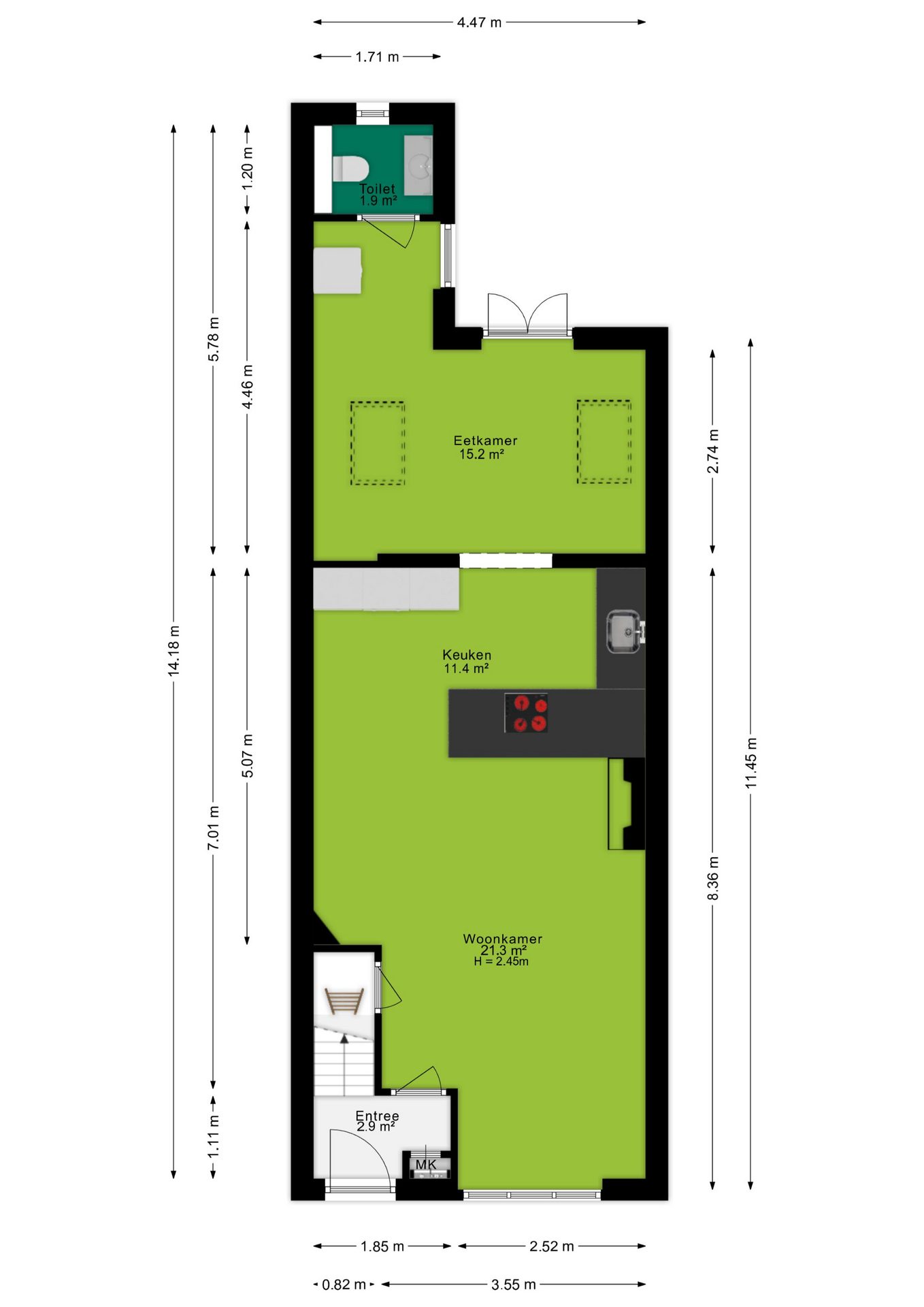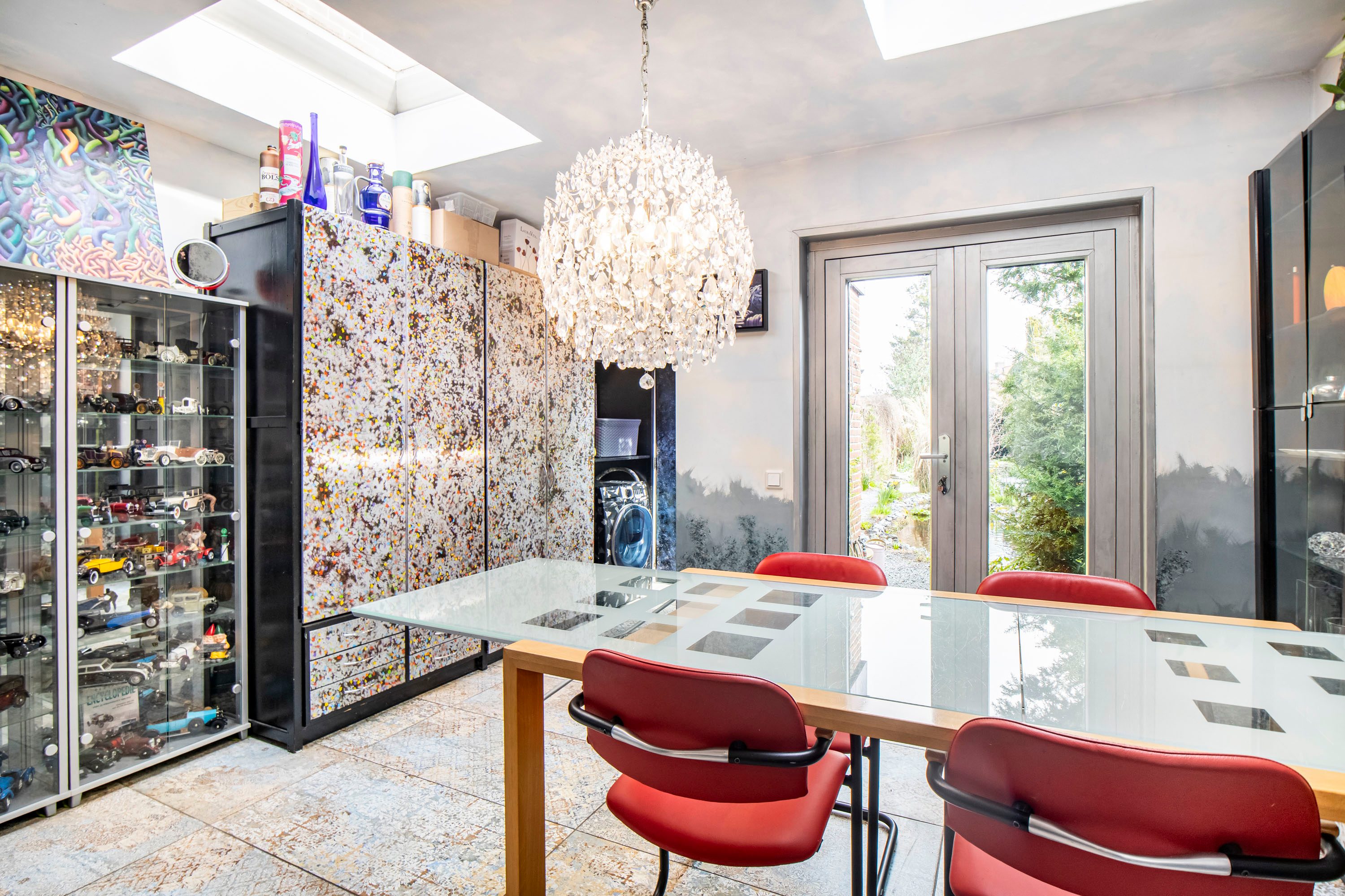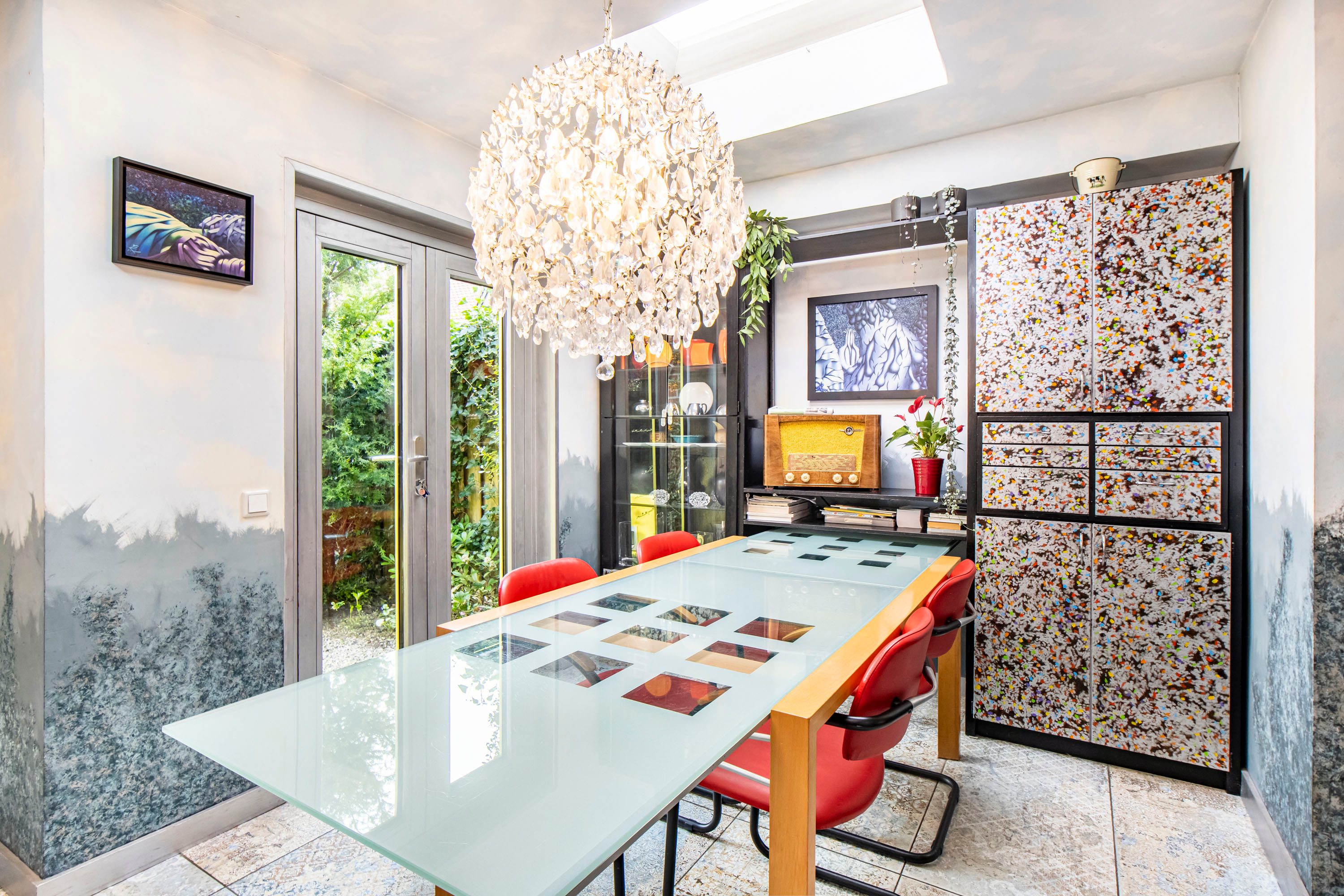 Aan de achterzijde bevindt zich de eetkamer met zicht op de tuin. Hier is een prettige verbinding tussen binnen en buiten. Het toilet is eveneens aan de achterzijde gesitueerd.