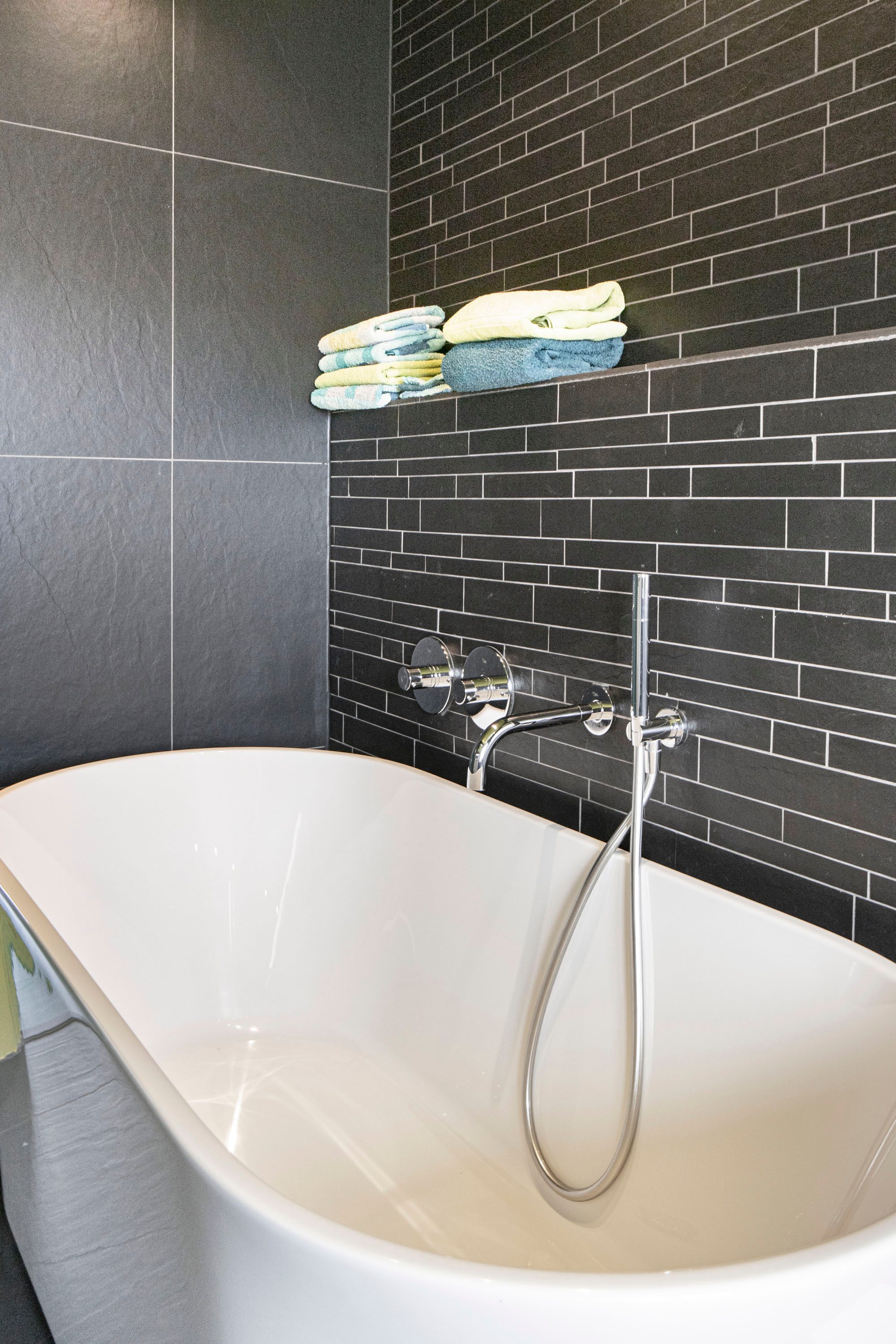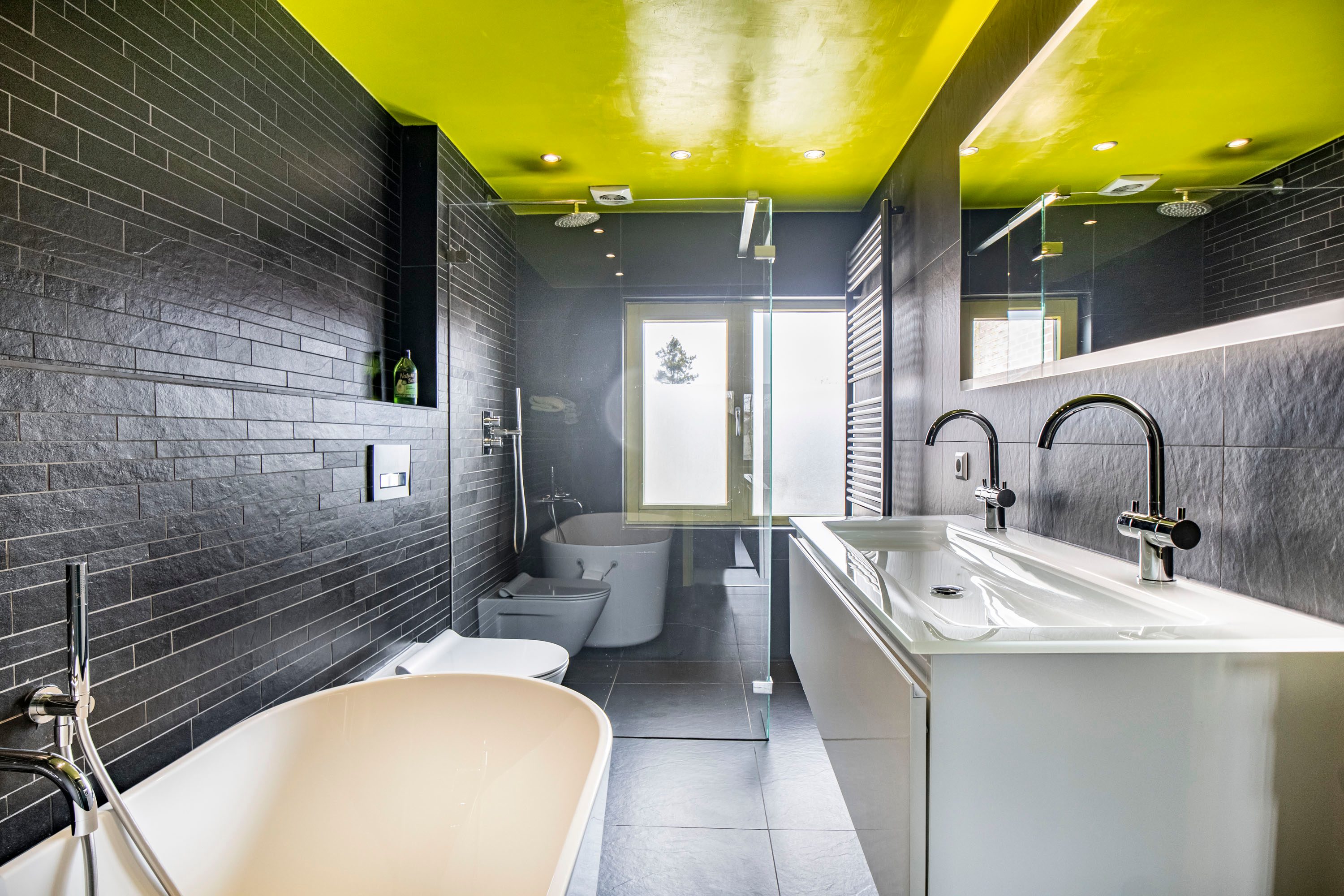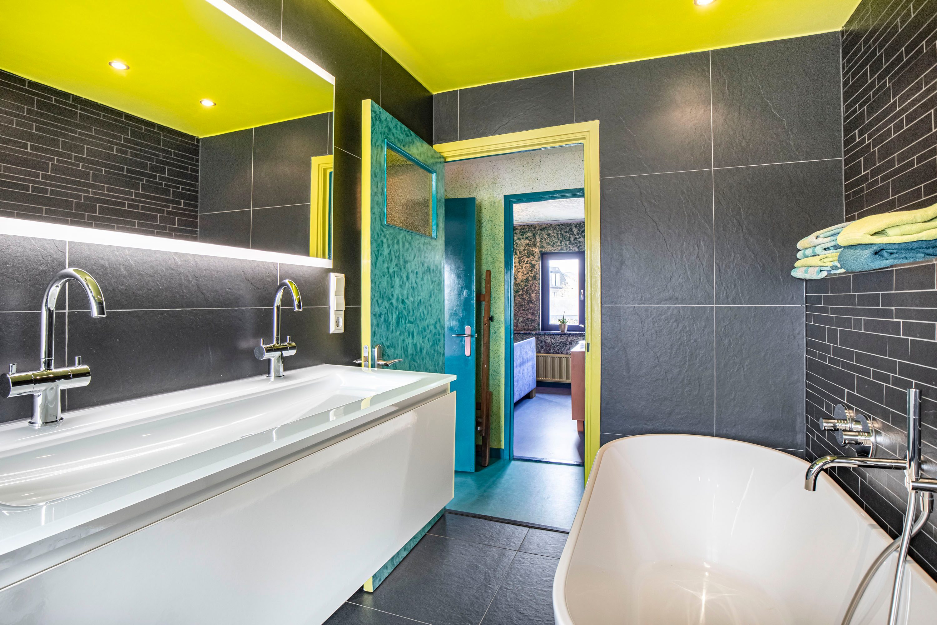 De badkamer is ruim en compleet uitgevoerd met een ligbad, inloopdouche en dubbele wastafel.
