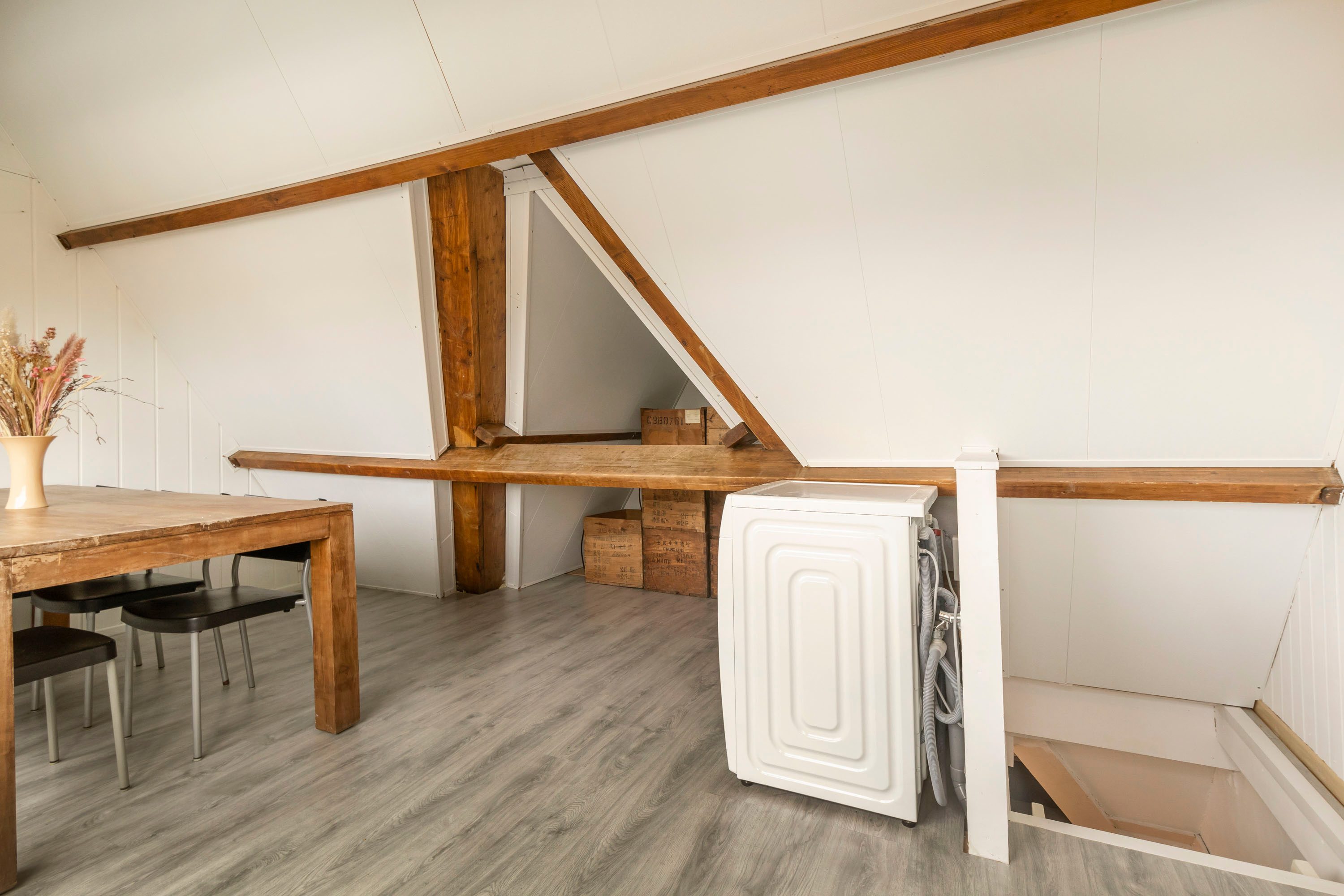 De tweede verdieping is net afgewerkte open ruimte. Dankzij de dakkapel is dit een lichte en praktische verdieping en is er veel ruimte ontstaan. De ramen zijn voorzien van zonwerend glas waardoor de warmte buiten wordt gehouden. Er is bergruimte achter de knieschotten en een aansluiting voor de wasmachine aanwezig.