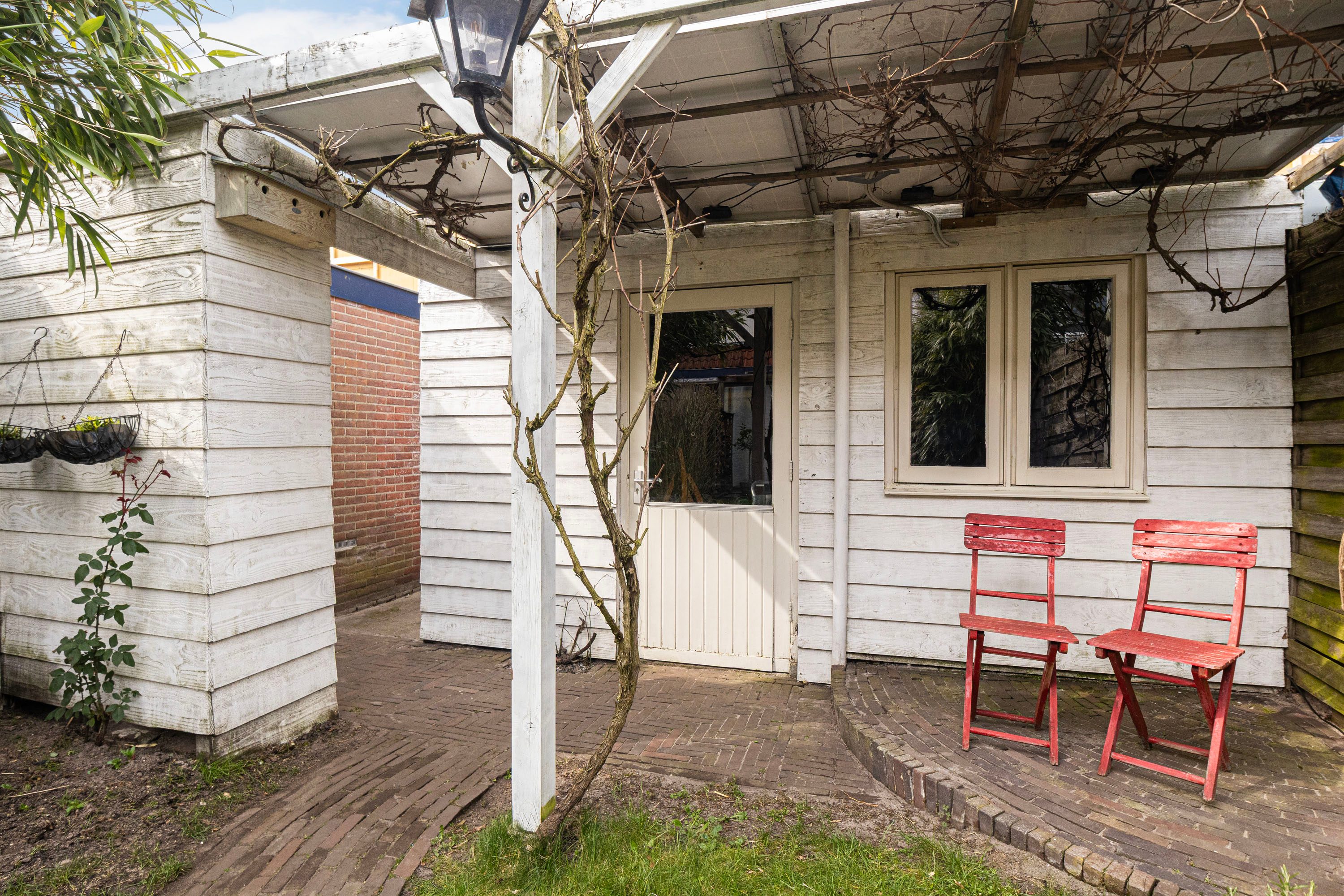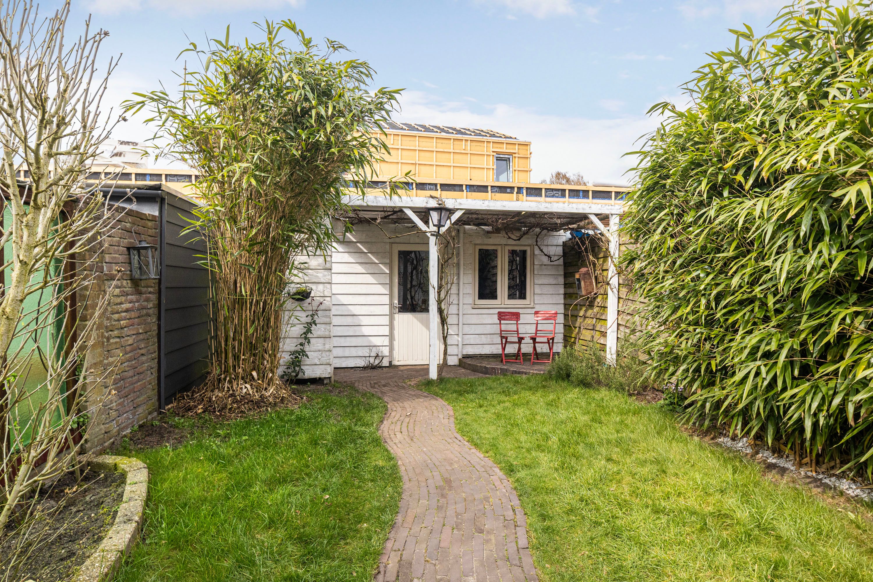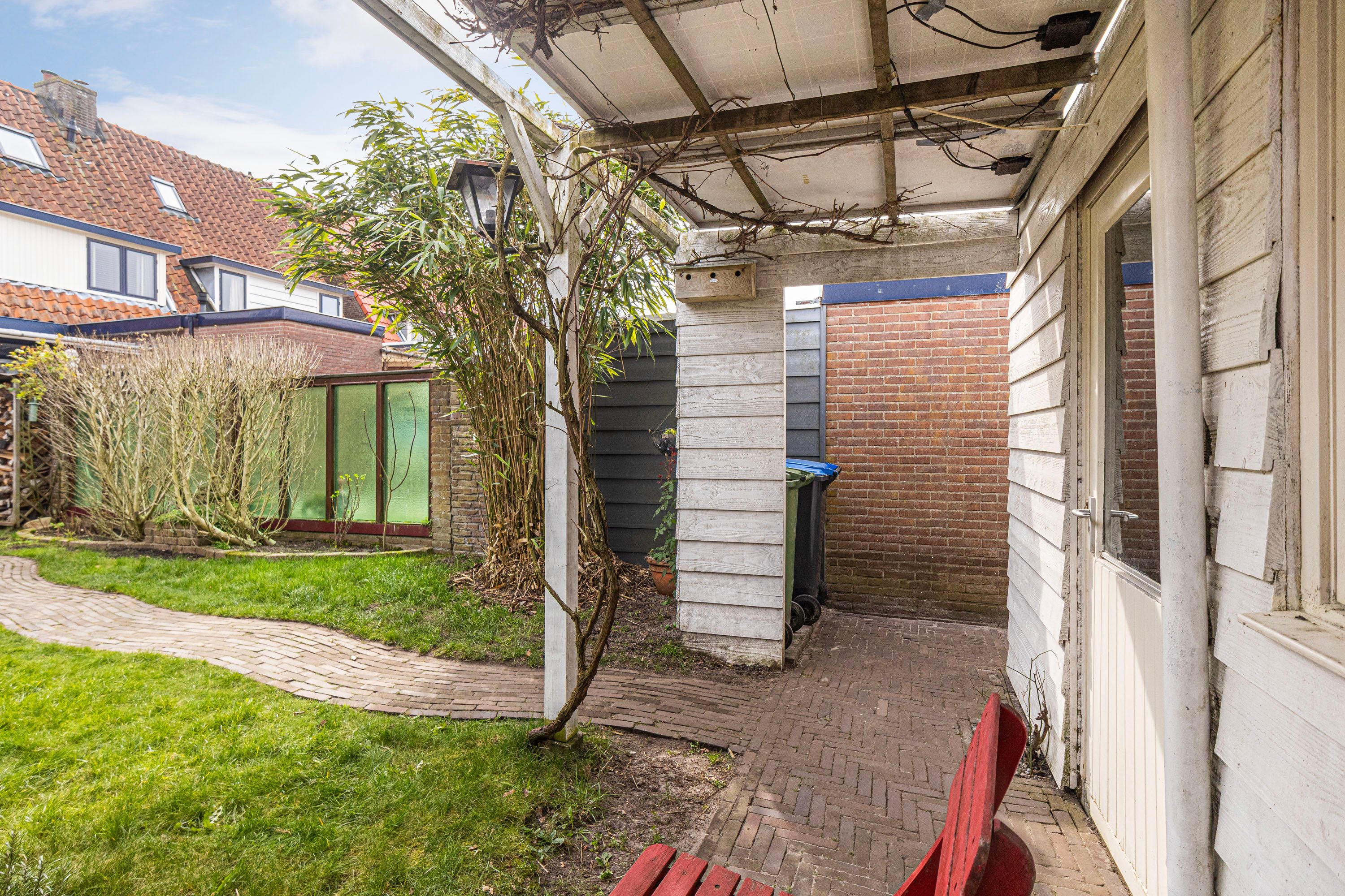 De achtertuin is gelegen op het noordwesten en is voorzien van een houten berging en een achterom. Het vele groen en de diepte van de achtertuin maken het een zeer aangename plek om te zitten. Je hebt veel privacy en de tuin is bereikbaar middels een achterom. Achter de woning wordt een kleinschalig nieuwproject gerealiseerd met enkele nieuwbouw woningen.