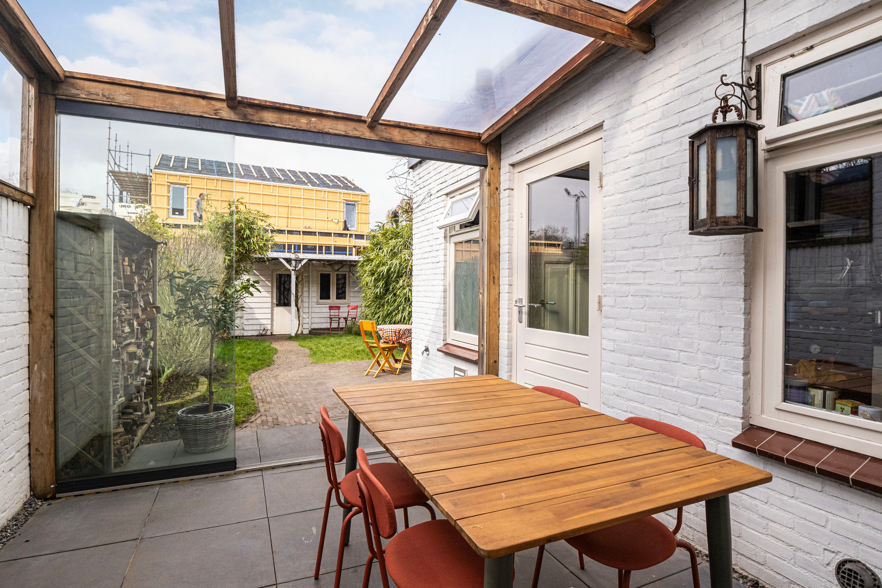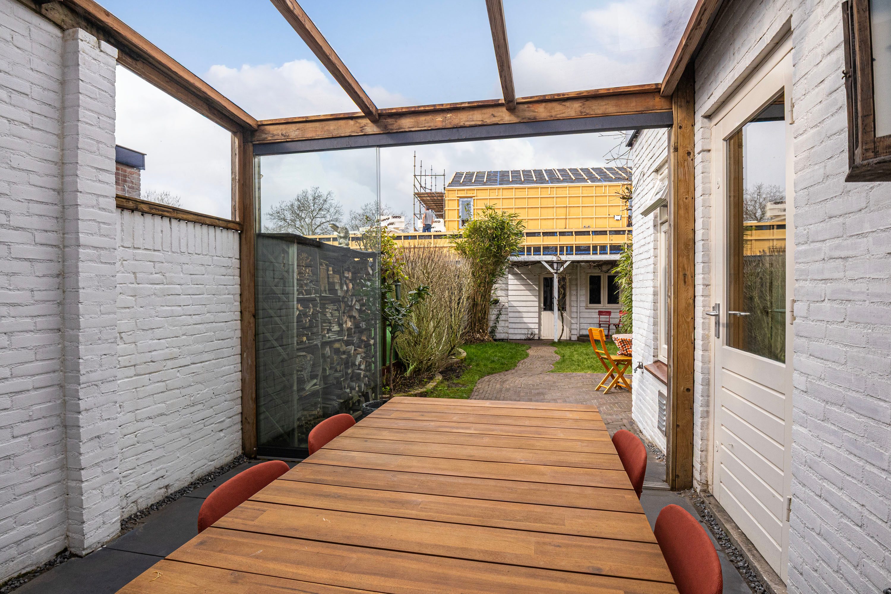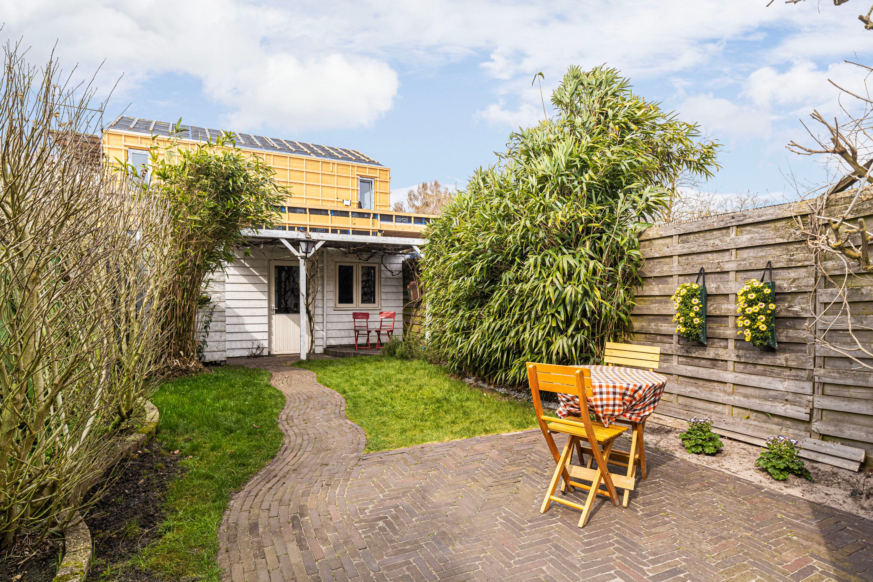 De achtertuin is gelegen op het noordwesten en is voorzien van een houten berging en een achterom. Het vele groen en de diepte van de achtertuin maken het een zeer aangename plek om te zitten. Je hebt veel privacy en de tuin is bereikbaar middels een achterom. Achter de woning wordt een kleinschalig nieuwproject gerealiseerd met enkele nieuwbouw woningen.