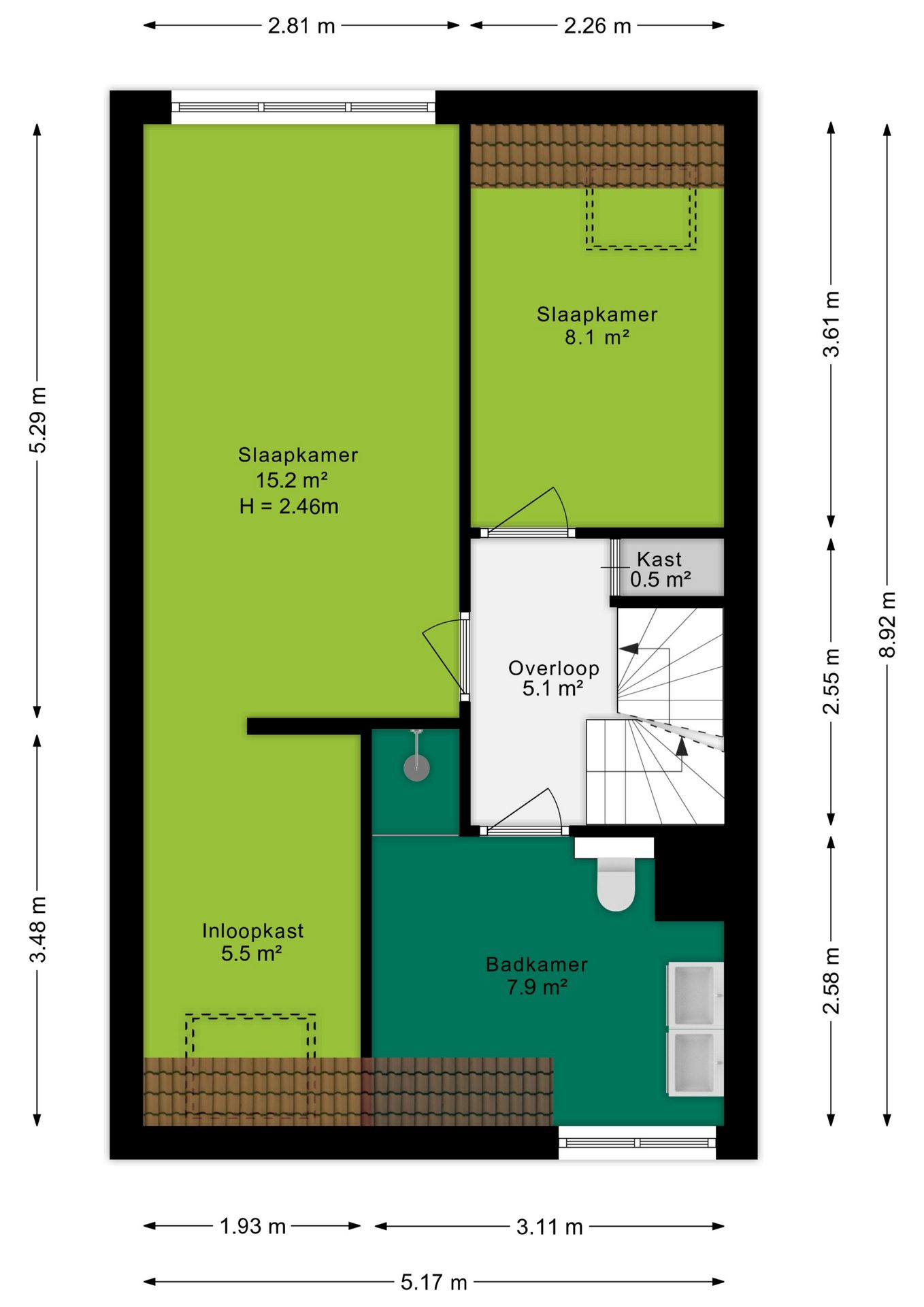 De overloop biedt toegang tot twee ruime slaapkamers. De eerste is maar liefst 15 m² groot en beschikt over een luxe inloopkast (5.5 m² groot), perfect voor het opbergen van kleding en accessoires. De tweede slaapkamer heeft een royale afmeting van 8 m² en biedt veel mogelijkheden voor inrichting. Daarnaast beschikt de eerste verdieping over een extra bergruimte, ideaal voor het opbergen van spullen.